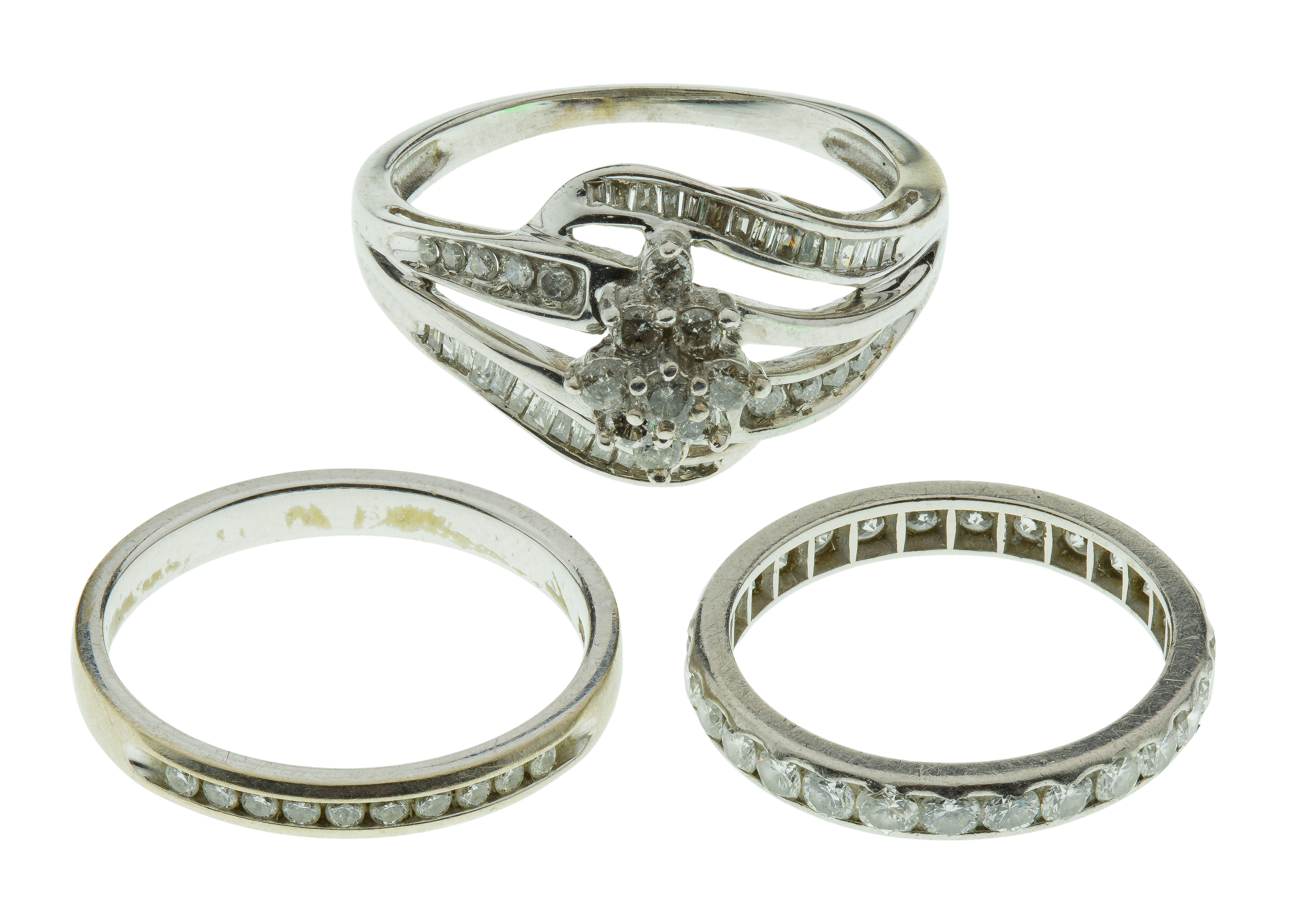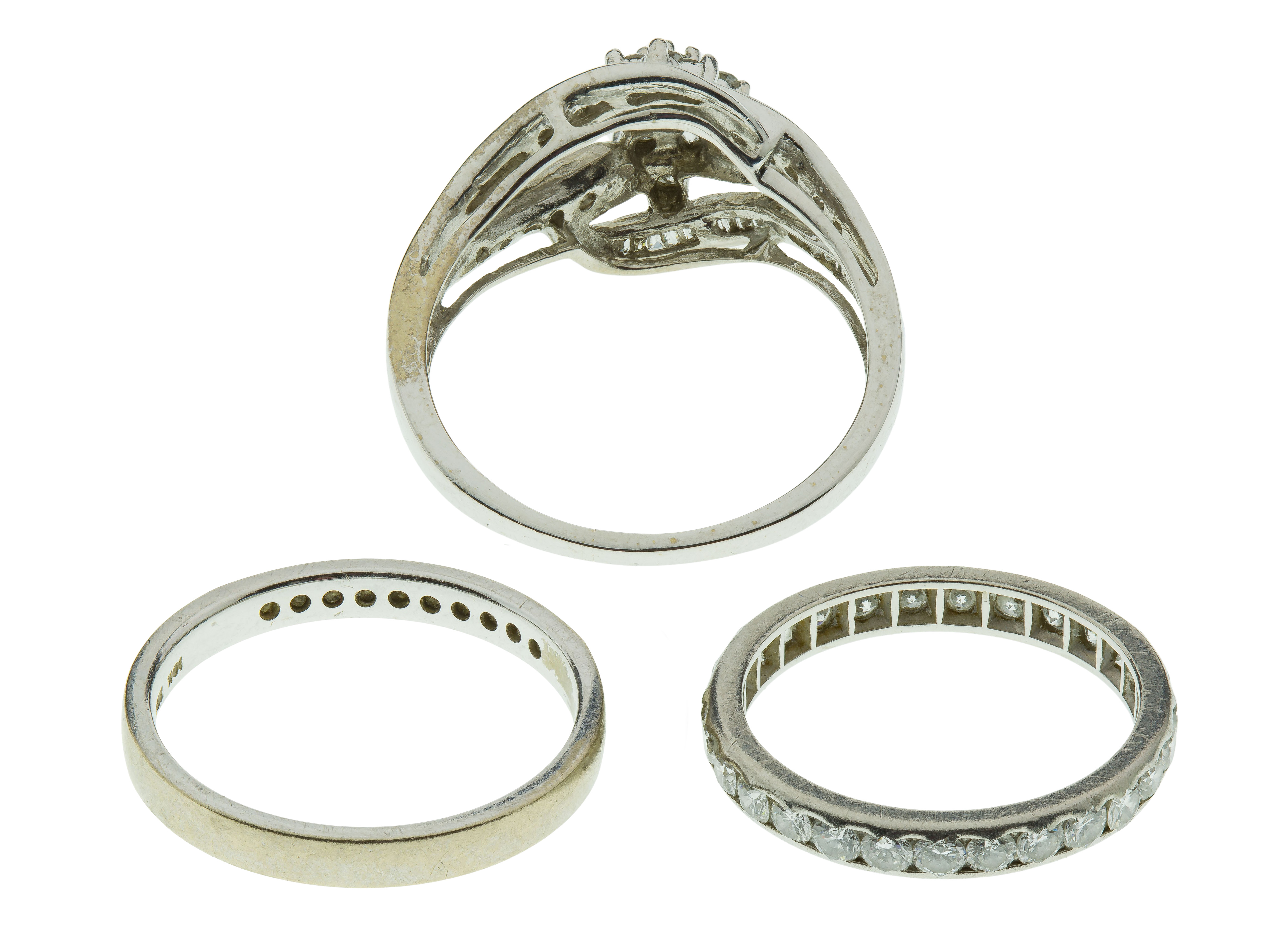 (3) items including a diamond eternity band (unmarked palladium) as well as a diamond accented dome style cocktail ring and a diamond accented band (marked ’10k’)