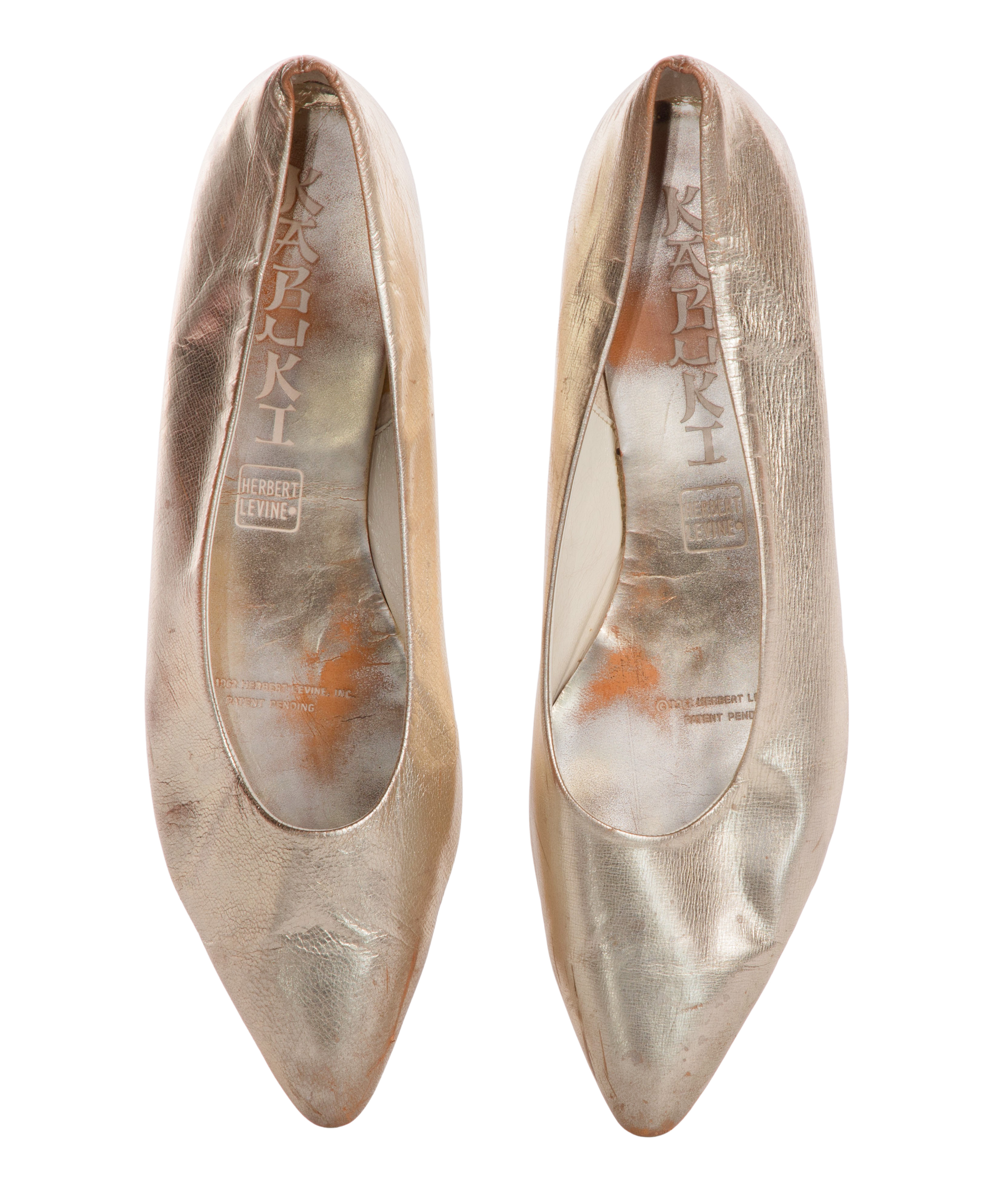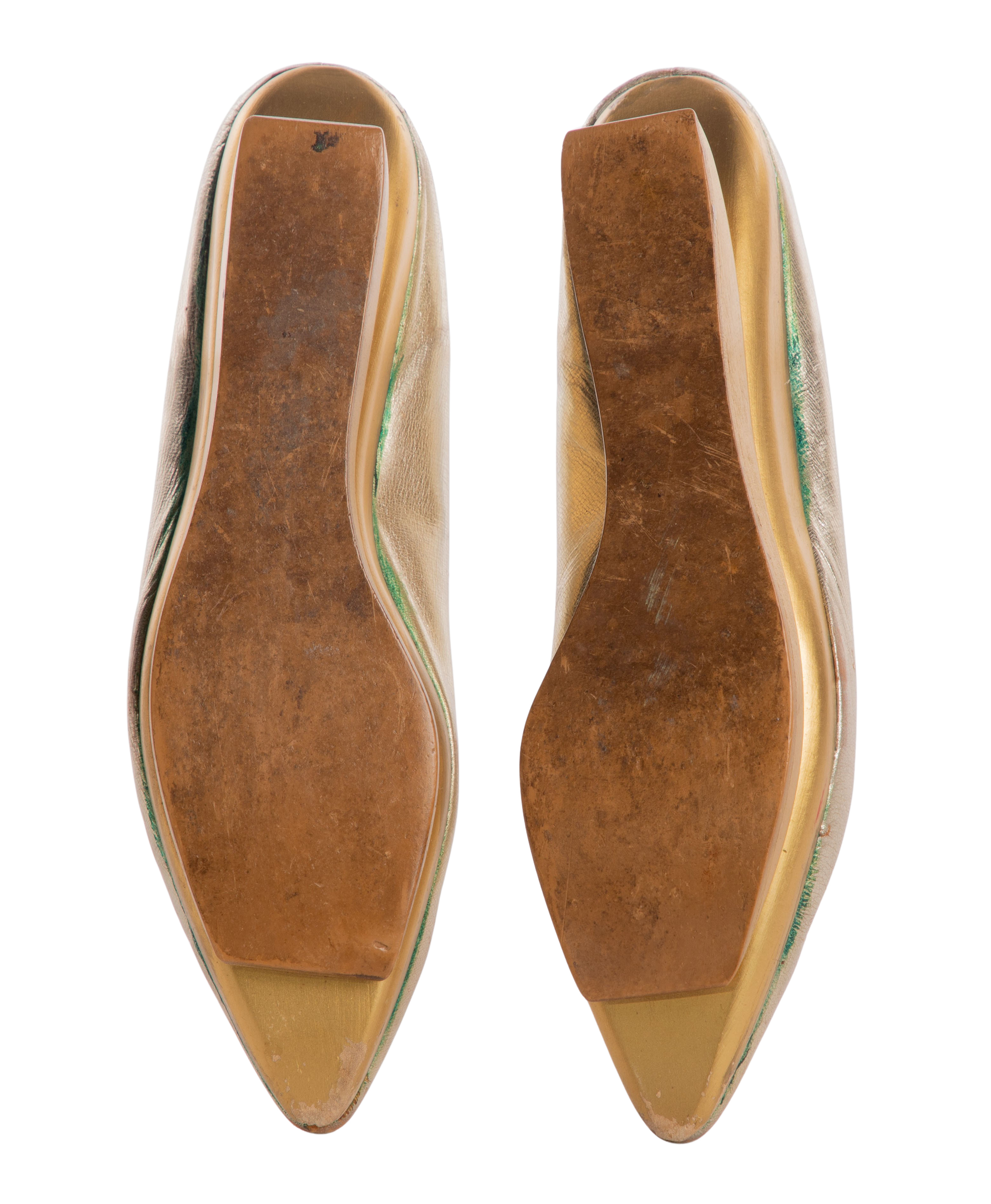The pair having gold-tone leather uppers on leather soled gold-tone painted wood platforms having cantilevered heels and toes, white leather interiors, gold-tone leather insoles having imprinted white ‘Kabuki’, the maker mark in a square and patent pending notation, the right shoe having a hand-written ink notation ‘A 15 8 1/2 N’ at upper edge of interior leather, in original box