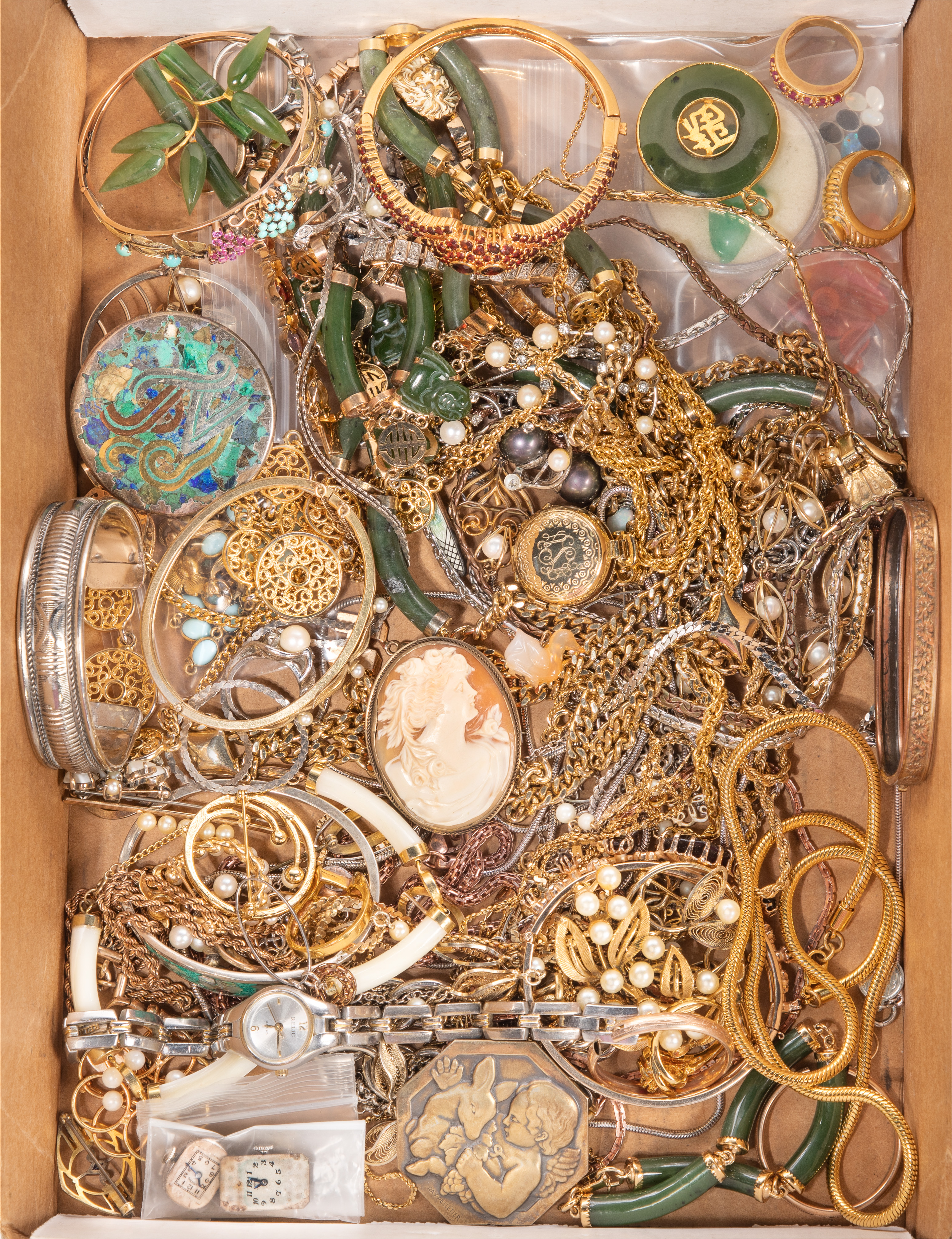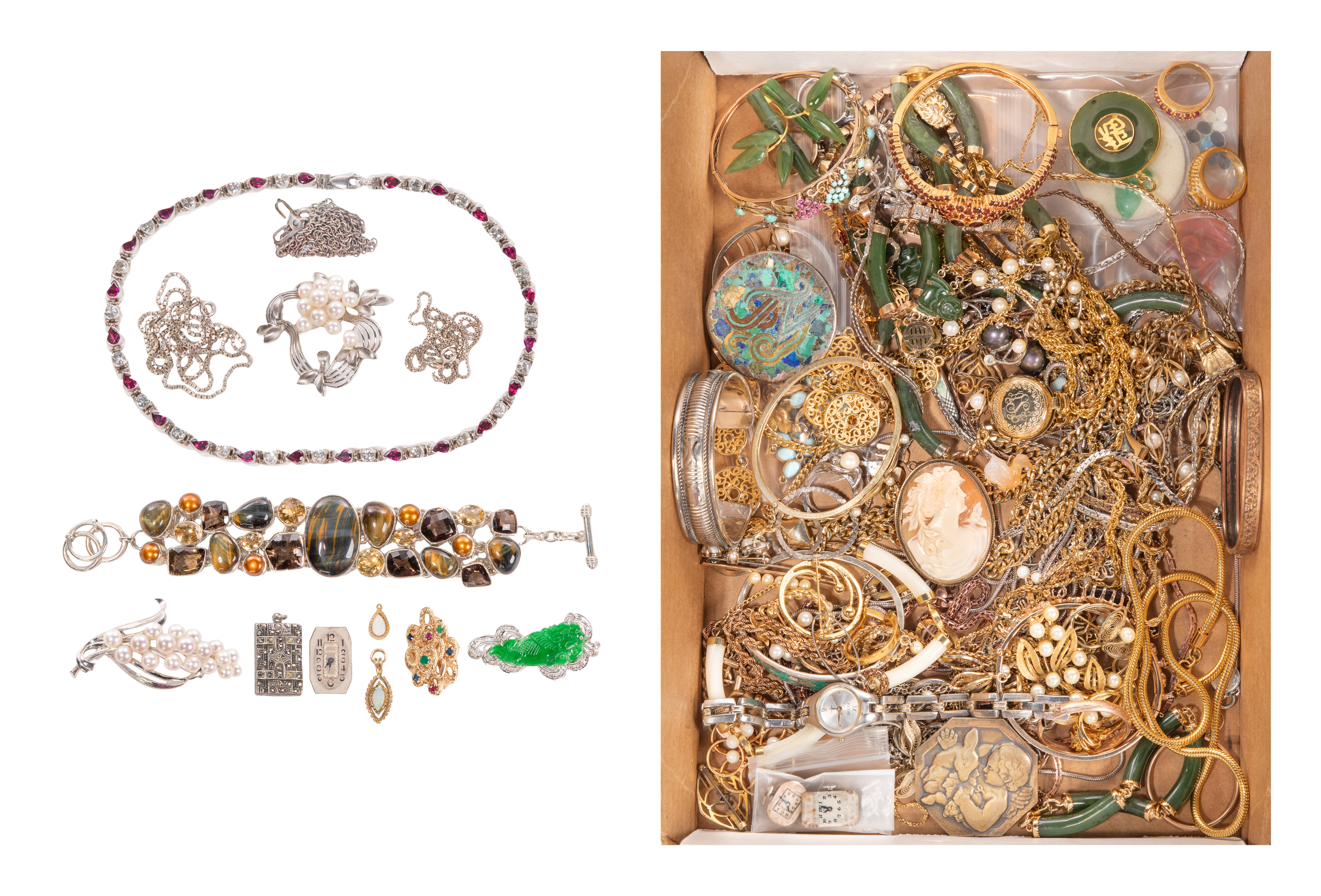(12) items including (2) pins / pendants and (3) pendants (most marked ’14k’) as well as bracelets, necklaces and pins (most marked ‘925’) and approximately (2) pounds of fashion jewelry, bracelets, earrings watches, pins and necklaces