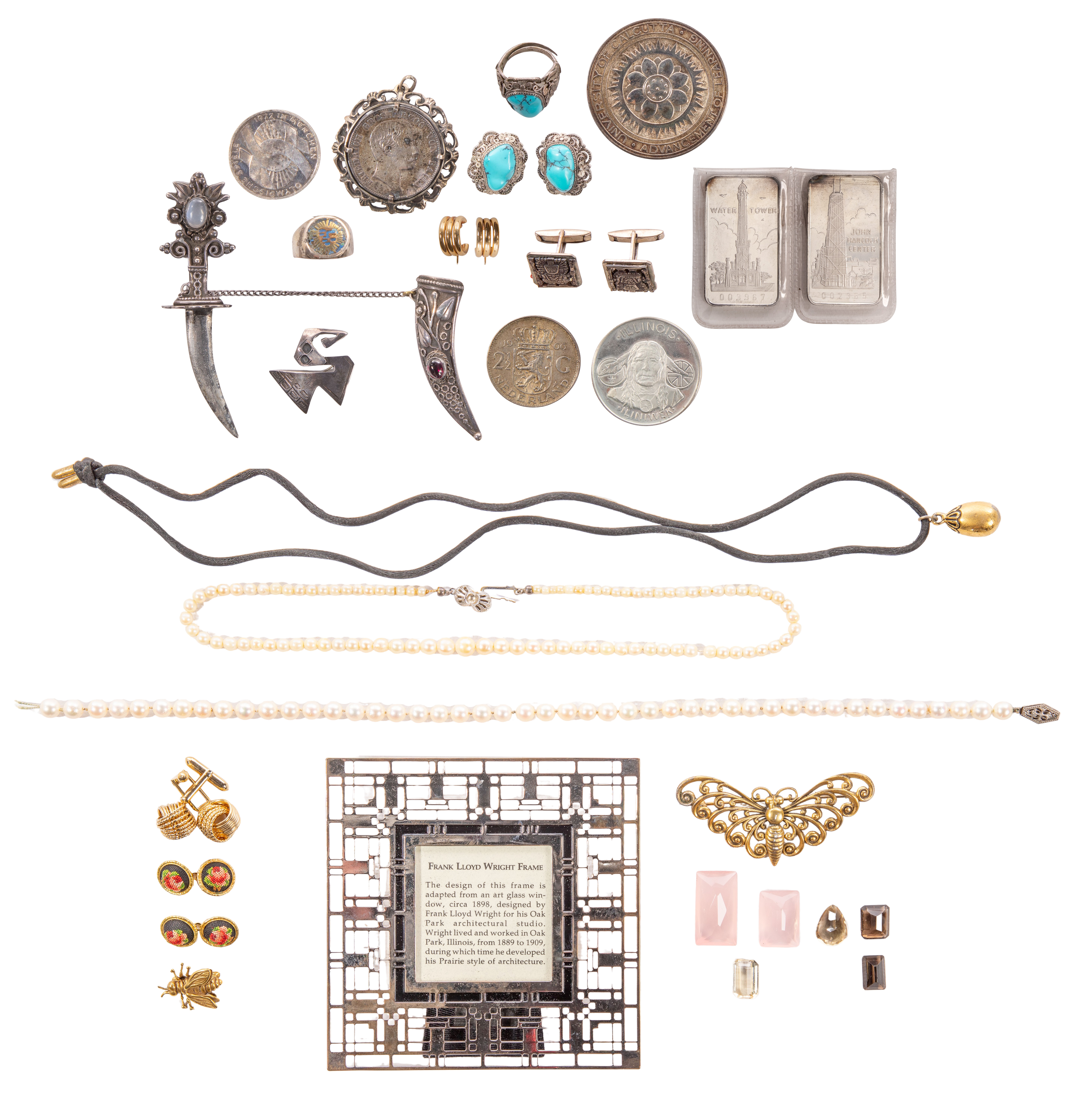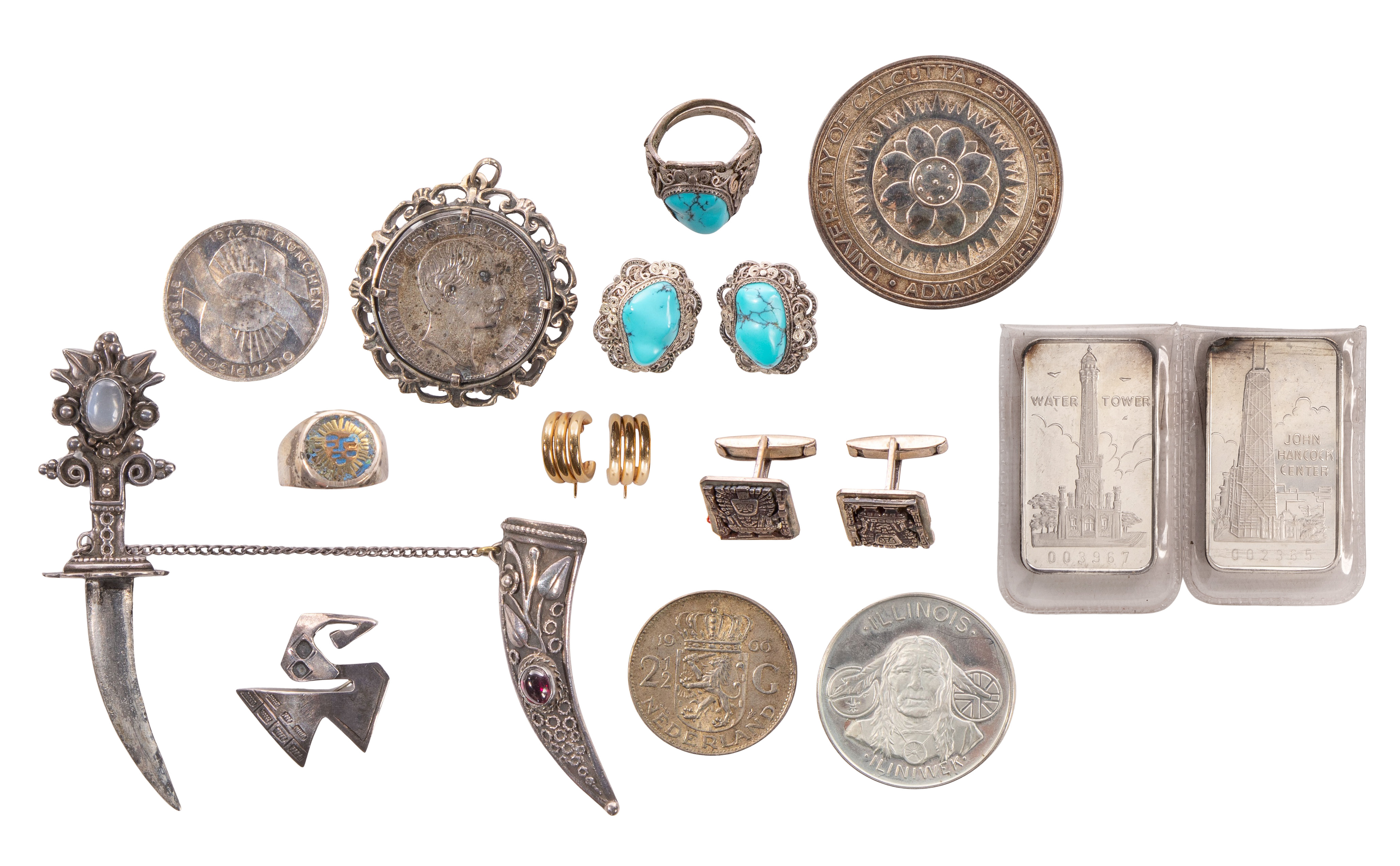 Approximately (25) total items including a pair of hoop style pierced earrings (marked ’14k’), (2) fine silver bars (marked 0.999), a medallion and adjustable ring (unmarked silver) and pendants, rings, pins and cufflinks (most marked ‘925’); together with a few pieces of fashion jewelry, a picture frame and some loose gemstones