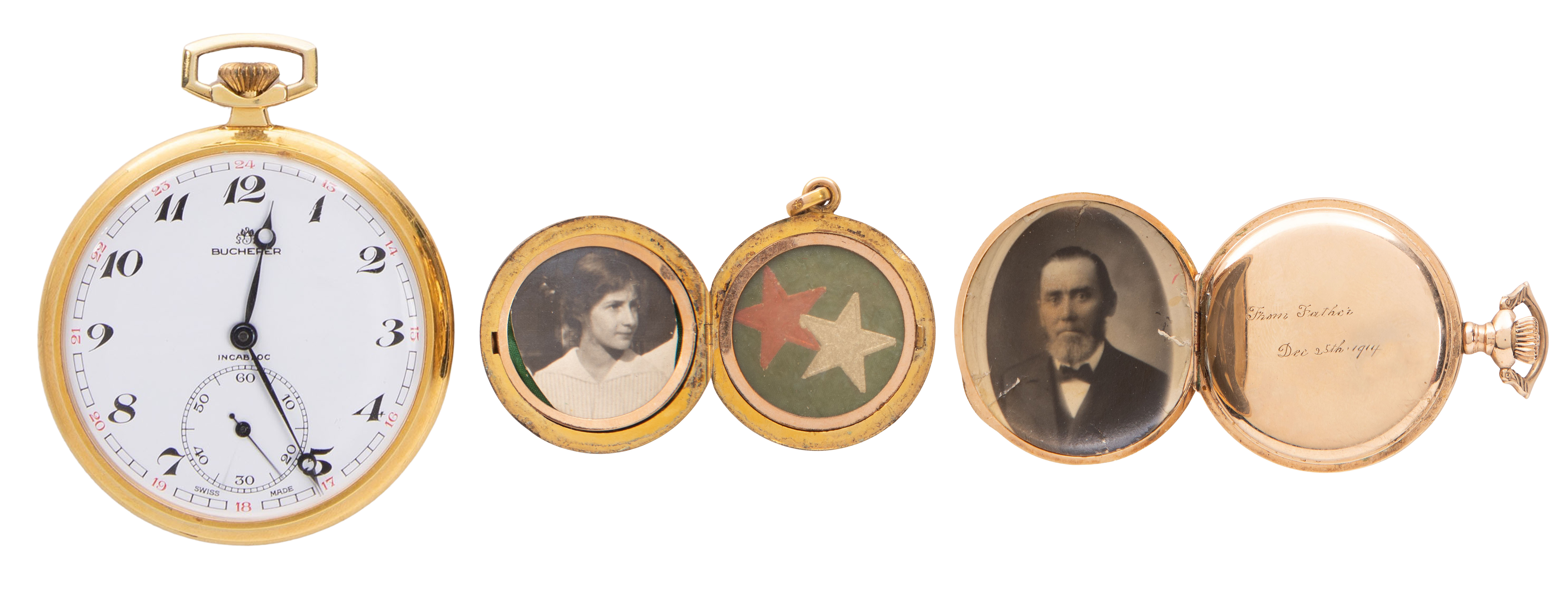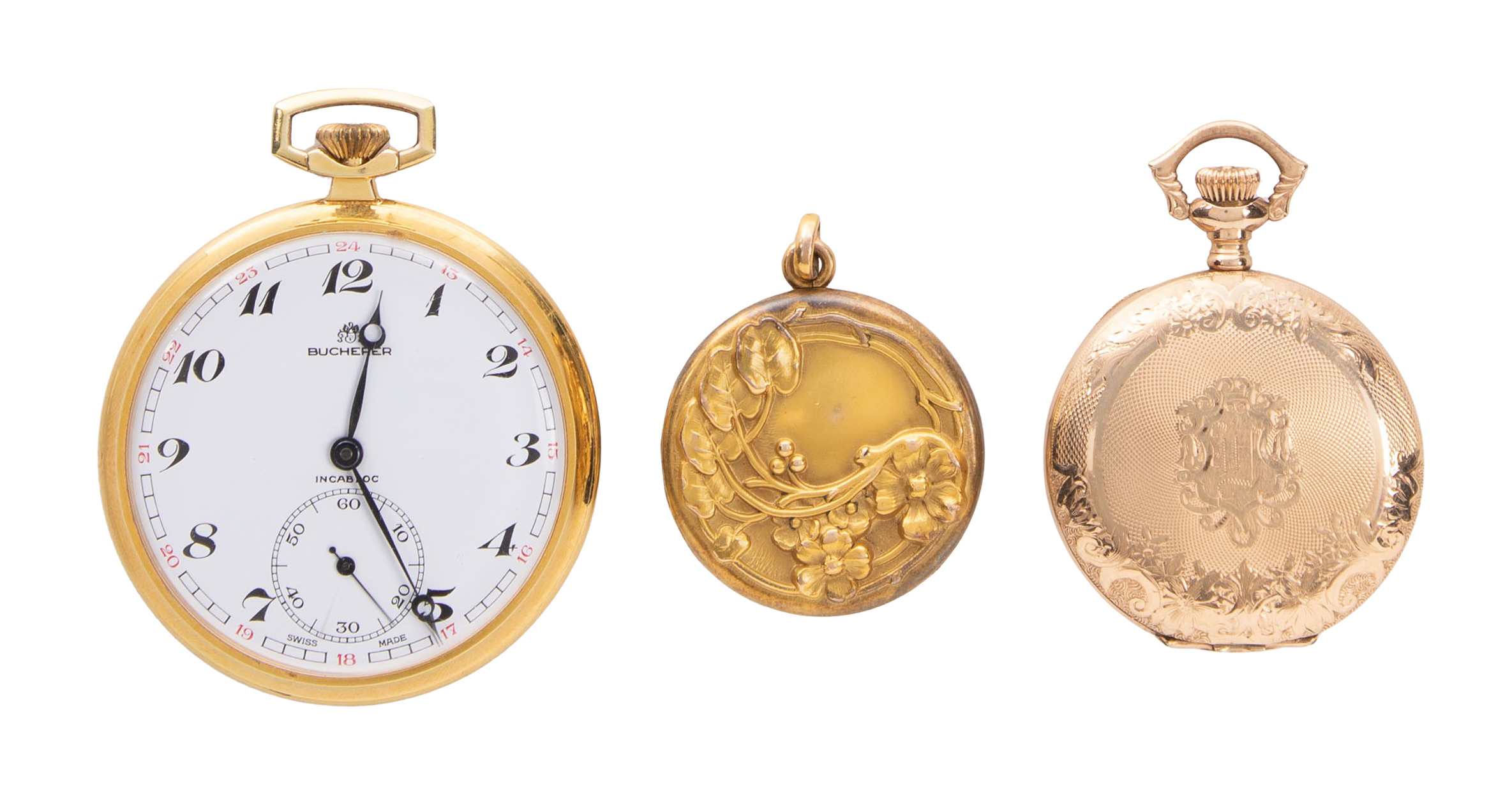 A Bucherer Incabloc pocket watch and an Elgin Junior hunter style pocket watch, (4) silver items including a mini bottle and a pair of pierced earrings (marked ‘925’), a pin (unmarked 0.900) and spoon (marked ‘800’) as well as approximately a pound of fashion jewelry