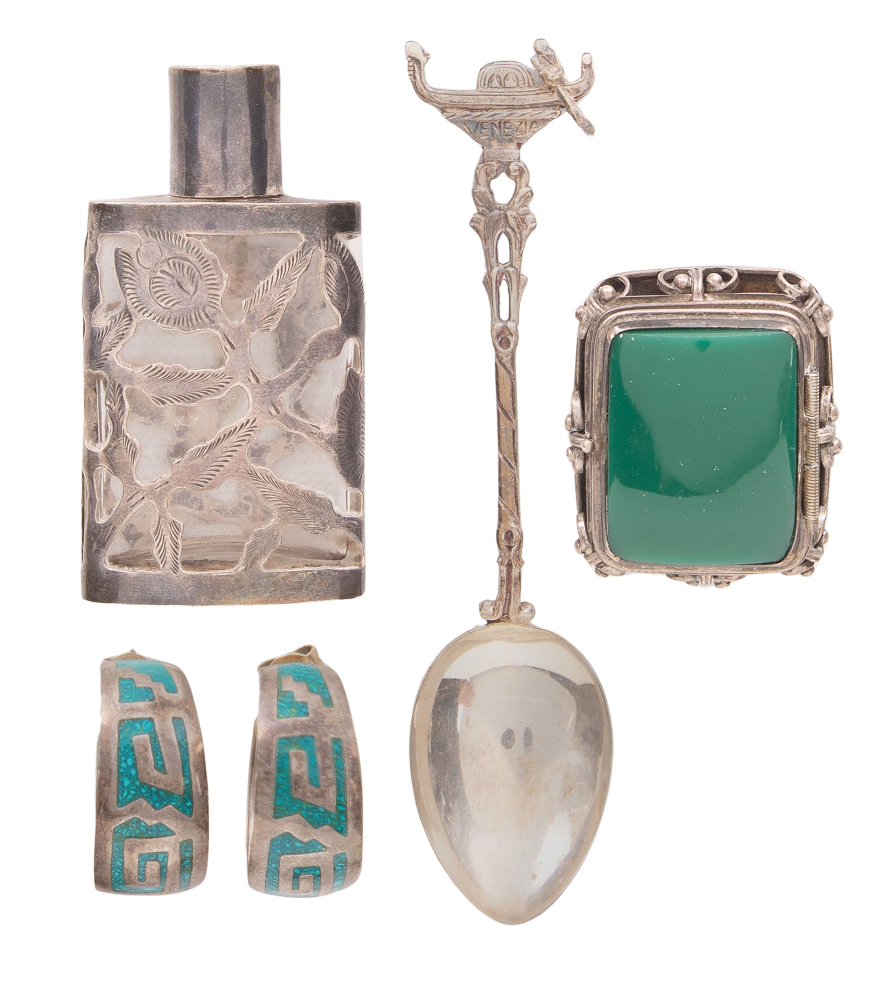 Weight: .925 silver: 1.23 ozt., .900 silver: 0.73 ozt., .800 silver: 0.29 ozt. (total including perfume bottle)