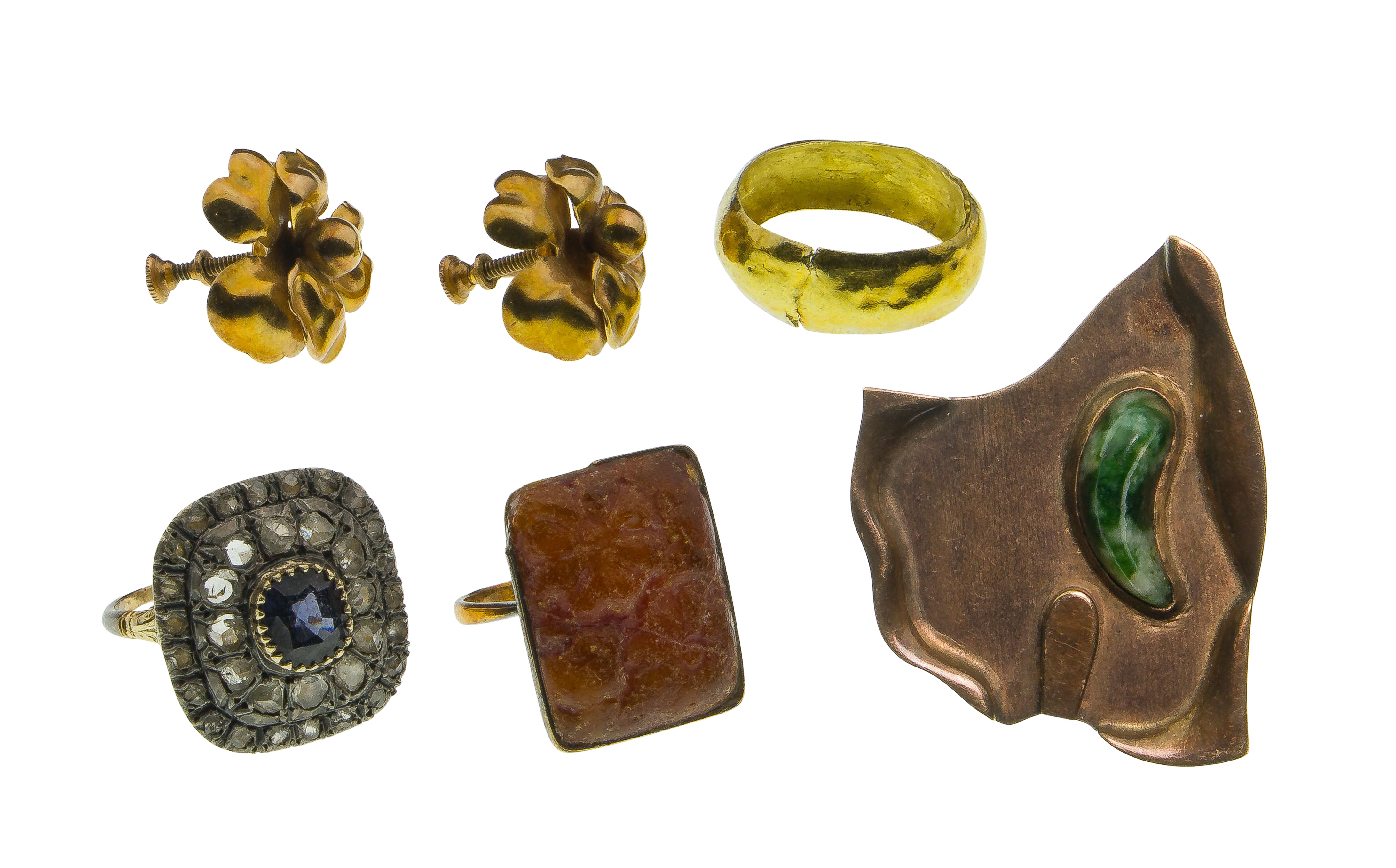 (5) items including a band style ring (unmarked 20k), a mixed metal ring having a center spinel surrounded by round cut diamond accents (unmarked 18k and 900 silver) and a pin, a pair of earrings and a carved amber ring (unmarked 10k)