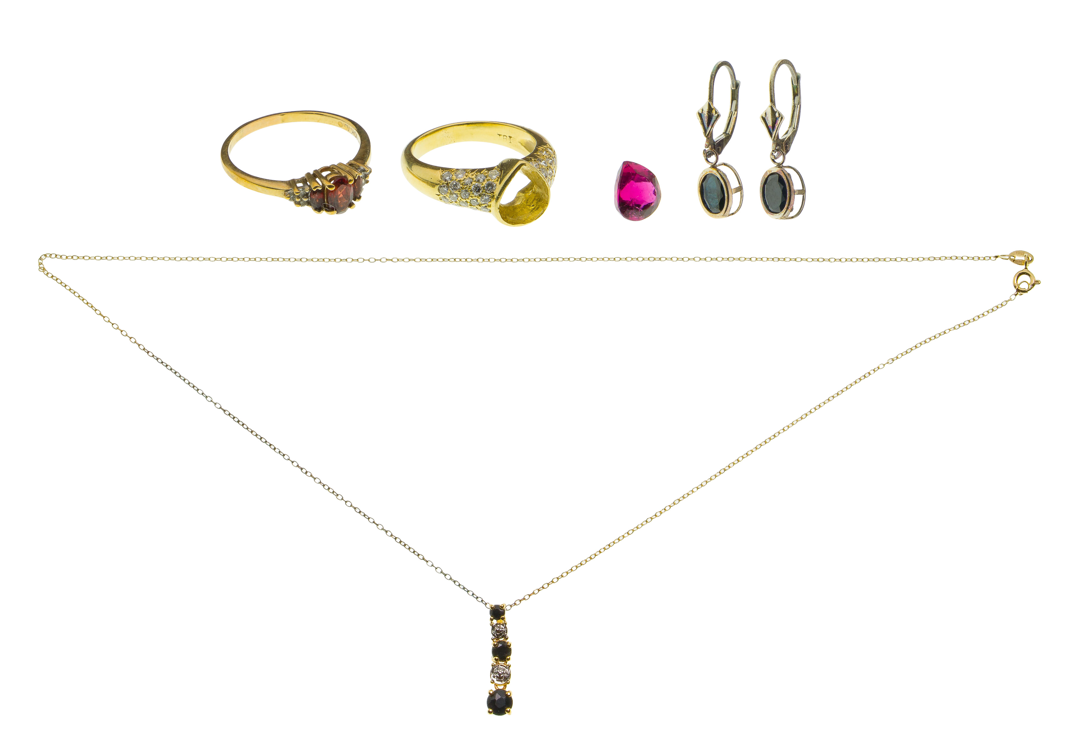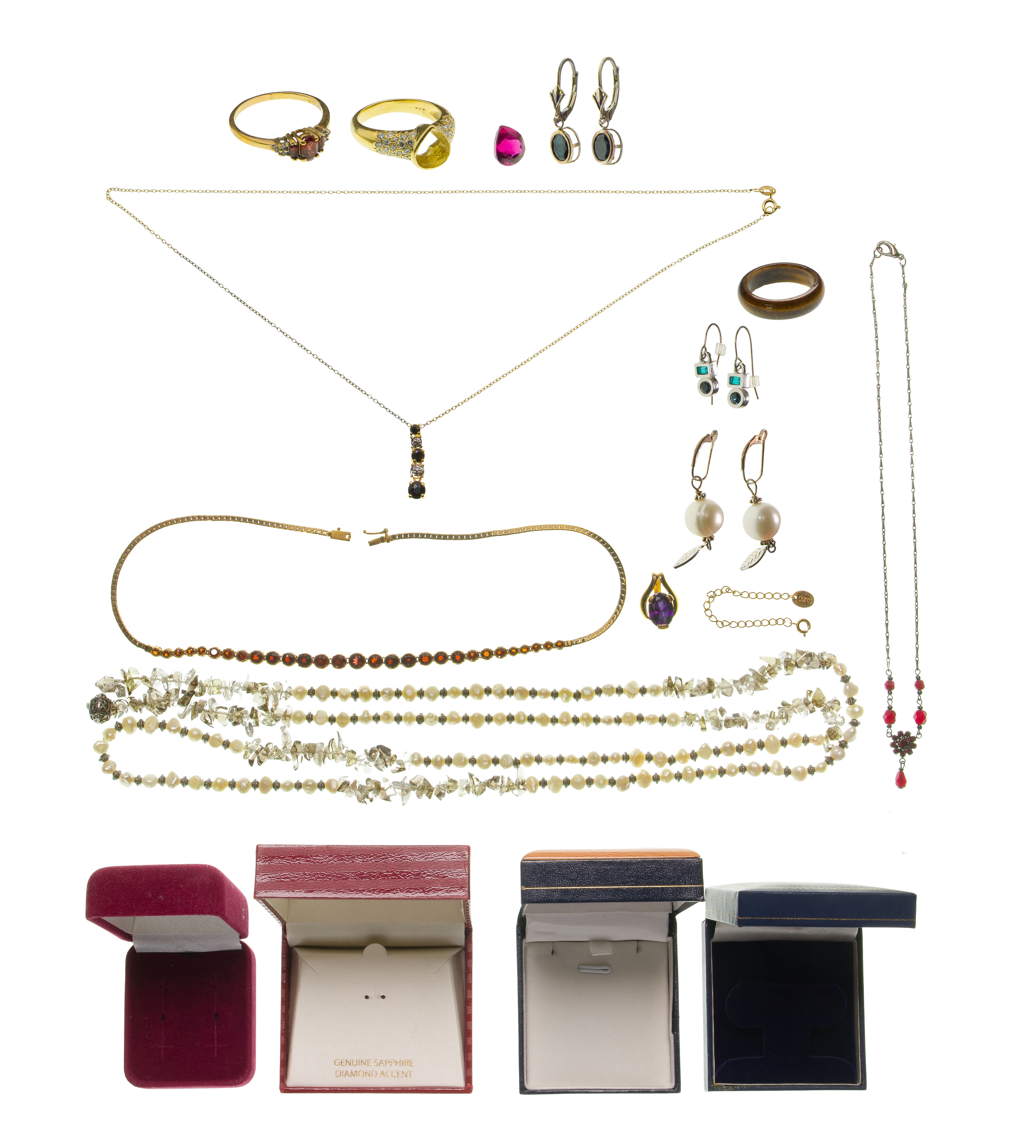 (5) items including a gemstone ring having diamond accents (marked ’18k’), a garnet ring (marked ’10k’), a necklace and a pair of pierced earrings (marked ‘925’) and a half pound of fashion jewelry including necklace, rings and bracelets
