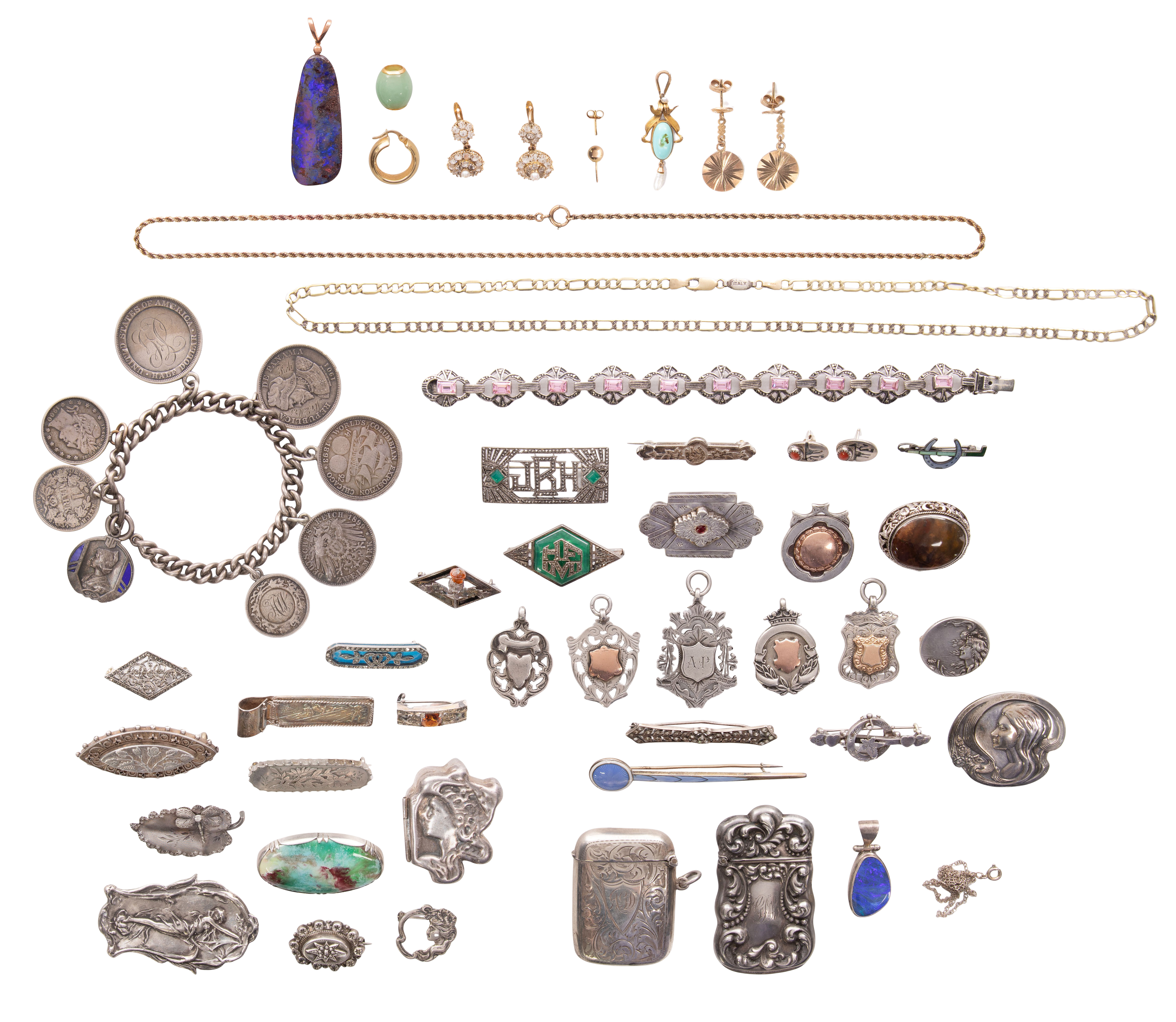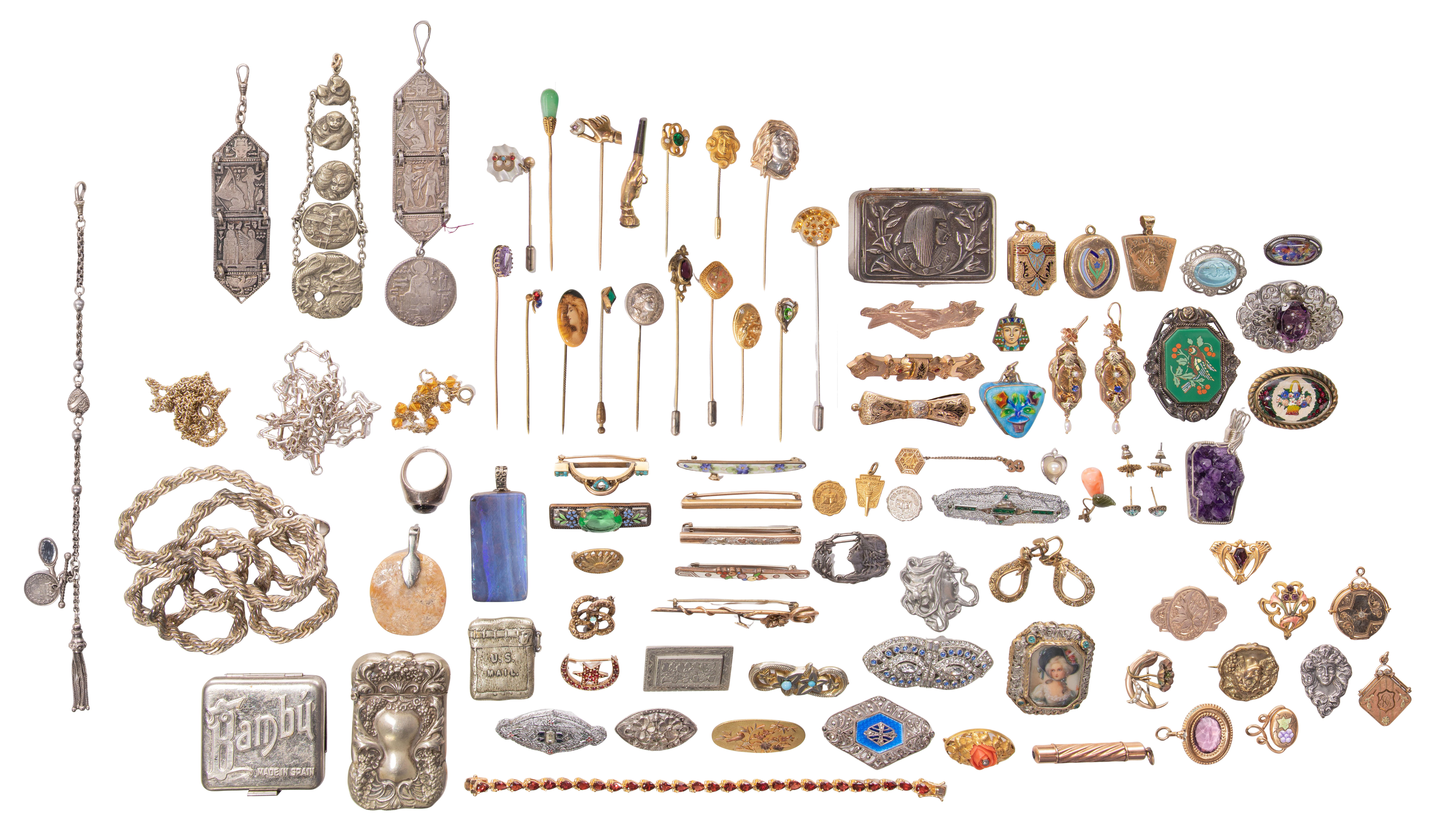 Gold jewelry including a stone pendant, a jadeite jade bead and scrap earring parts (some marked ’14k’), a rope chain, a blue gemstone and pearl accent pendant and (2) earring sets (unmarked 10k) as well as silver jewelry including bar pins, school medals, match safes, brooch pins, a figaro link necklace, a blue stone pendant, a pink stone bracelet and a love token coin bracelet (some marked ‘sterling’ / ‘925’) and costume jewelry including pocket watch hangers, fobs, lockets, stick pins, bar pins, match safes, necklaces, earrings and brooch pins