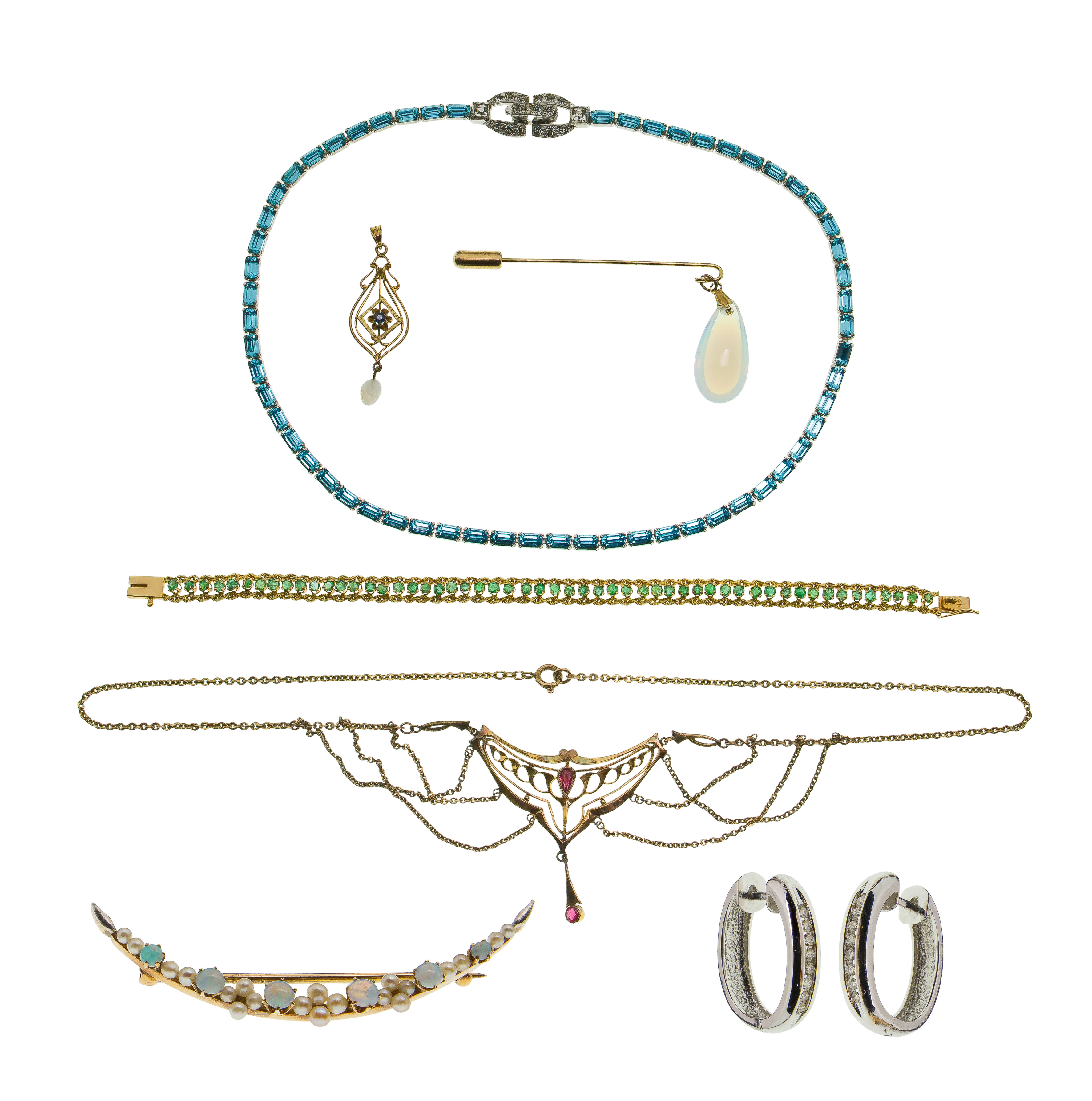 (3) items including an emerald tennis style bracelet, a pair of hoop style pierced earrings and a pearl and opal crescent moon shaped pin (most marked ’14k’) as well as a few pieces of fashion jewelry