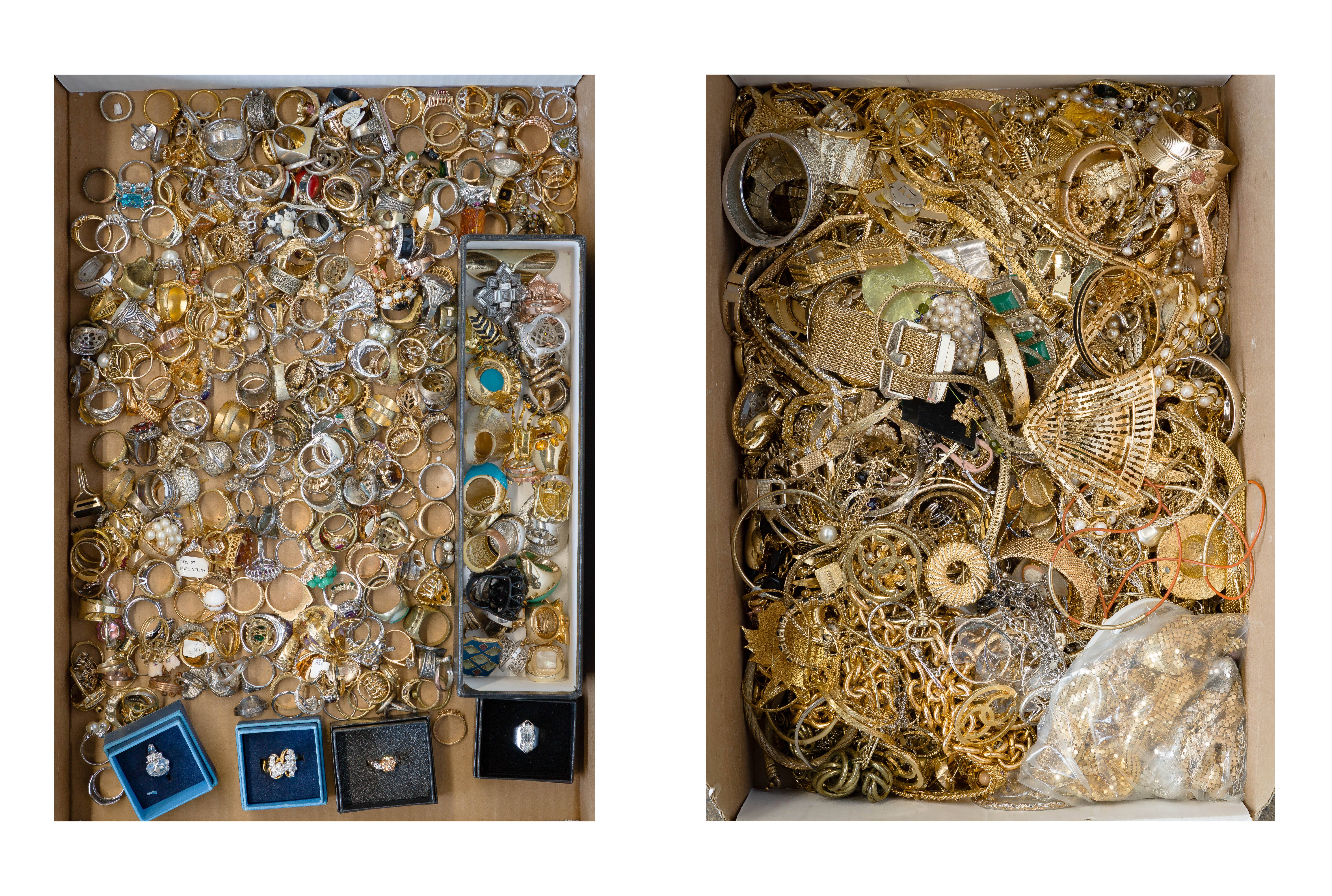 Approximately (6) pounds of fashion rings, many having stones, (4) in ring boxes as well as approximately (20) pounds of mostly gold-tone fashion jewelry including mesh scarves, mesh chokers, necklaces, bracelets, bangles, brooches, pins, some having stones