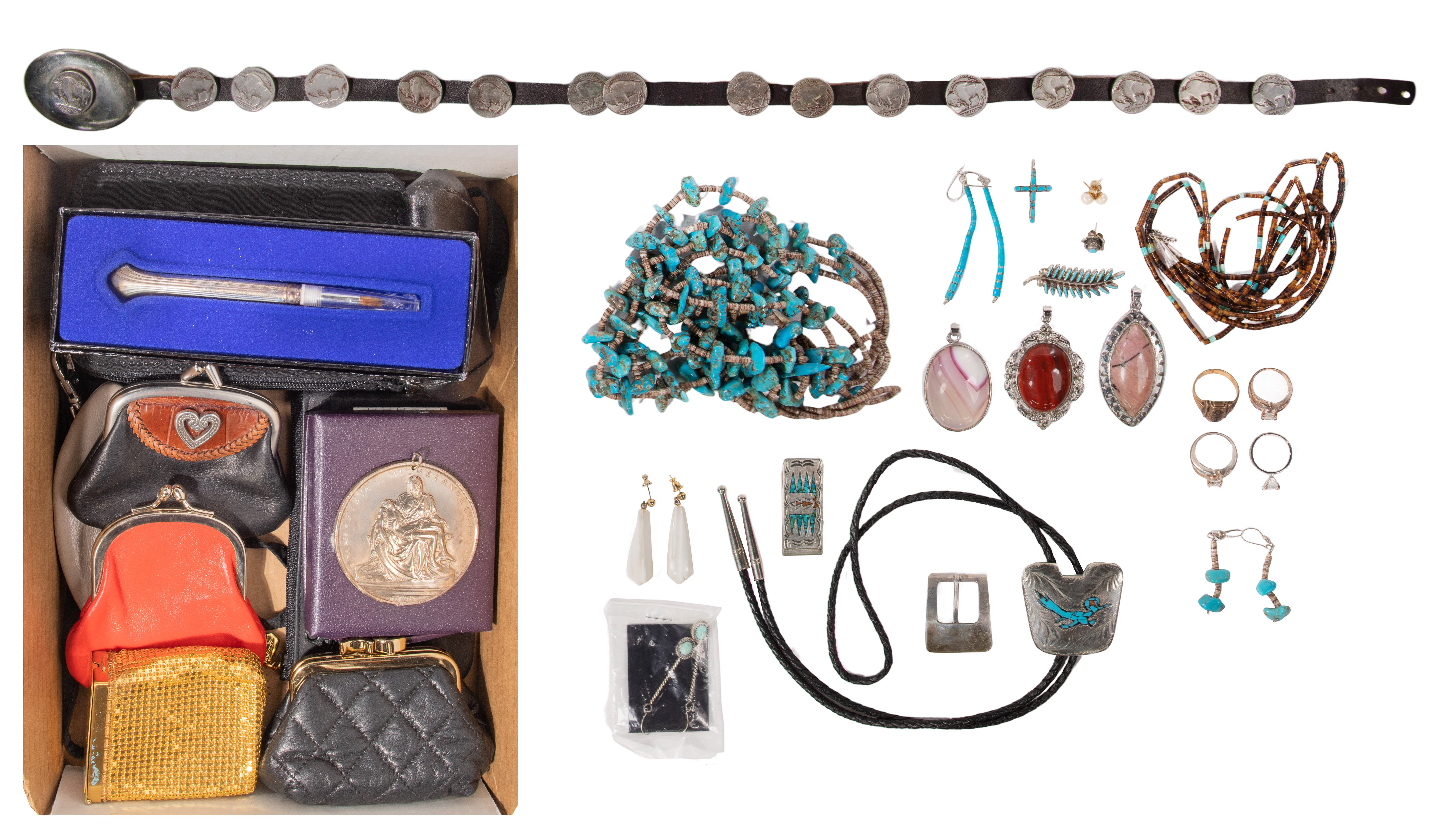 Approximately (50) items including a carved ring (marked ’10k’) as well as a Pieta medallion, necklaces, bracelets, earrings, rings and other items (some marked ‘sterling silver’ / ‘925’); together with coin purses