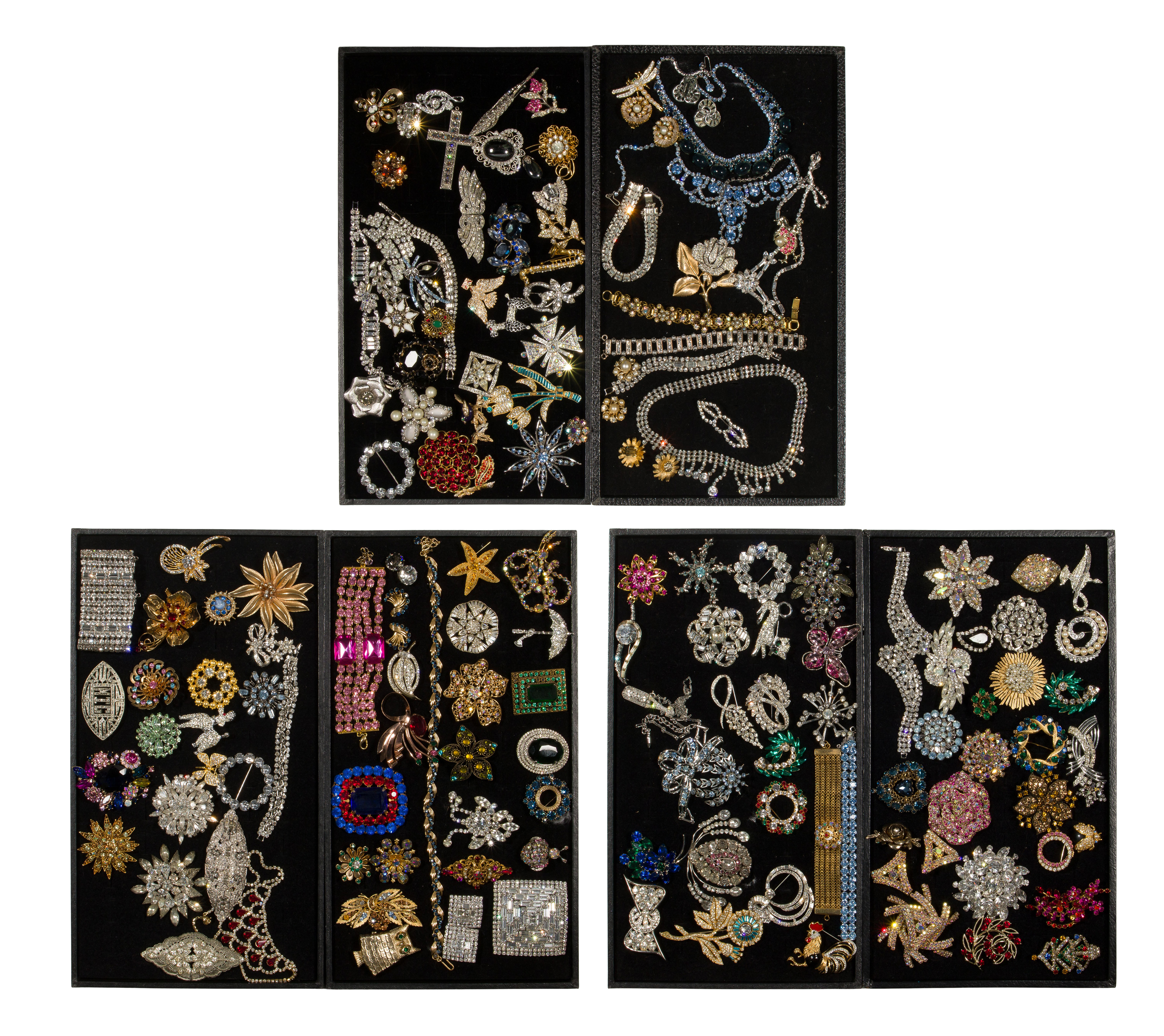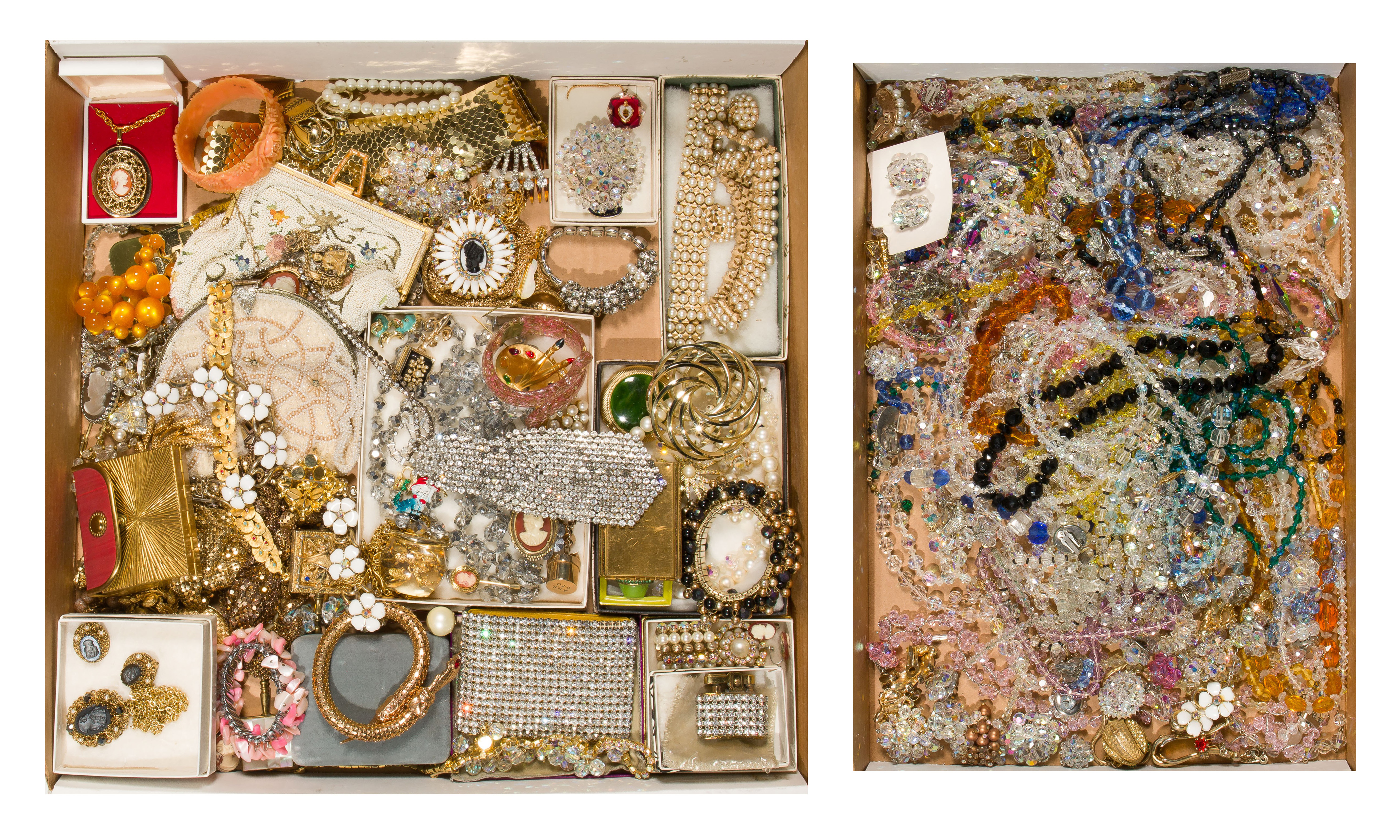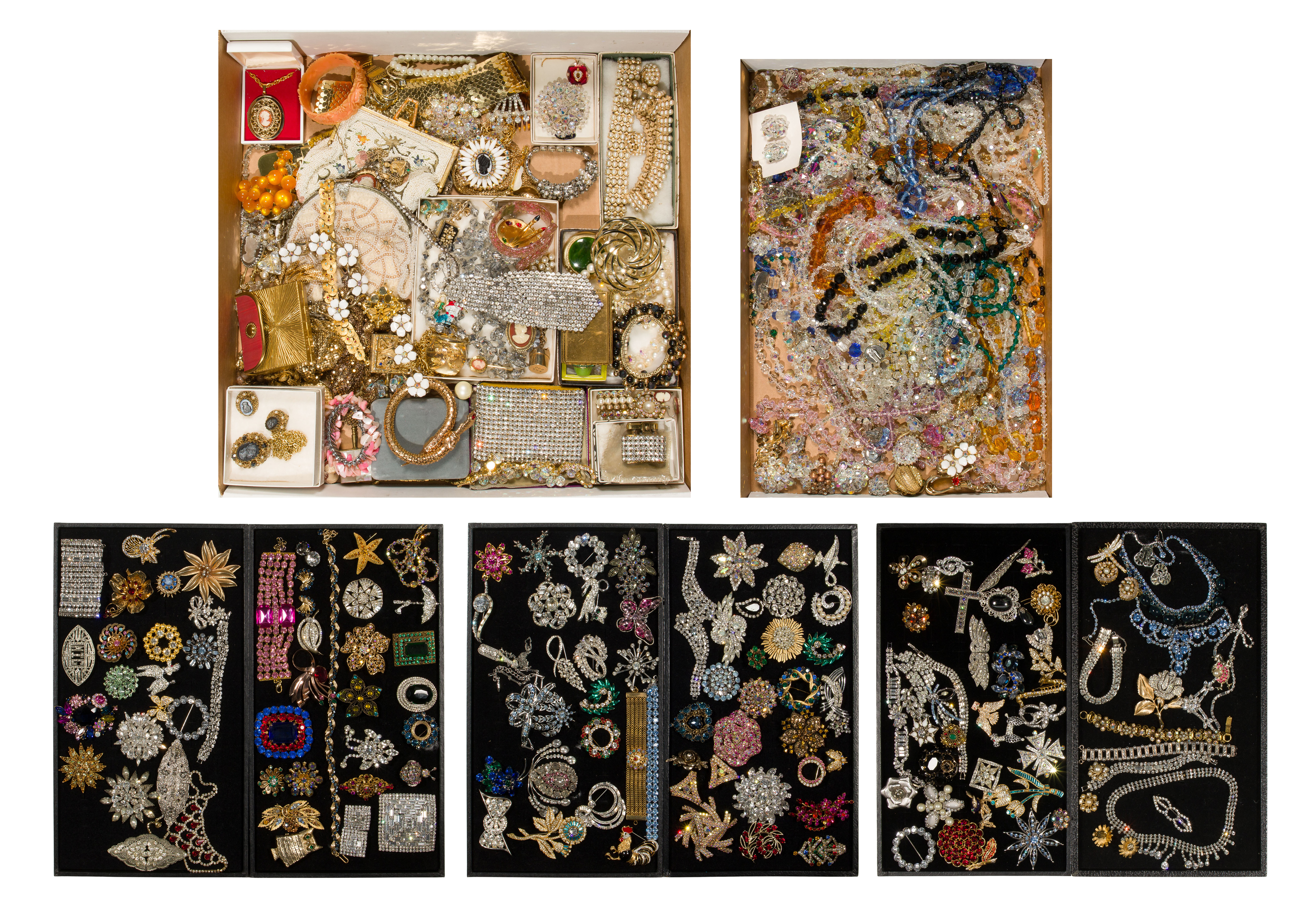 Approximately (5) pounds of rhinestone necklaces, bracelets, brooches, pins and earrings as well as approximately (15) pounds of fashion jewelry including Austrian crystal and other faceted bead necklaces, rhinestone encrusted wallet, lighter and necklace, cameo style necklace and earring suite, cameo style brooches and pins, assorted bracelets, bangles, necklaces and earrings as well as compacts, lighters and beaded purses