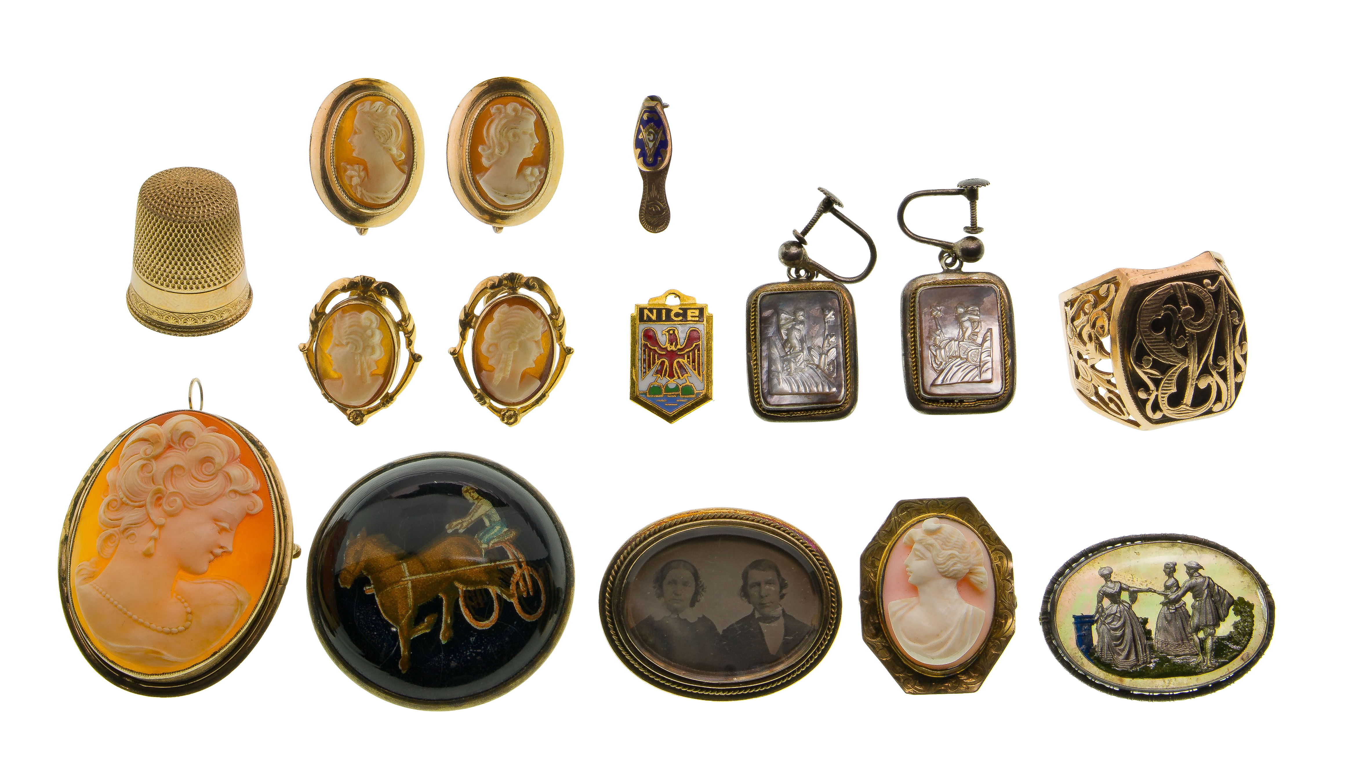 (12) items including a signet ‘B’ ring (marked ’14k’), a pair of earrings (marked ‘835’) as well as pins, earrings and a thimble in a Marshall Field’s box