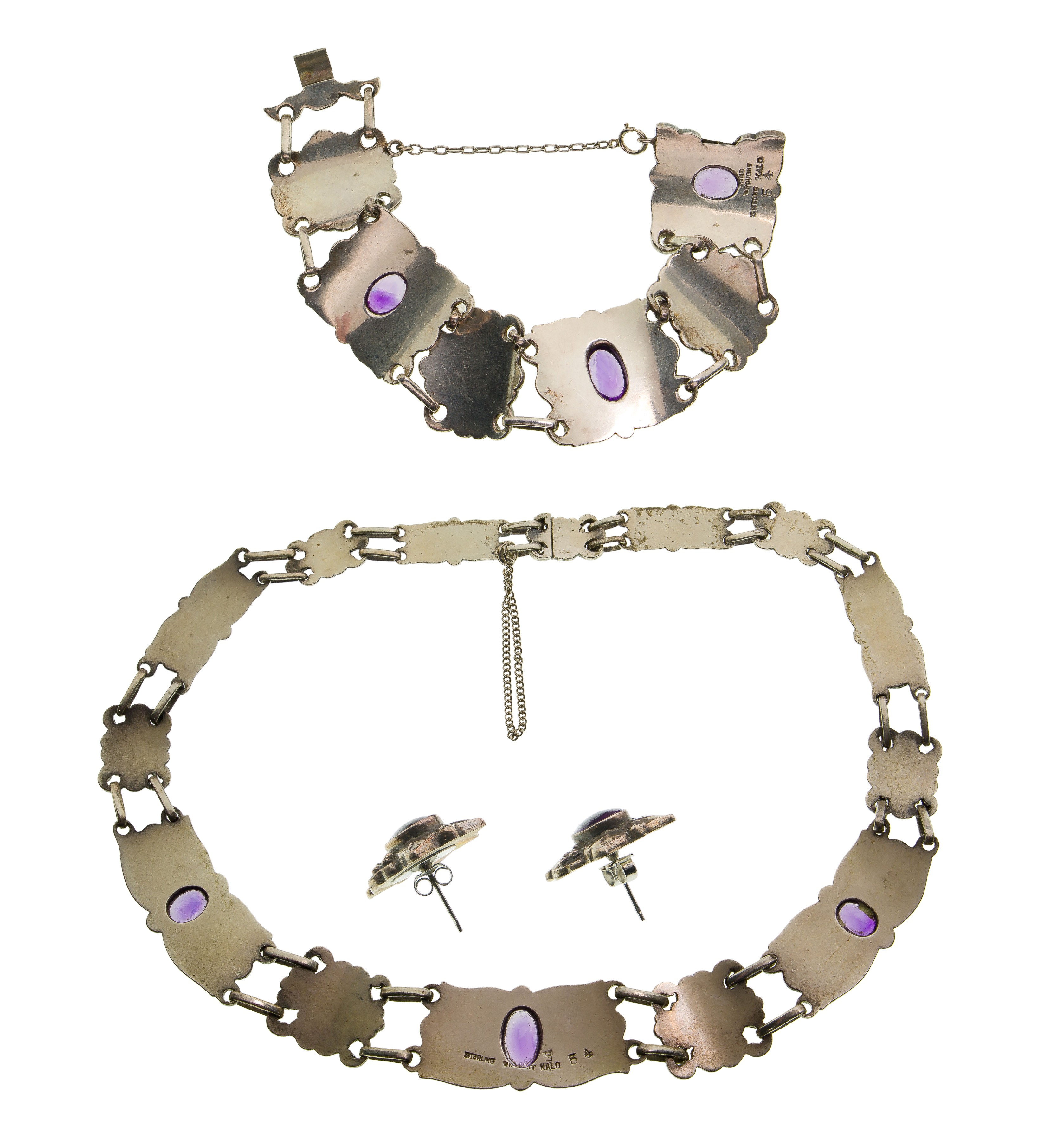 A (3)-piece suite #54 including a choker style necklace, a bracelet and pair of earrings, each having oval cut amethyst accents in a grape motif (stamped ‘Kalo’ and ‘sterling silver’)
