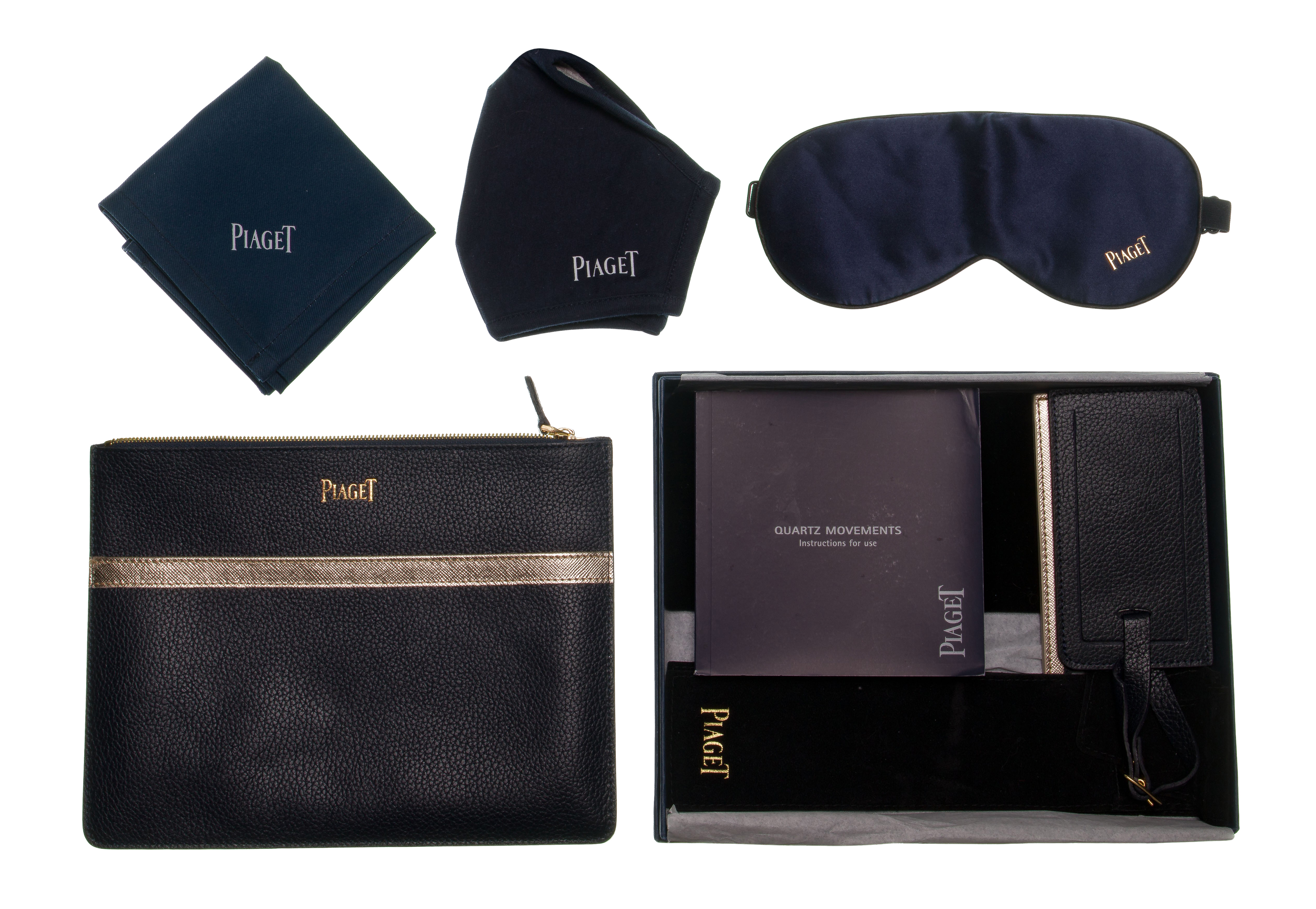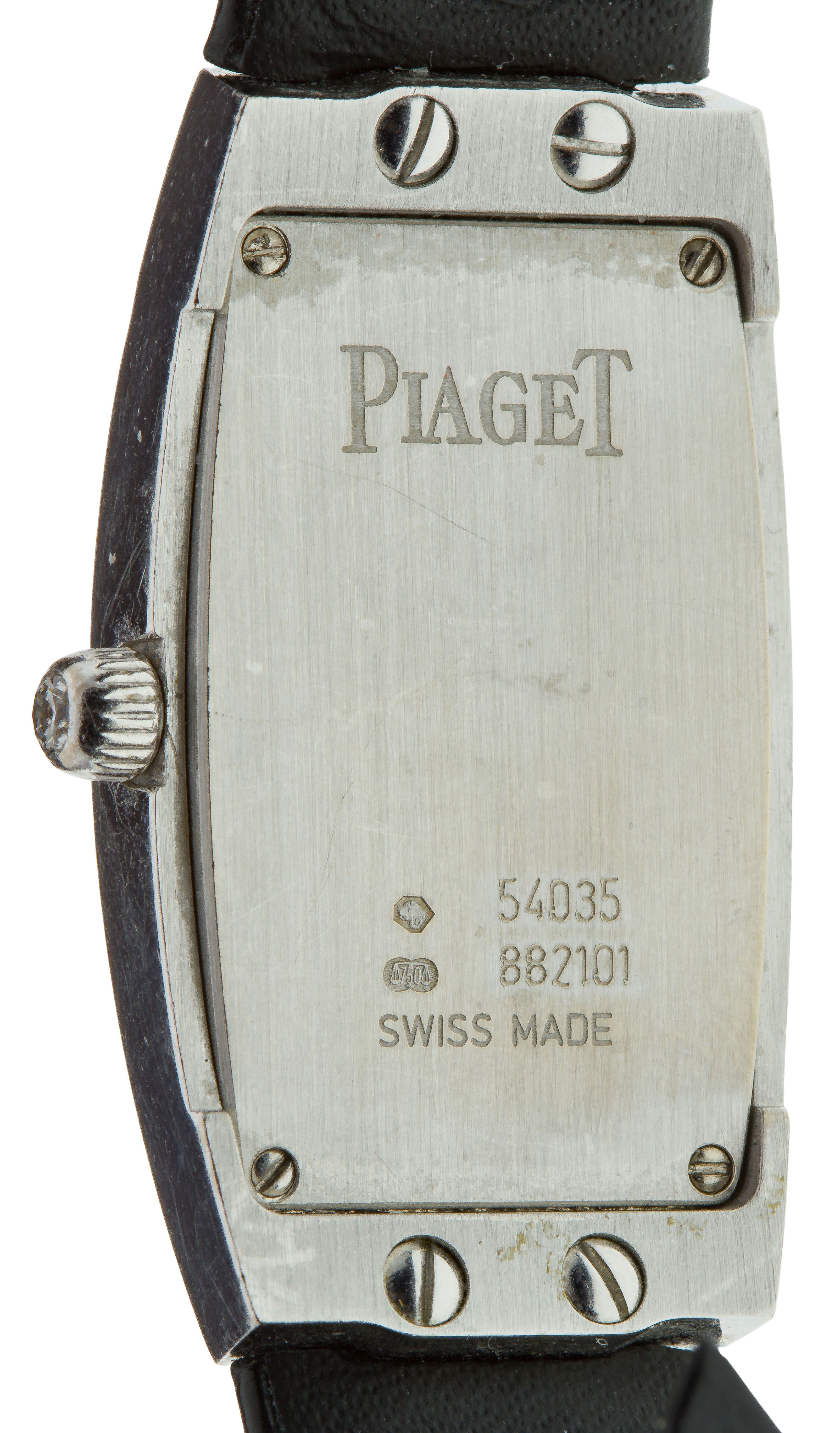 Serial #8822101, having a silvered dial accented with diamonds, 18k white gold-tone hour markers, caliber 690P quartz movement, black leather strap and diamond accented clasp (marked ‘750’ on back of case and inside clasp), including COA, paperwork, a box of Piaget promotional items and a second strap