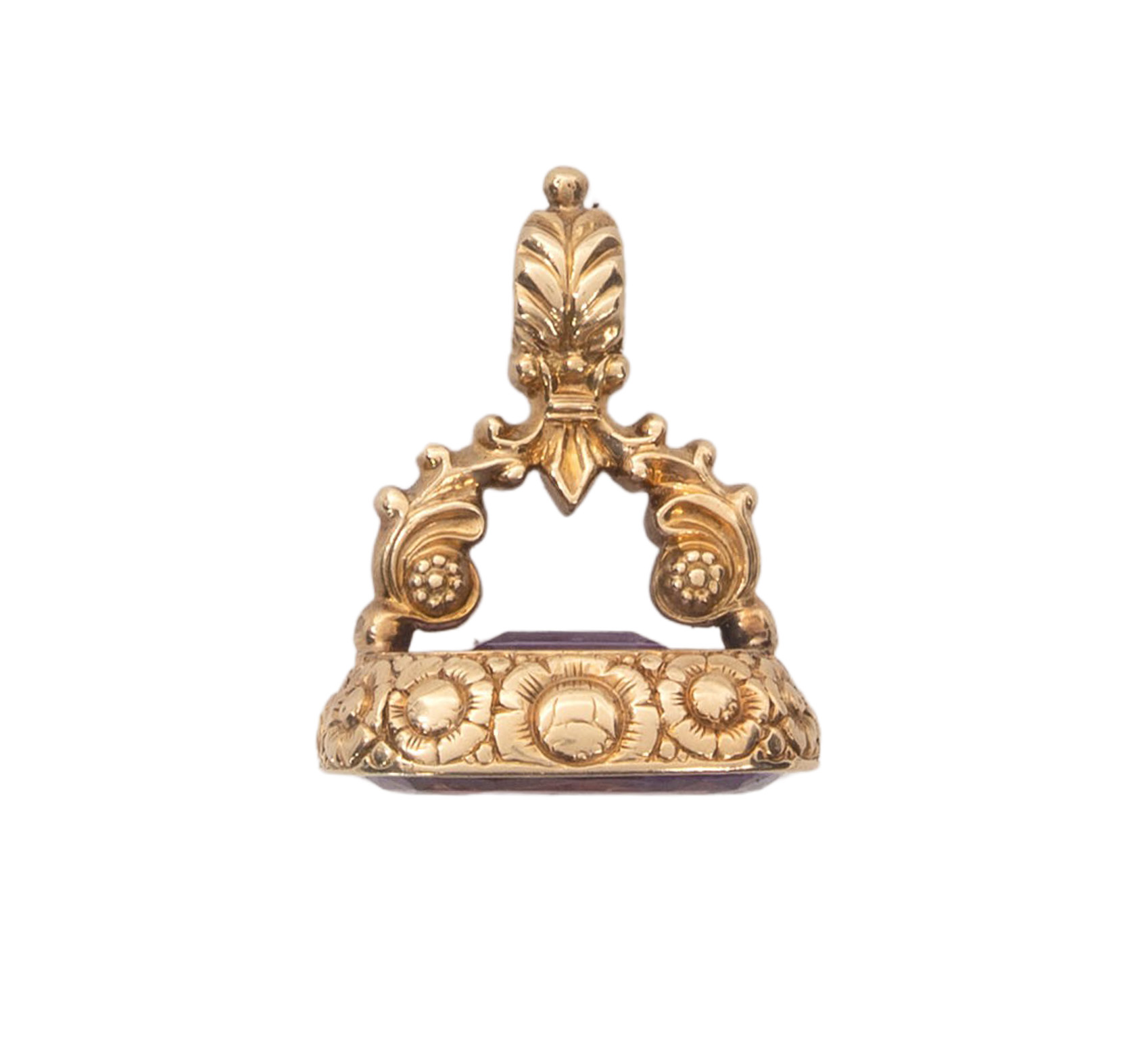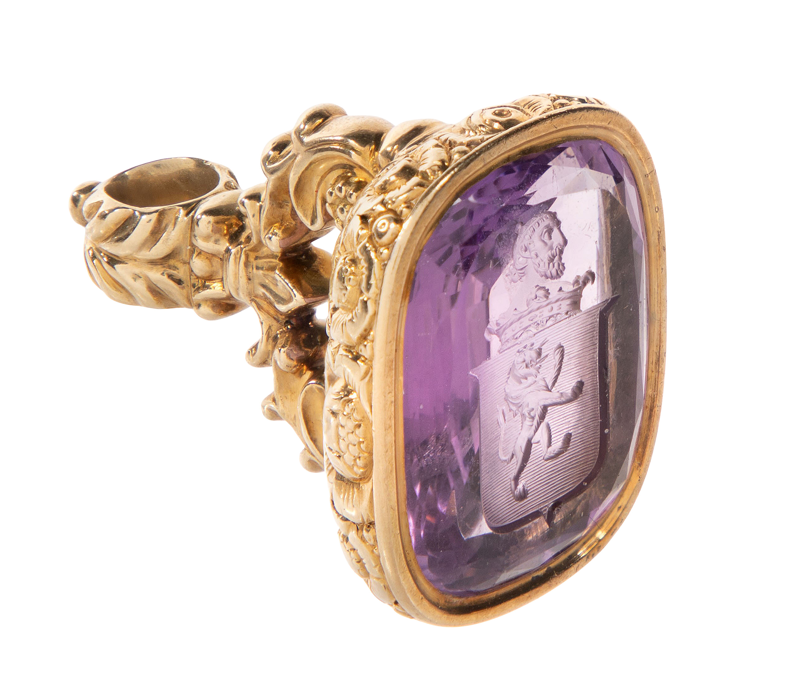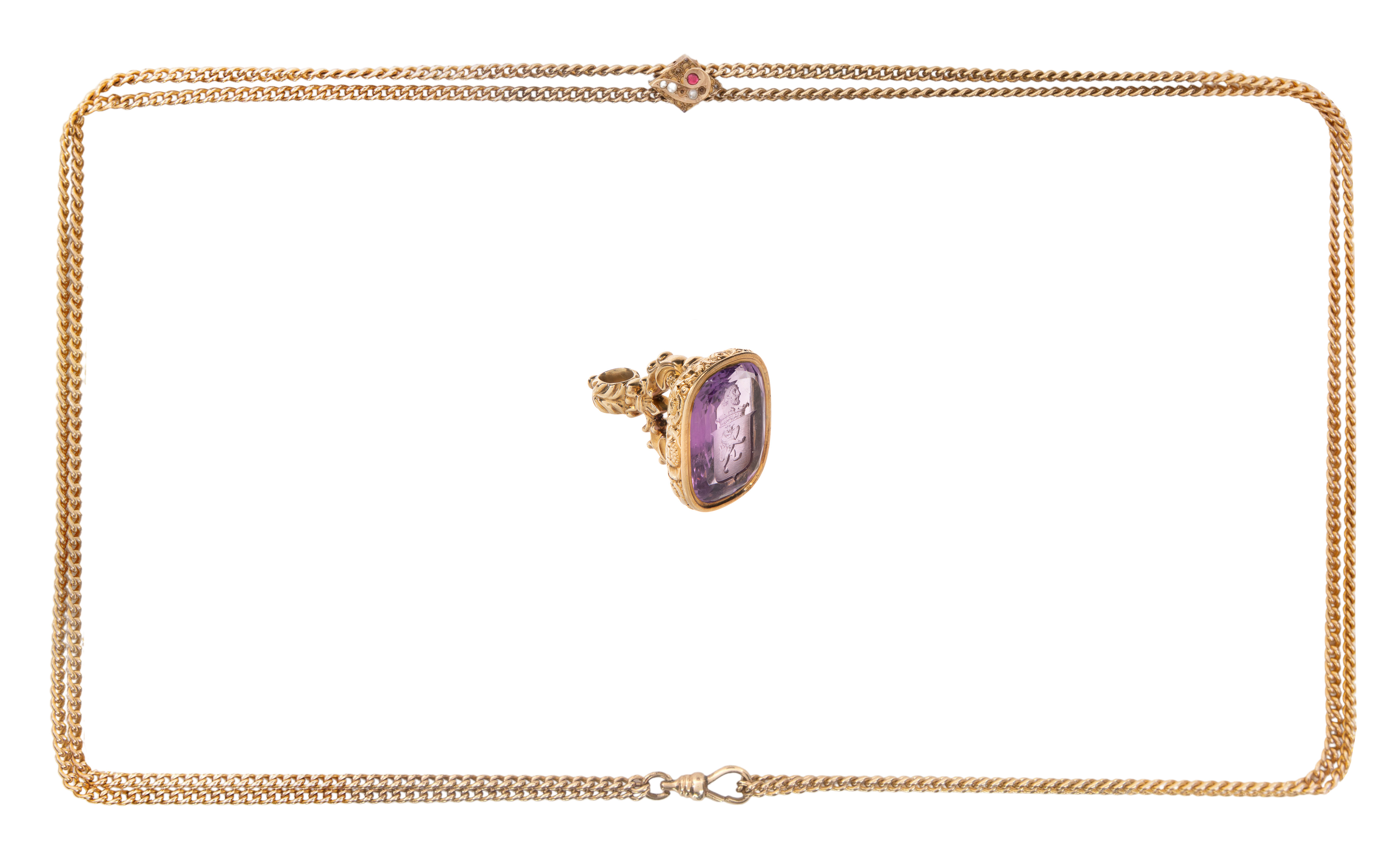 An amethyst intaglio seal style fob (unmarked 14k) and a watch chain with clip (unmarked 10k)