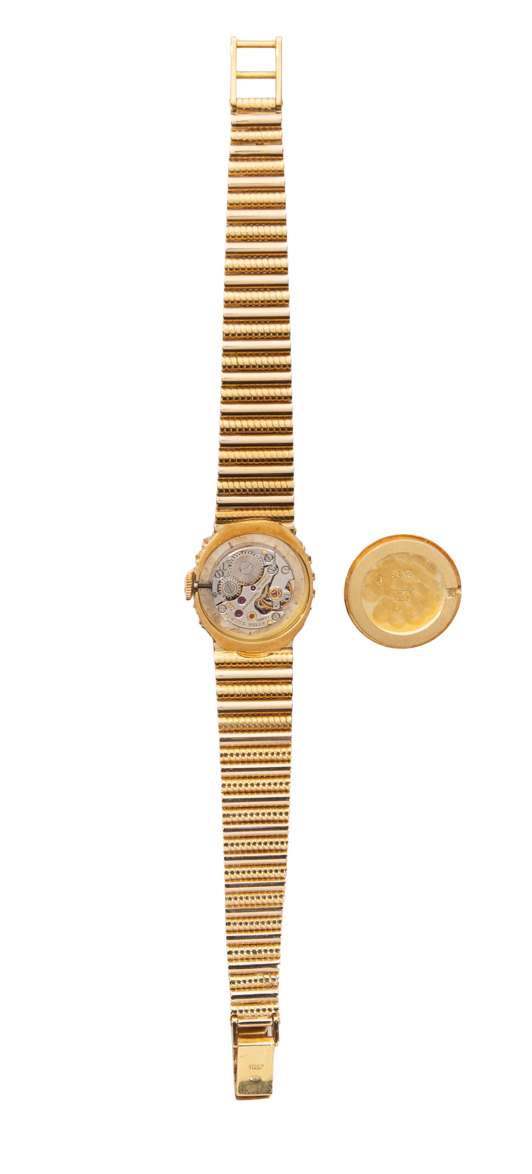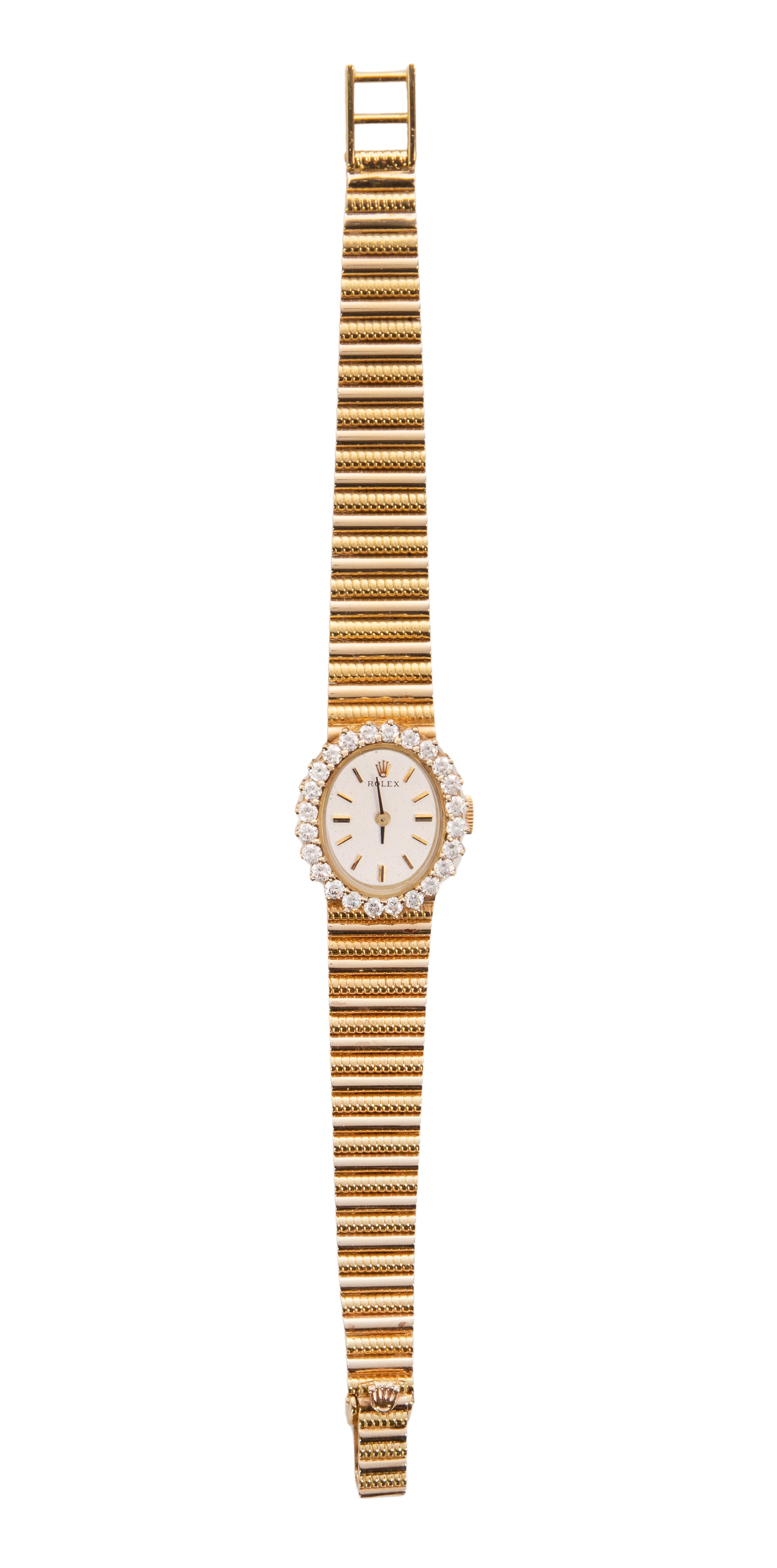 Having a champagne oval dial, gold-tone baton marks, surrounded by twenty-four round cut diamonds, on an integrated bracelet (marked ’18k’ on back of watch case and band clasp)