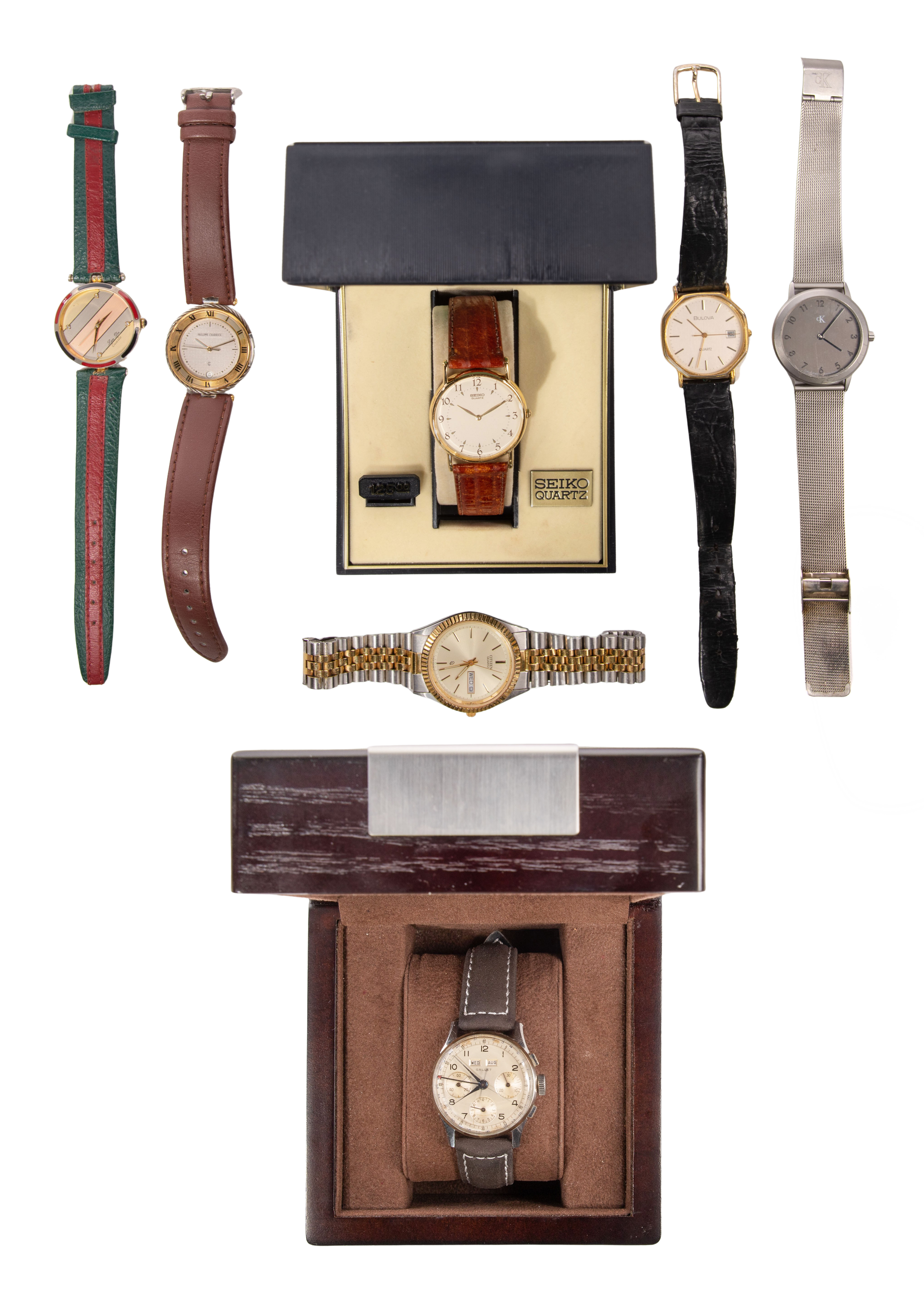 (7) total items including a chronograph watch having a triple dial layout, day date, stopwatch function and leather band, in original box; together with wristwatches including Citizen, Charriot, Bulova, Calving Klein, Seiko having original box