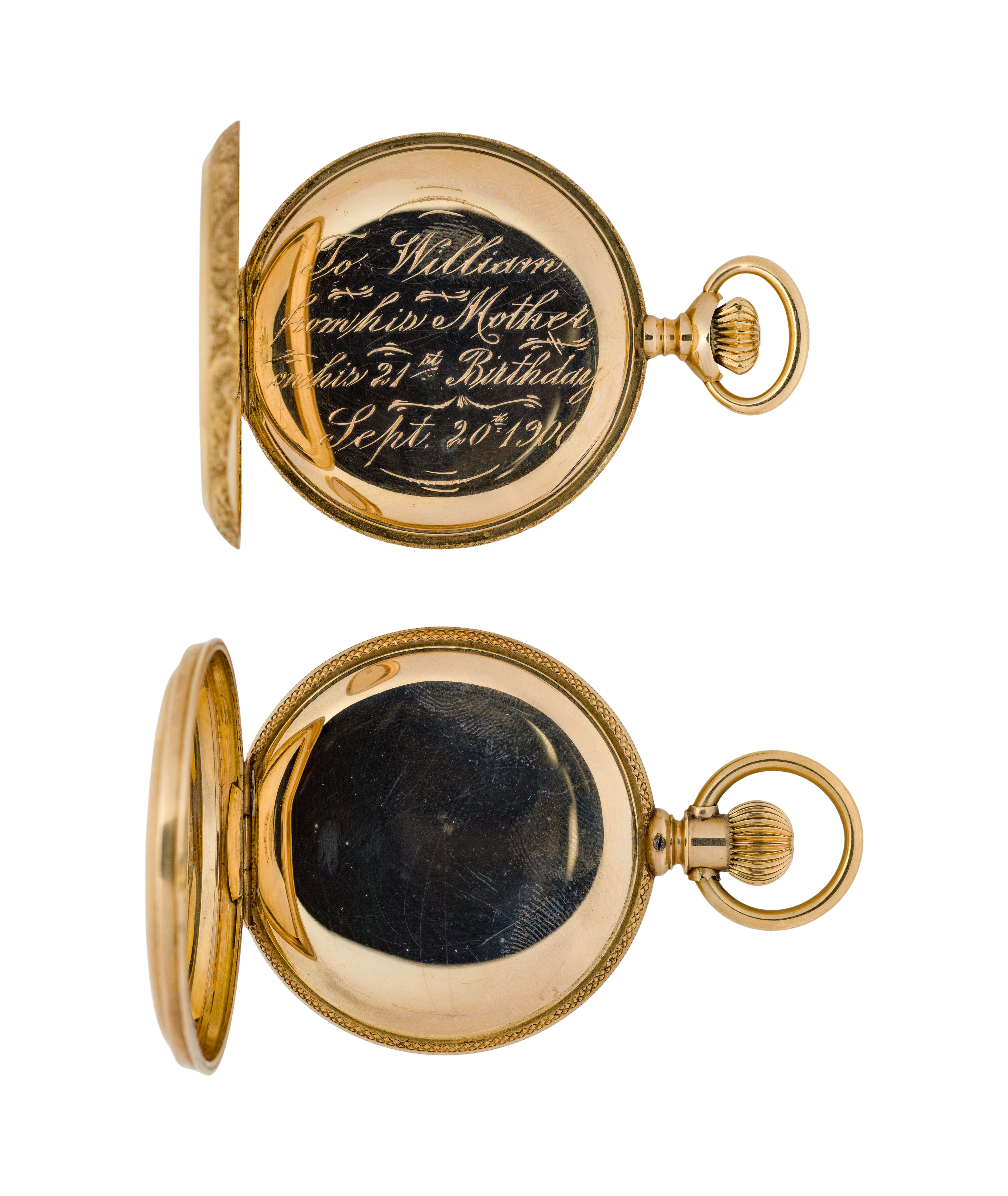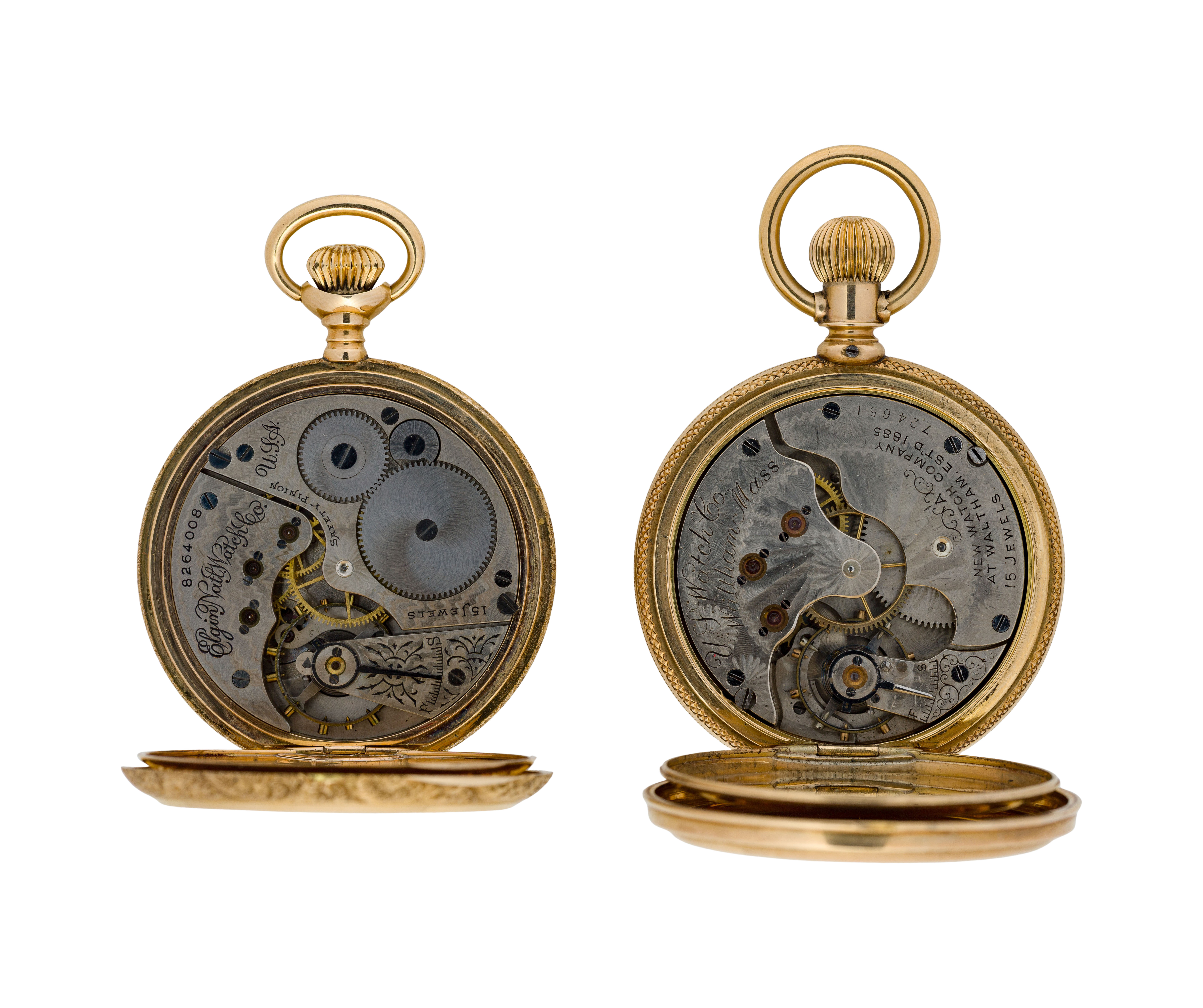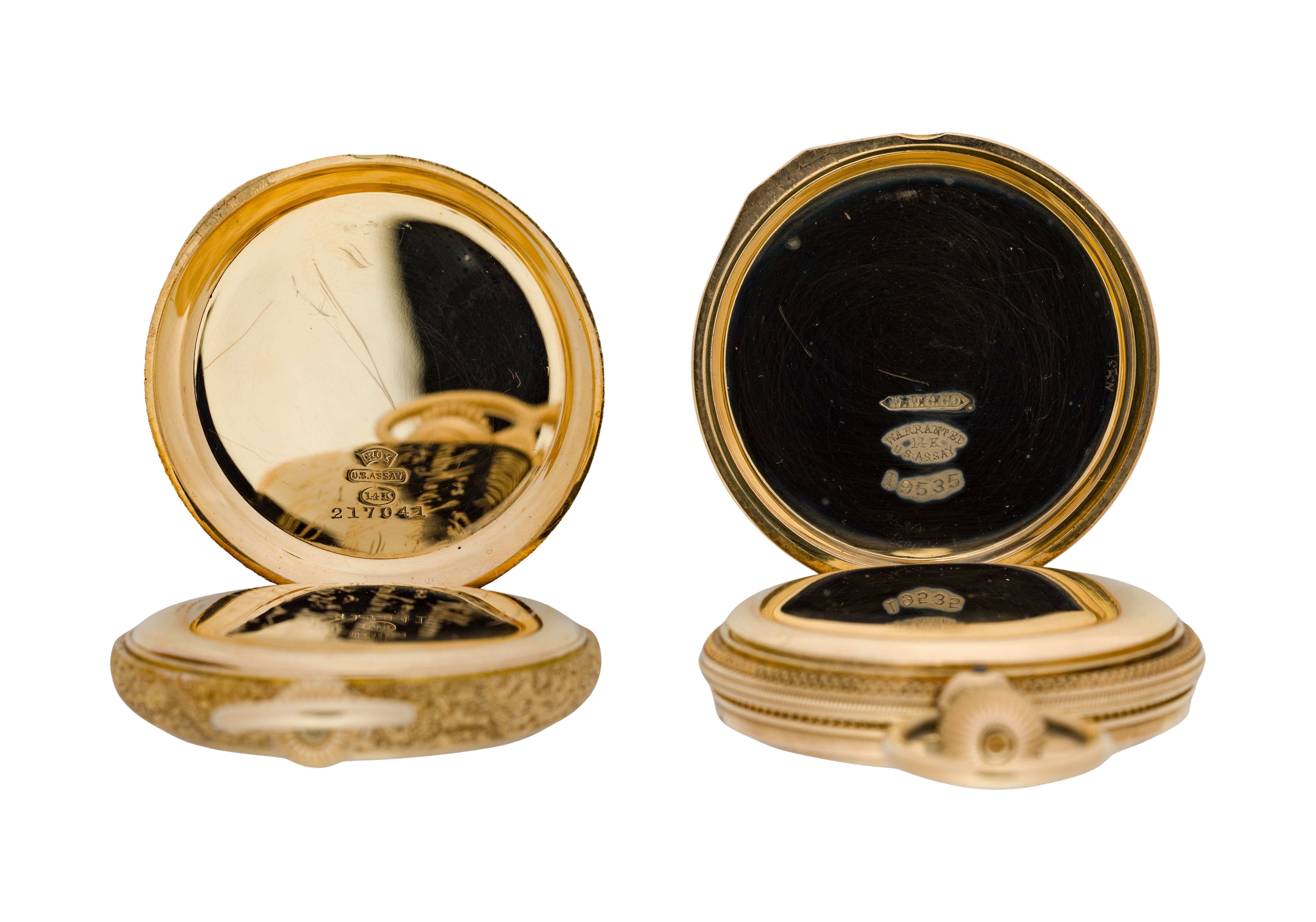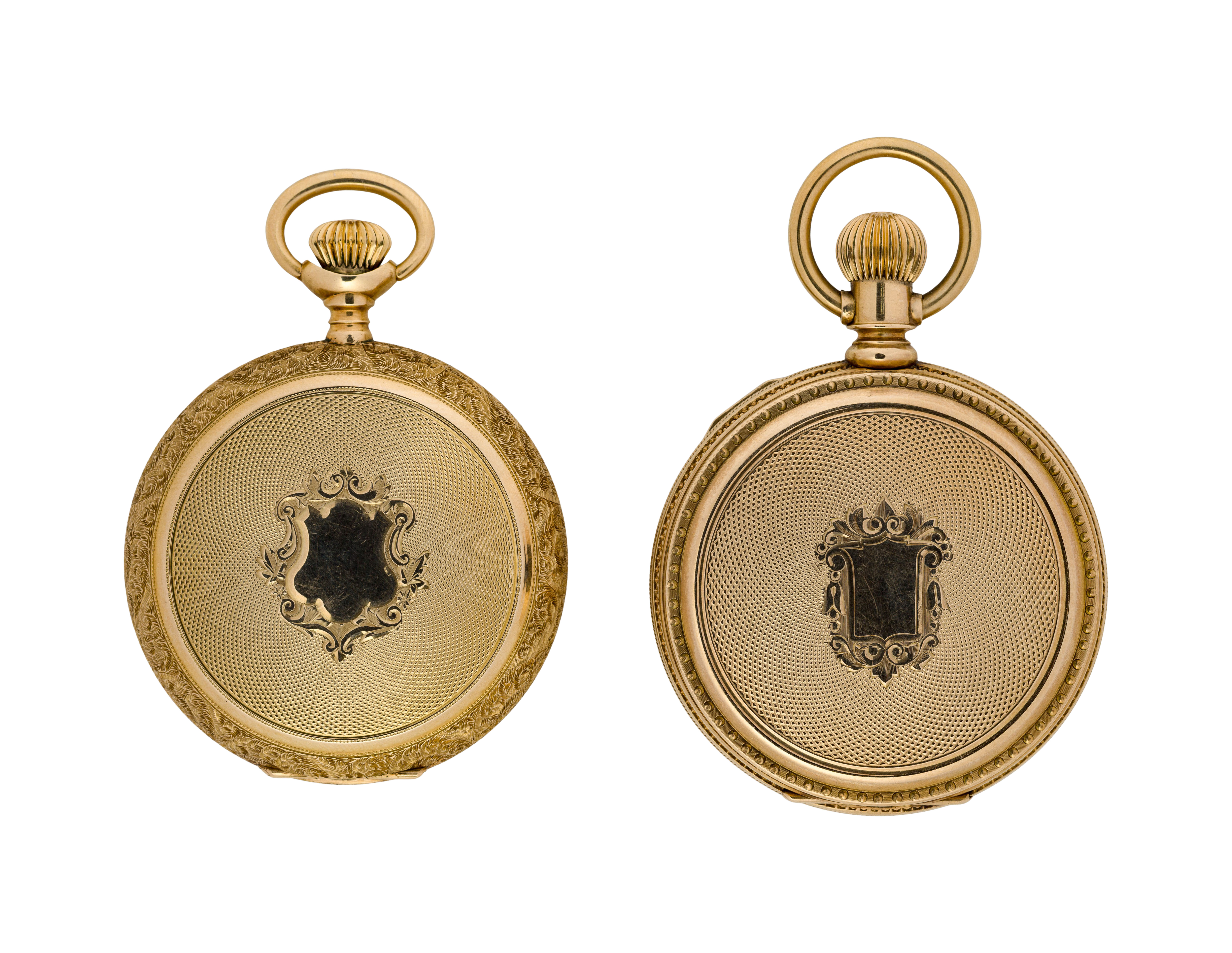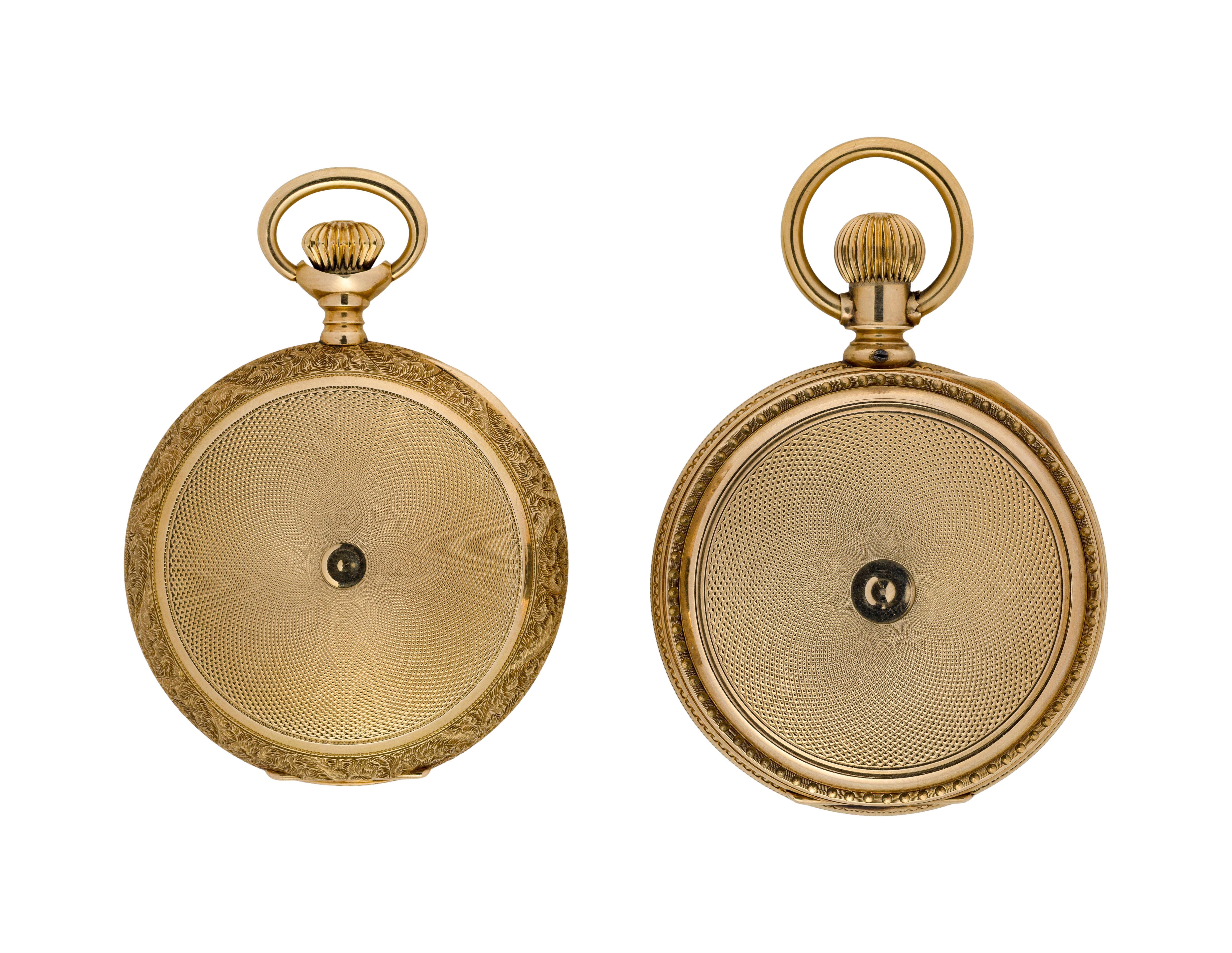 (2) items including an Elgin serial #8264008 dating to c.1900, 15-jewel movement, No.220 grade, white dial having Roman numerals, blue hands, subsidiary dial for seconds, stem wind, stem set (marked ‘Roy U.S. Assay 14k’ inside case) and a United States Watch Co. serial #724651 dating to c.1903, No.105 grade, white dial having Roman numerals, blue hands, subsidiary dial for seconds, stem wind, lever set (marked ‘Warranted 14k U.S. Assay’ inside case)