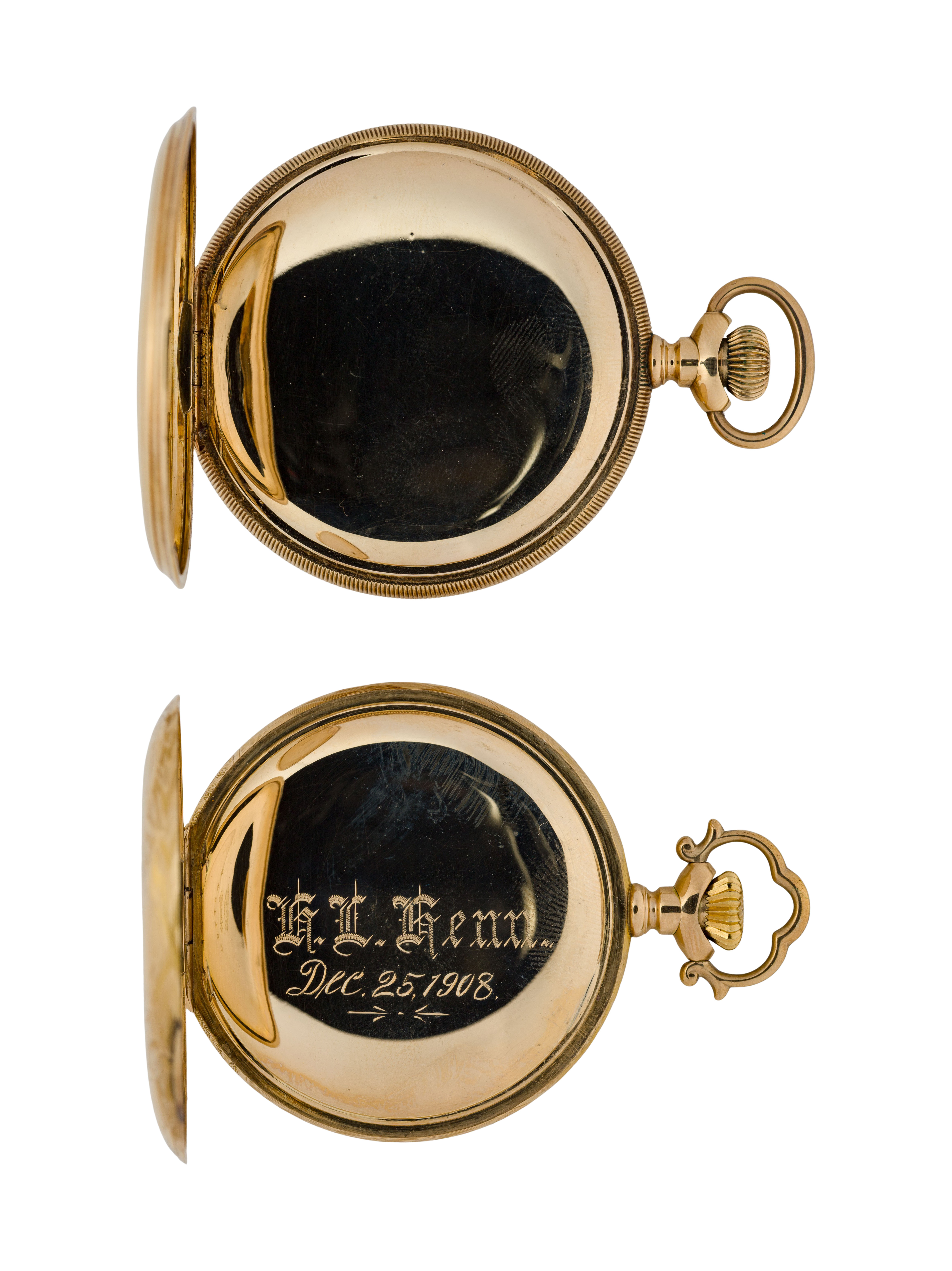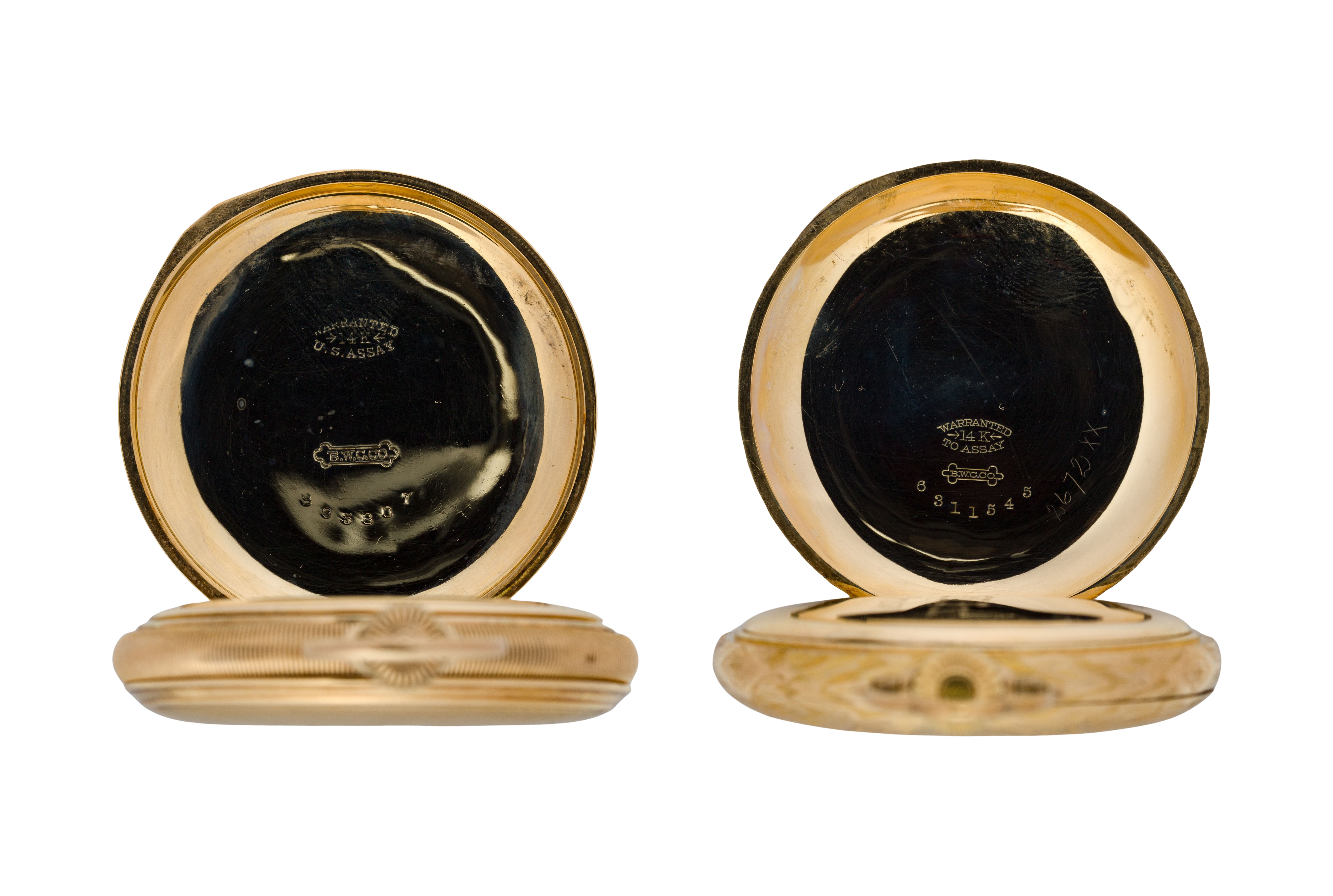 (2) items including a Hamilton serial #708067 dating to c.1903, 17-jewel movement, No.975 grade, white dial having Roman numerals, blue hands, subsidiary dial for seconds, stem wind, lever set (marked ‘Warranted 14k To Assay’ inside case) and an American Waltham Watch Co. serial #7840622 dating to c.1896, 16-jewel movement, special grade, white dial having Roman numerals, blue hands, subsidiary dial for seconds, stem wind, stem set (marked ‘Warranted 14k U.S. Assay’ inside case)