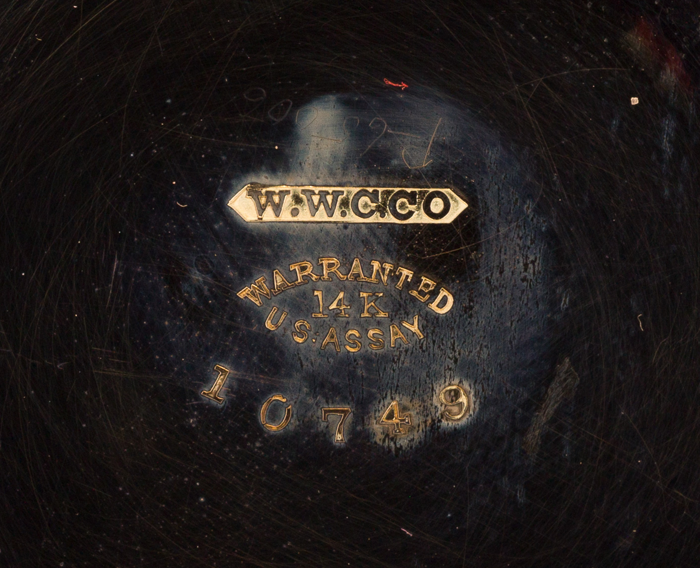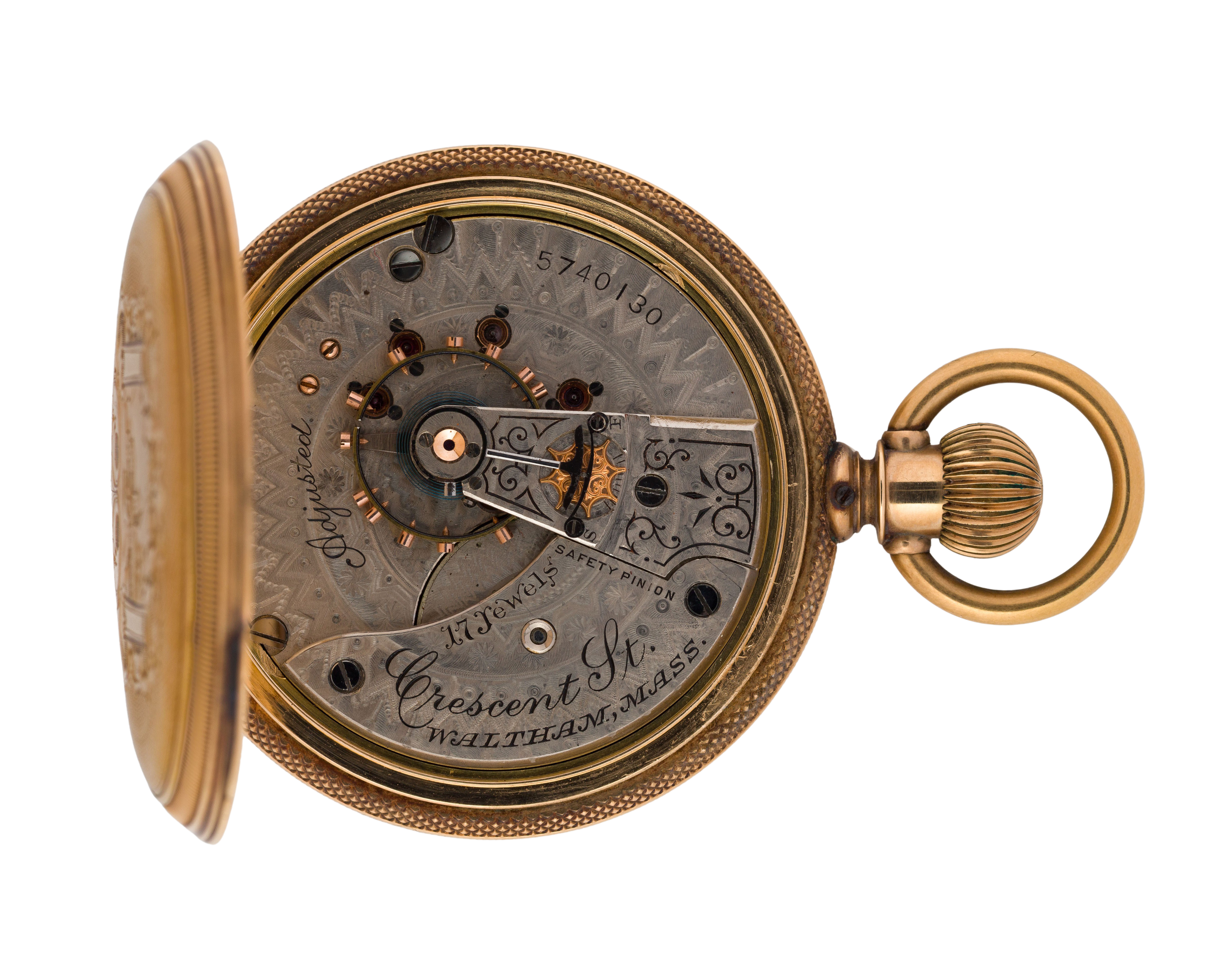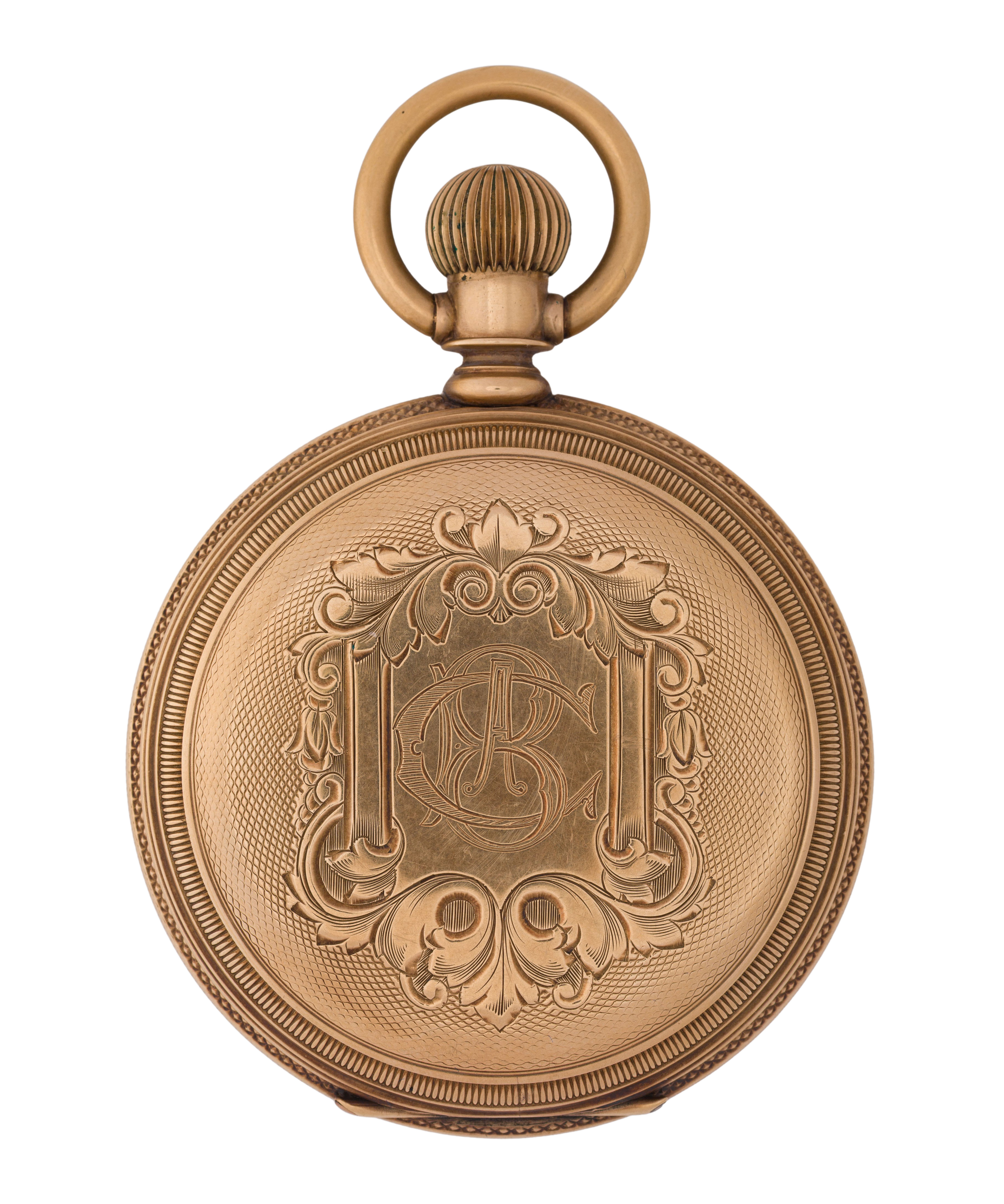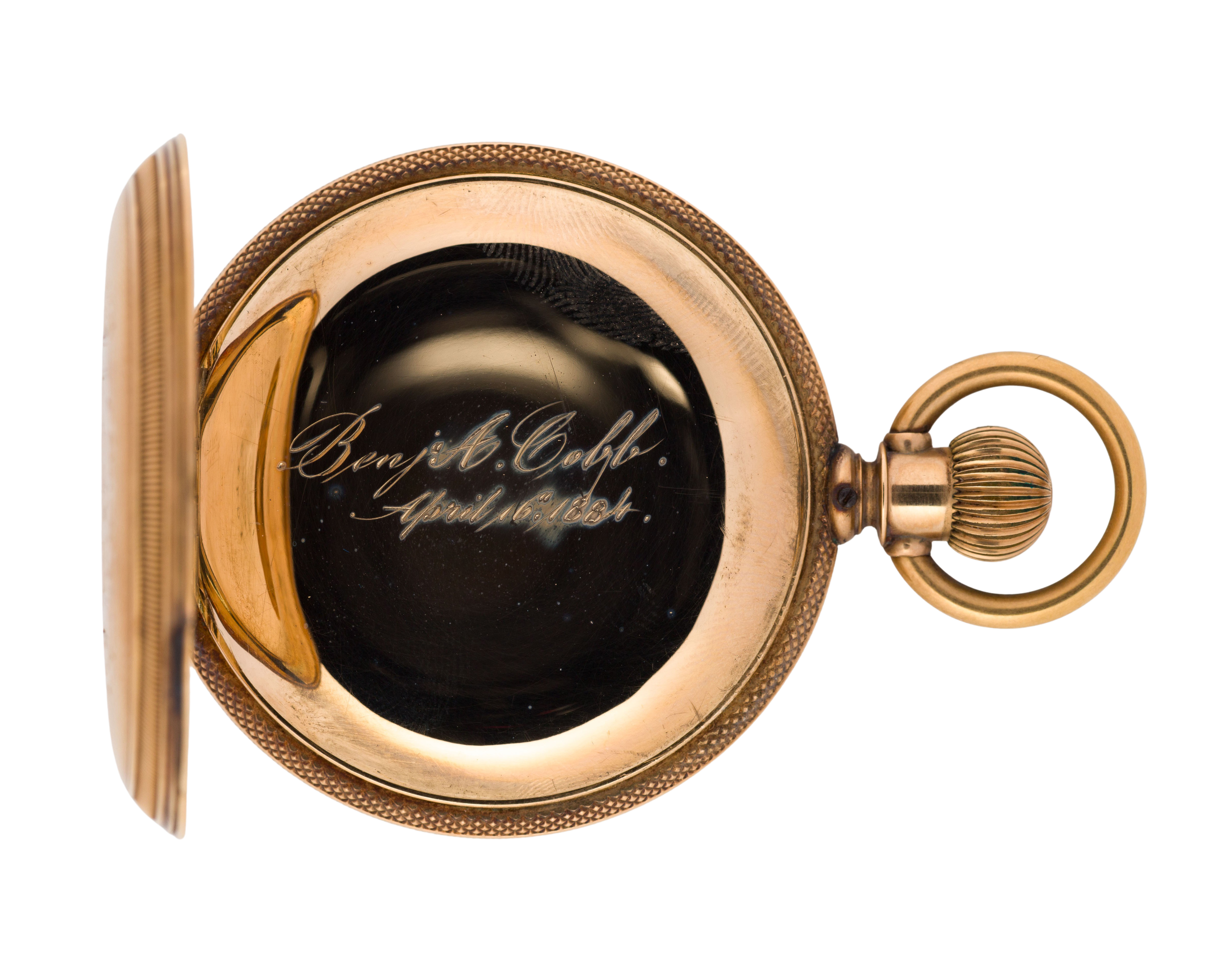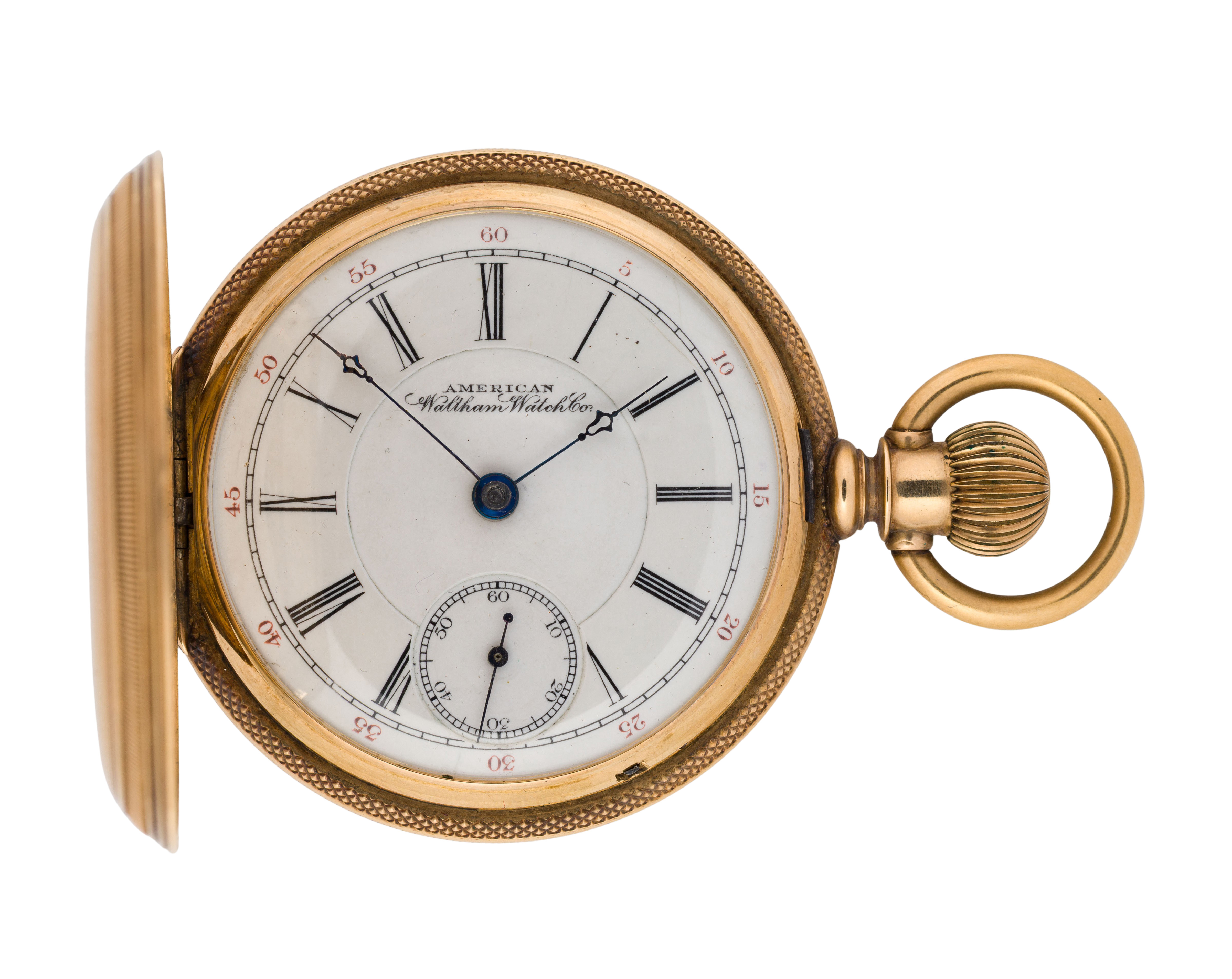 Serial #5740130 dating to c.1893, 15-jewel movement, Cresent St. grade, white dial having Roman numerals, blue hands, subsidiary dial for seconds, stem wind, lever set (marked ‘Warranted 14k U.S. Assay’ inside case)