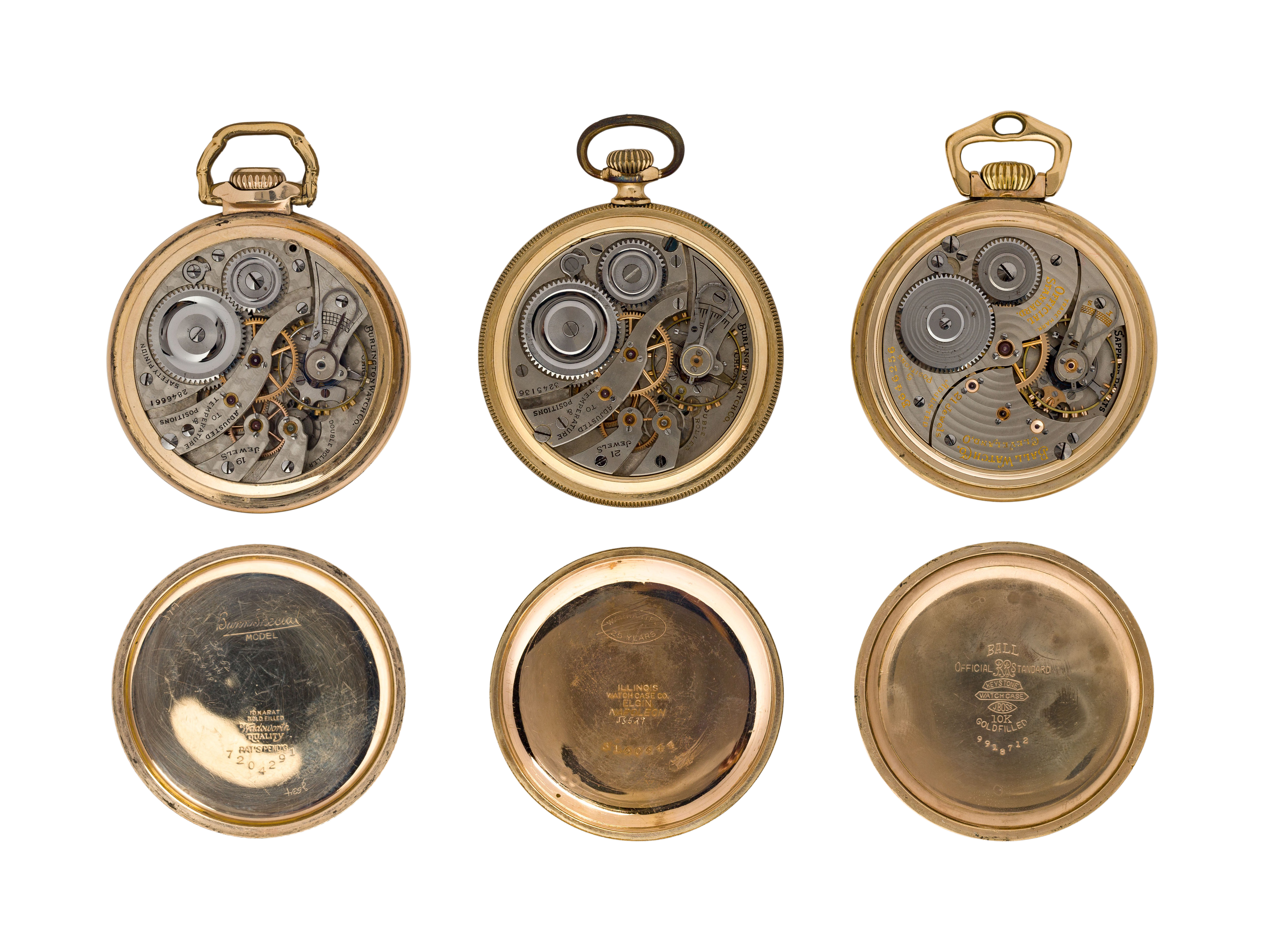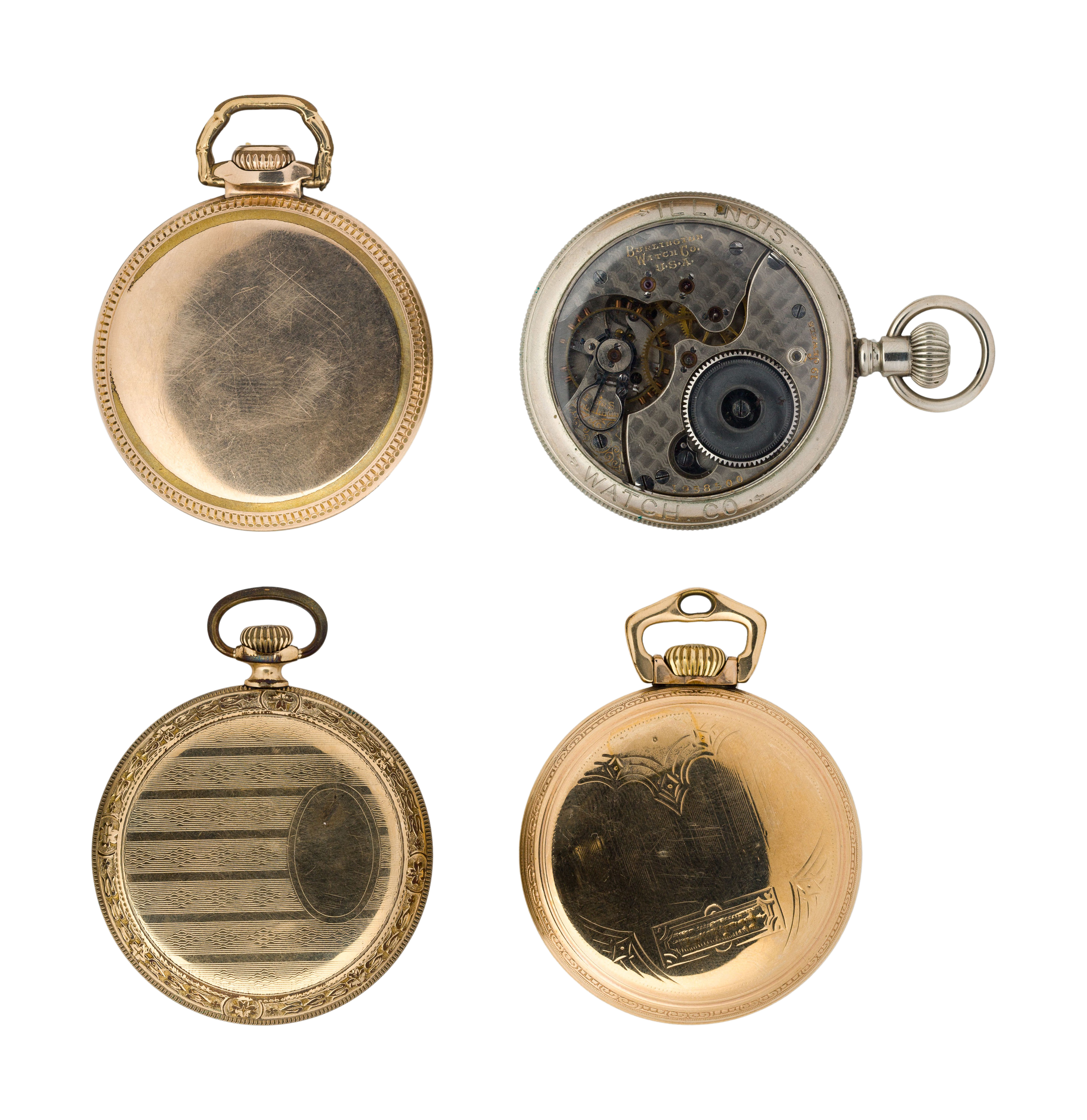 (4) items including a Burlington serial #1958500 dating to c.1907, 19-jewel movement, No.174 grade, a Burlington serial #2846661 dating to c.1915, 19-jewel movement, No.106 grade, a Burlington serial #3245136 dating to c.1917, 21-jewel movement, No.107 grade and a Ball Watch Co. serial #B646256 dating to c.1938, 21-jewel movement, No.999P grade, all having gold-filled or silver-tone cases