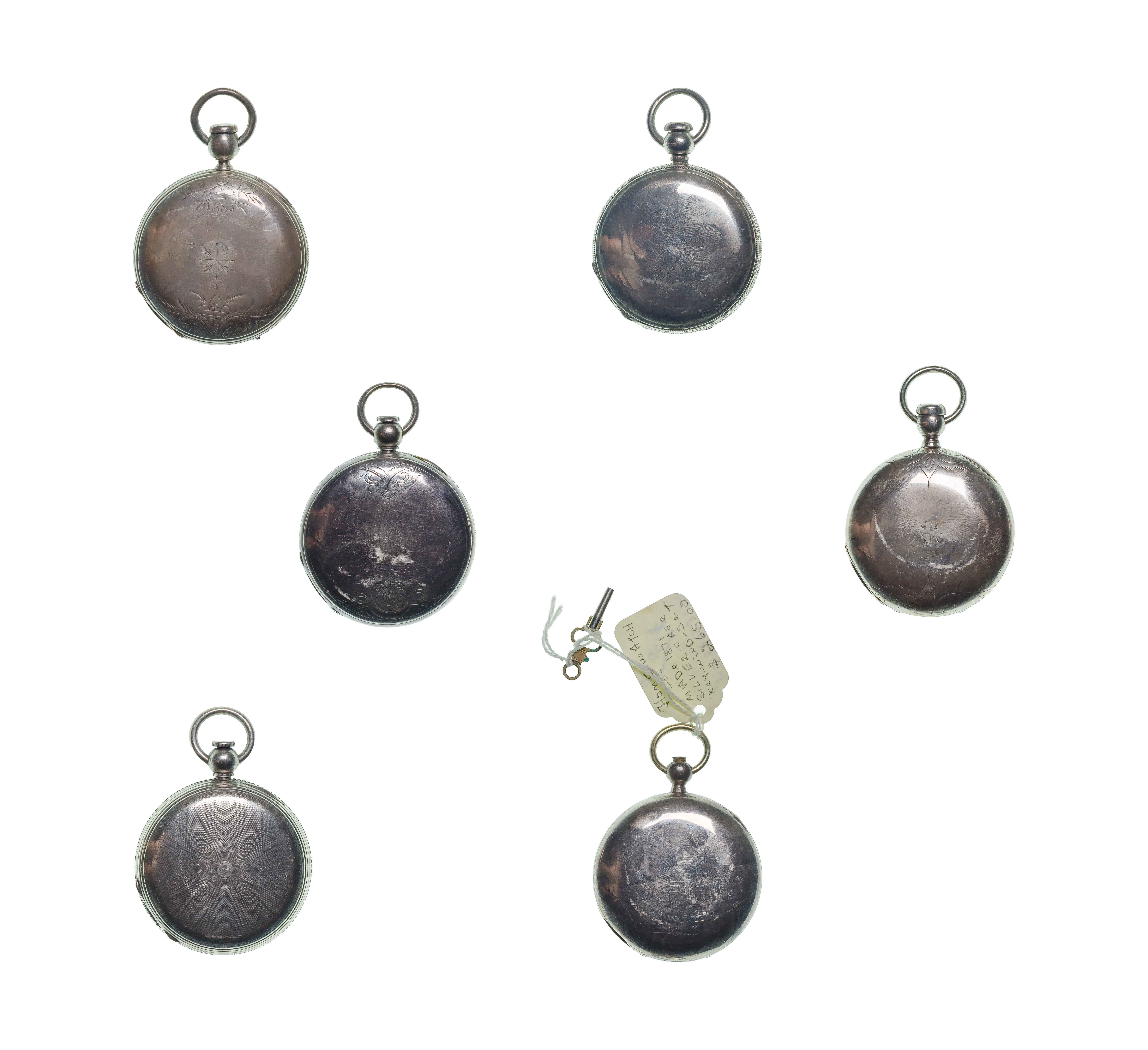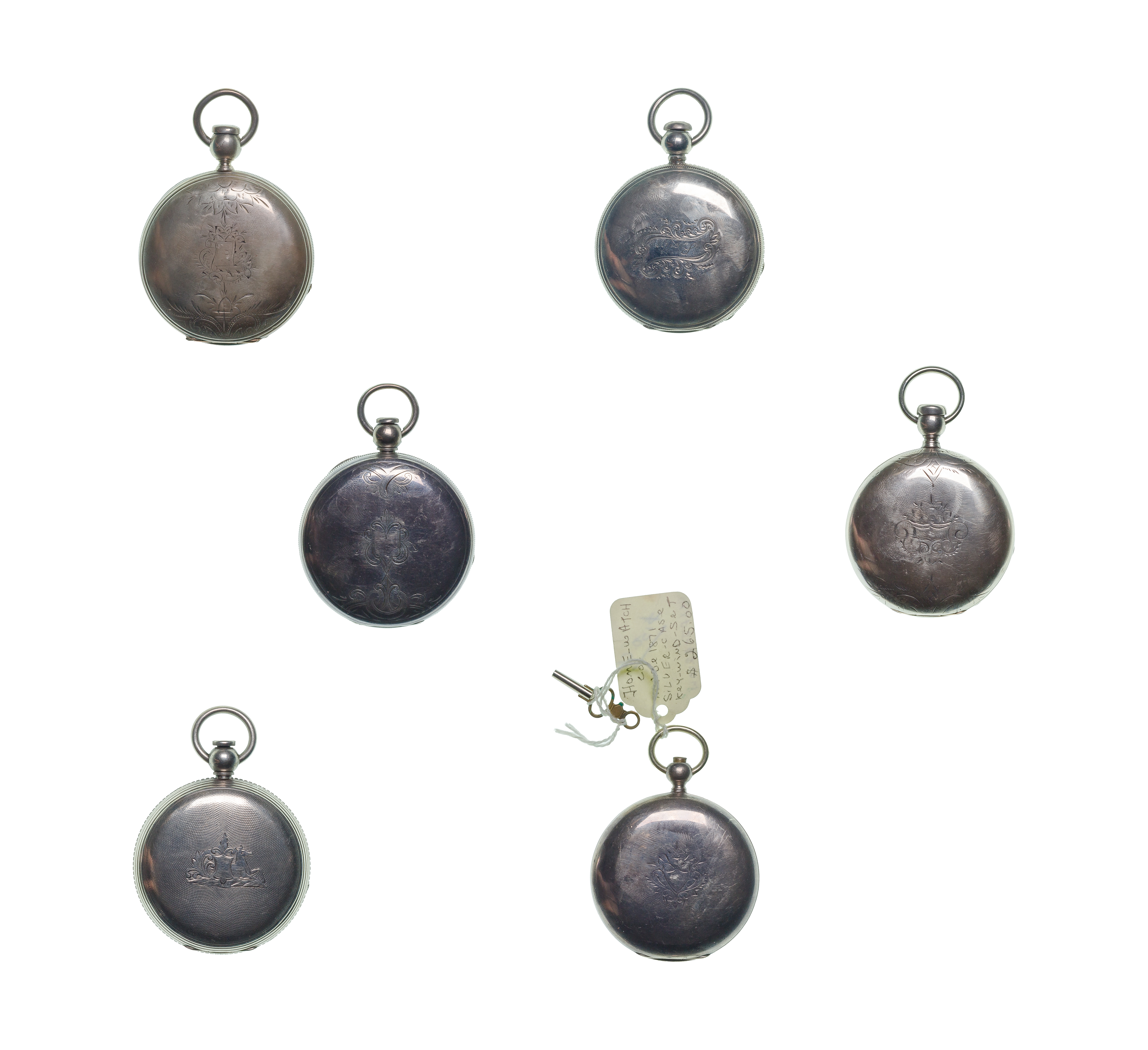 Condition: overall light to moderate wear consistent with normal use, some tarnish and scratches overall, all having stamped engravings, an American having a discolored crack on face, key wind running when tested, all others not running when tested