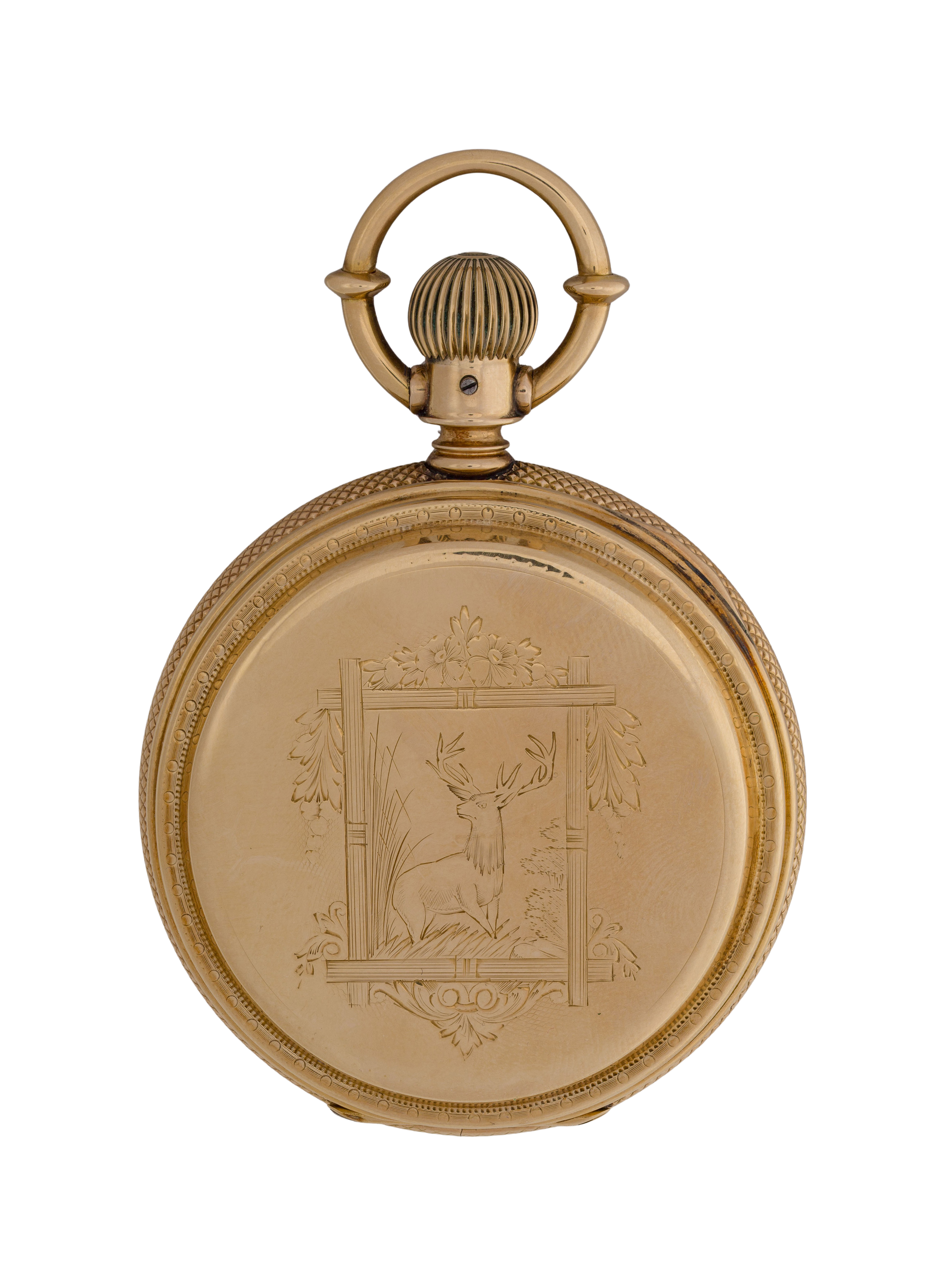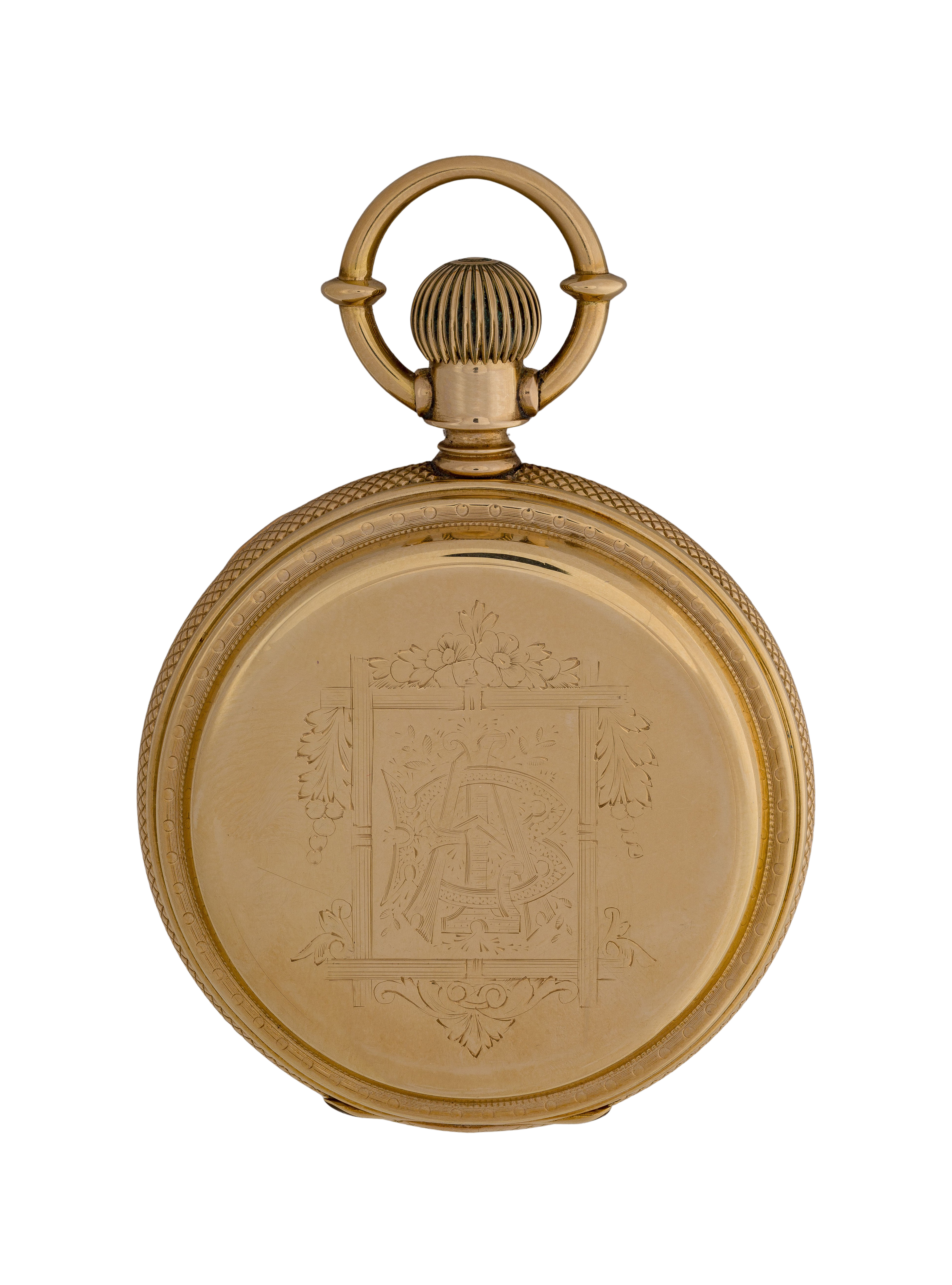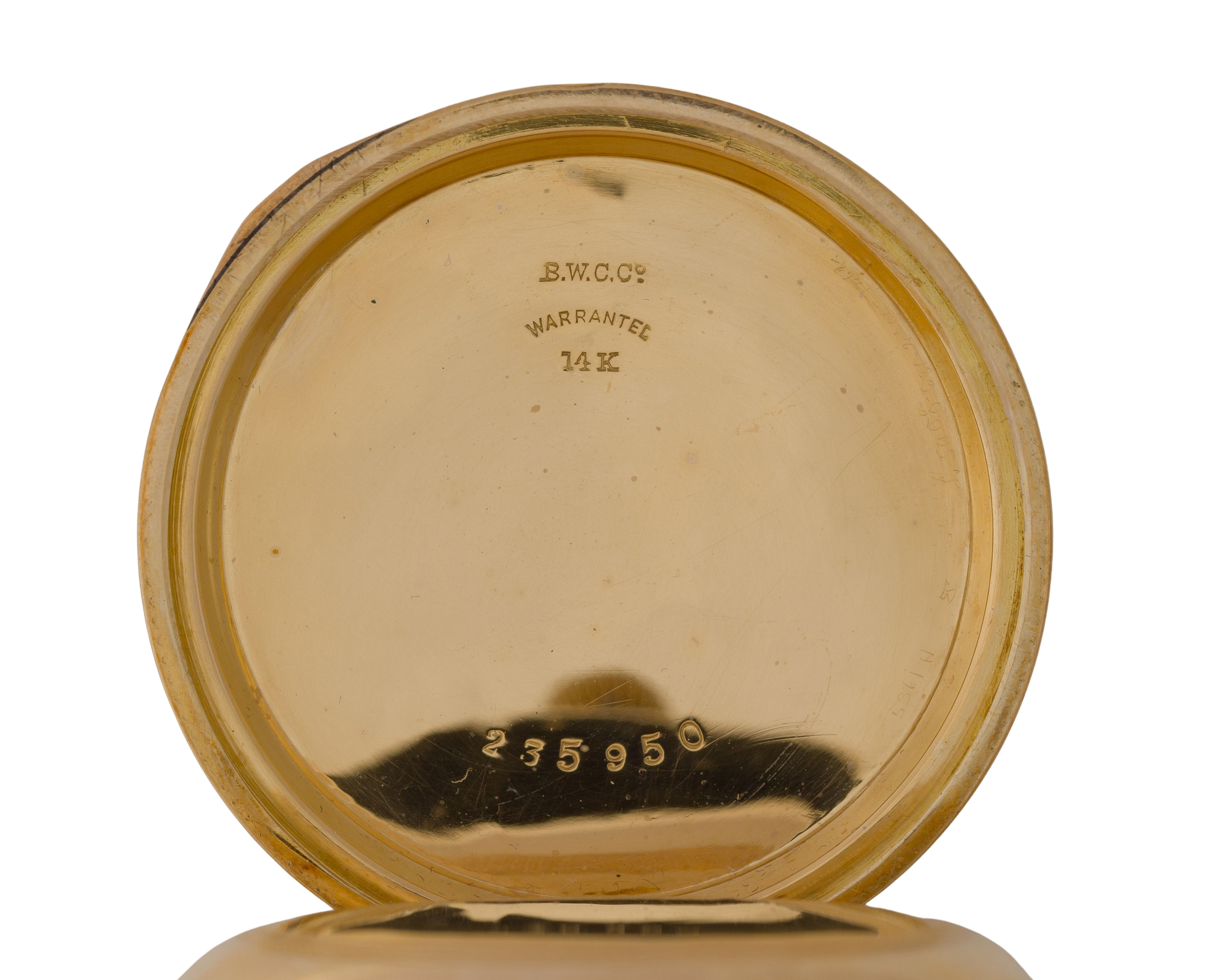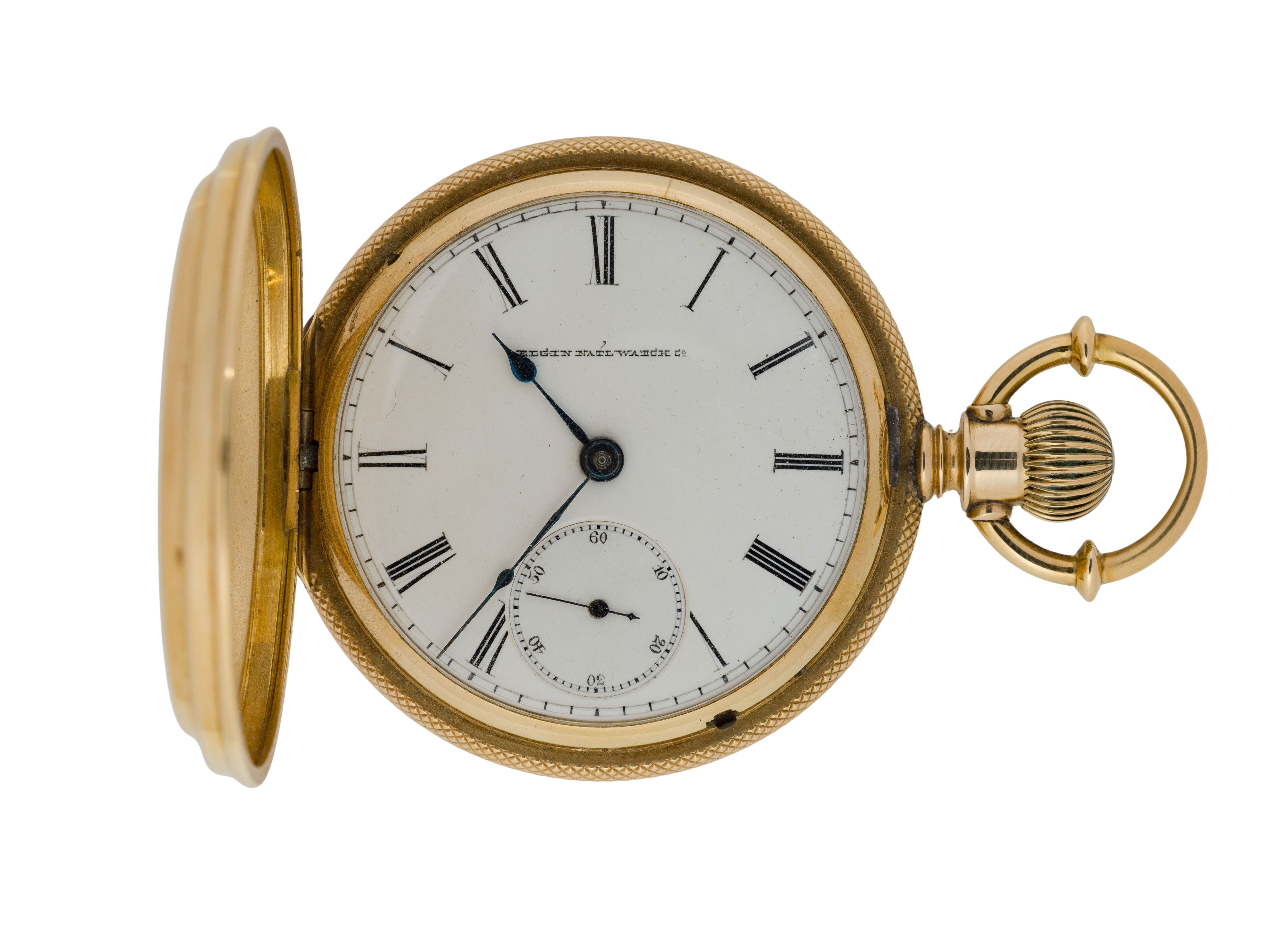 Serial #1230394, dating to c.1883, 11-jewel movement, grade 10, white dial having Roman numerals, blue hands, subsidiary dial for seconds, stem wind, lever set (marked ’14k Warranted’ inside case)