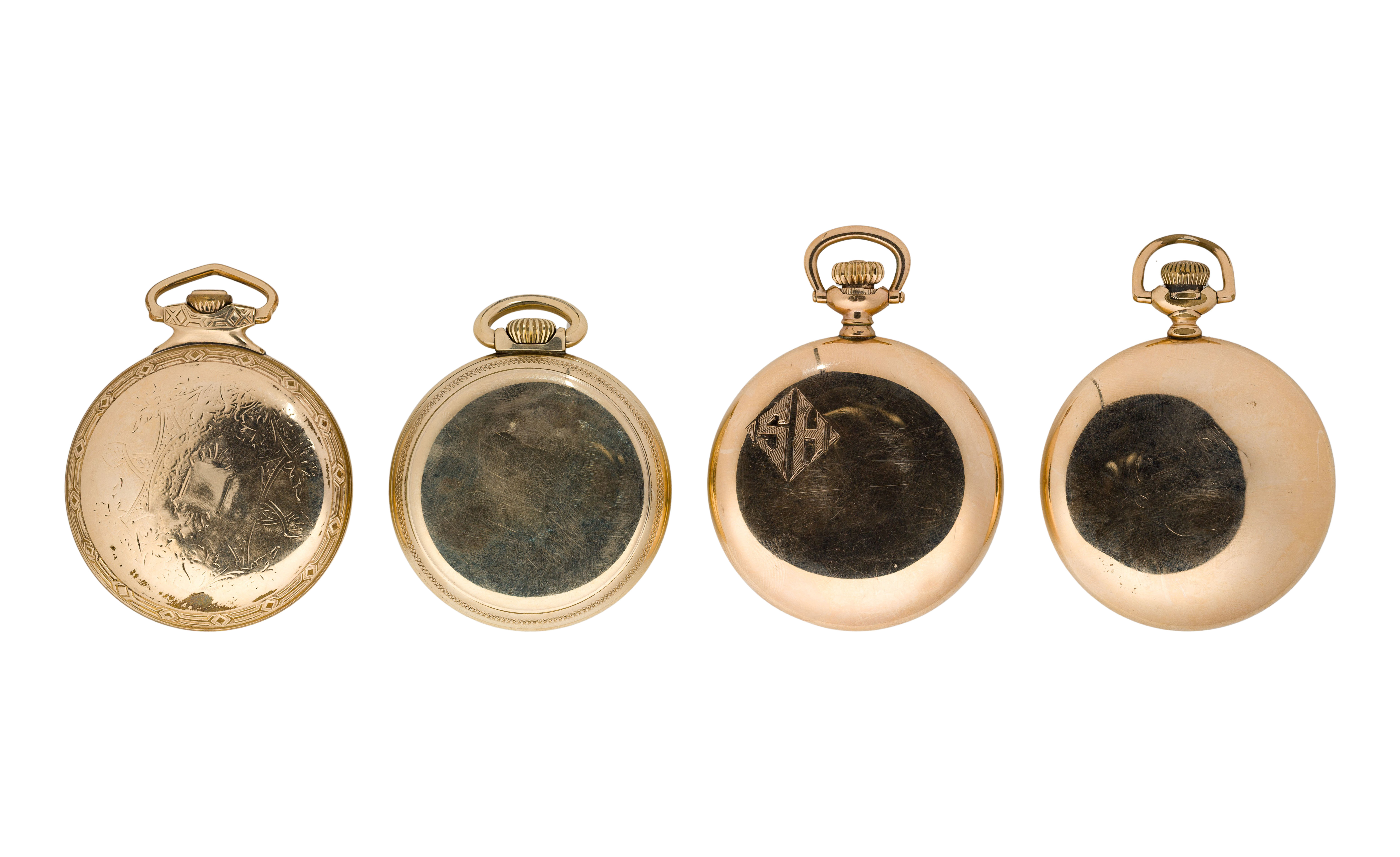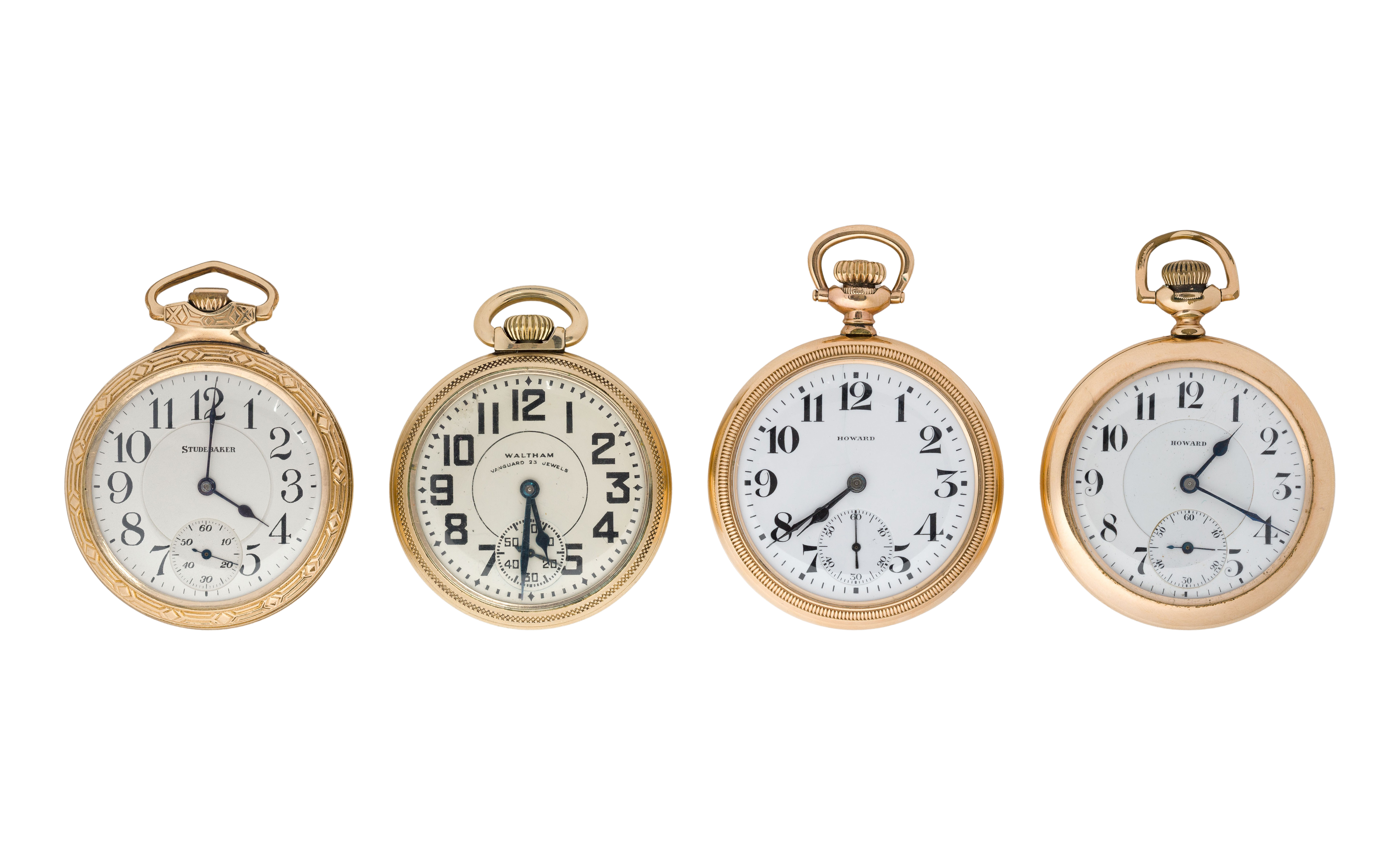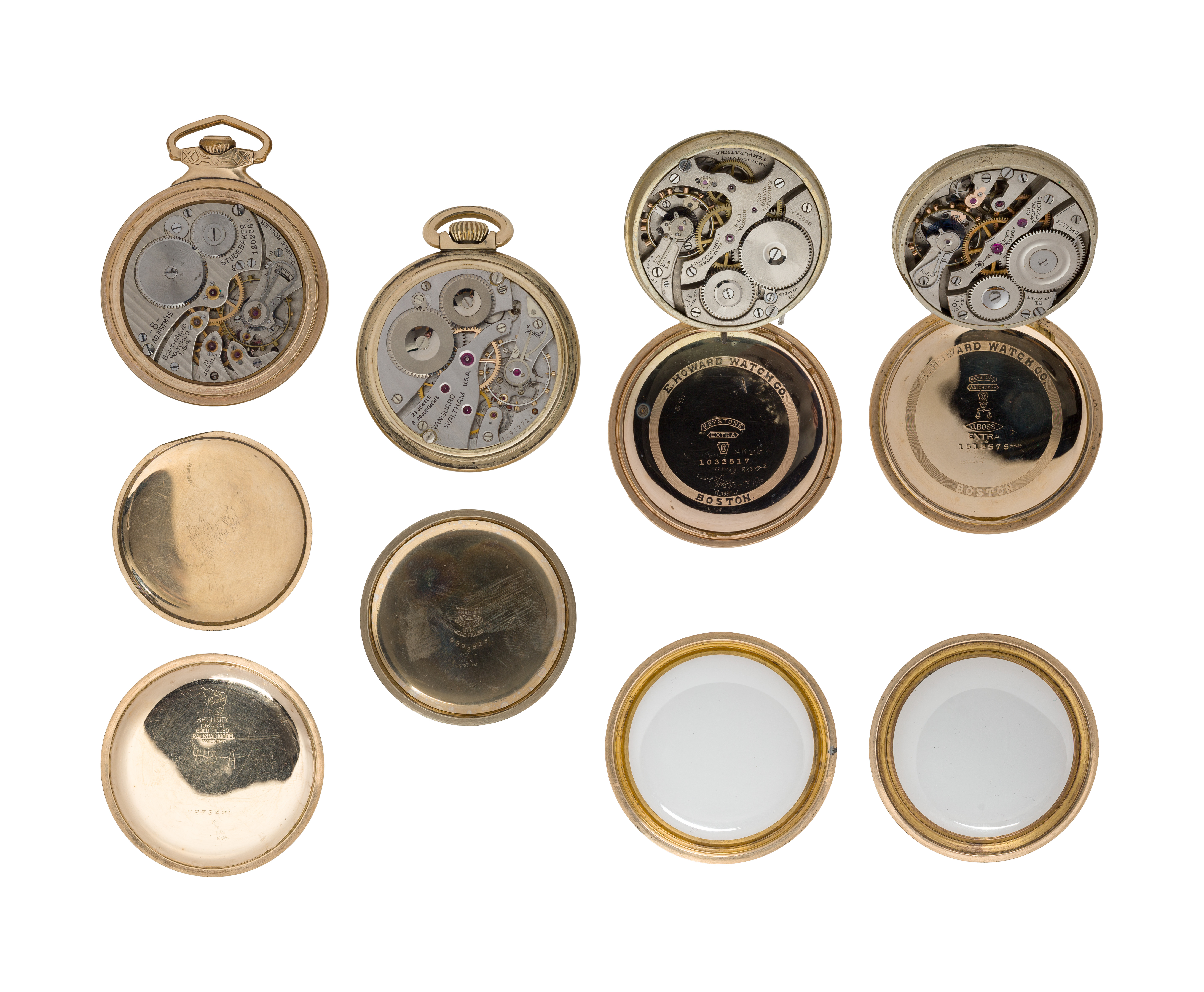 (4) items including an Waltham serial #32913714 dating to c.1947, 23-jewel movement, vanguard grade, a Howard serial #1171540 dating to c.1913, 21-jewel movement, series 10 grade, a Howard serial #1283853 dating to c.1915, 21-jewel movement, series 11 grade and a South Bend serial #1202060 dating to c.1927, 21-jewel movement, Studebaker grade, all in gold-filled or rolled gold cases