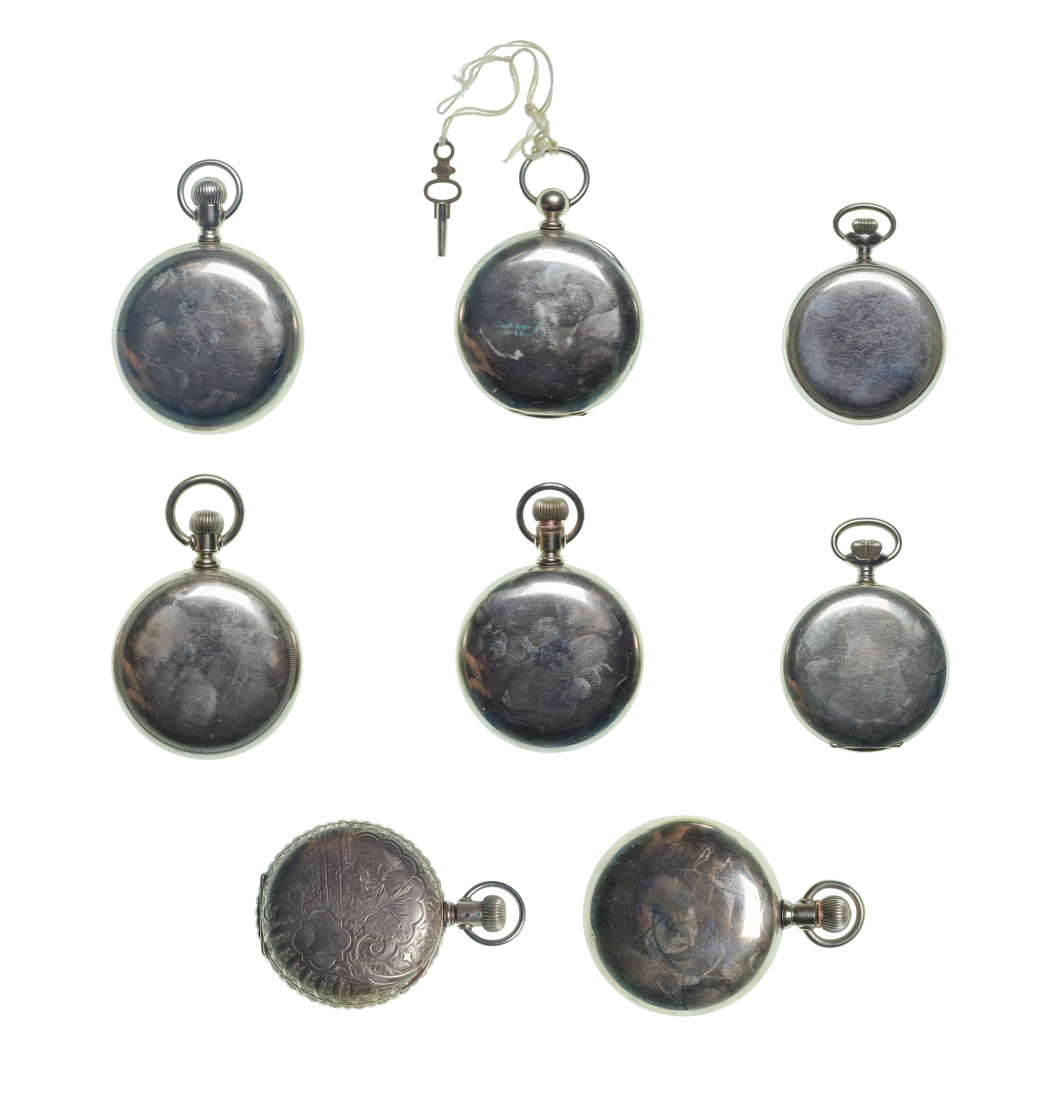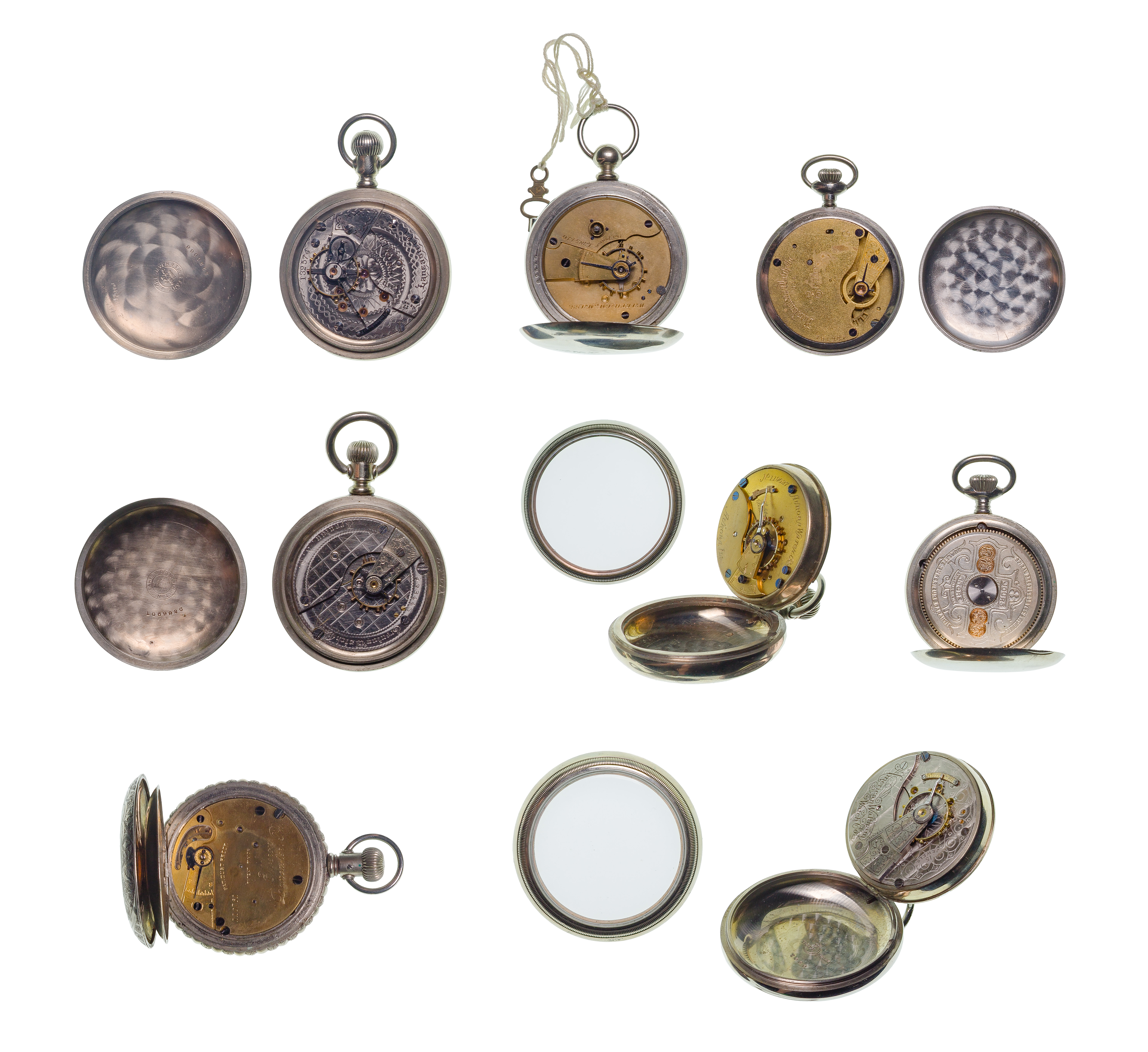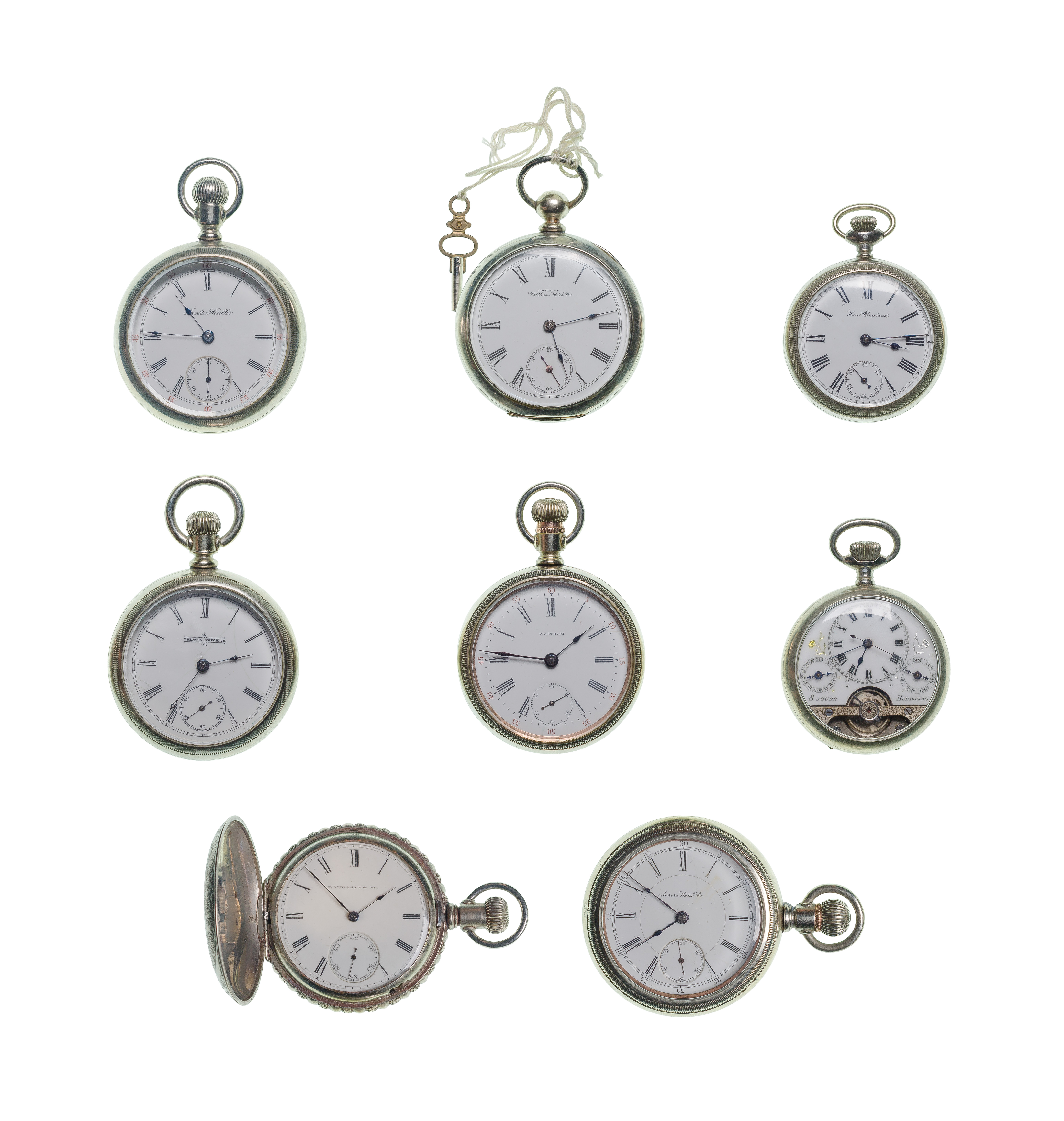 (8) items including a Waltham serial #11785172, a Waltham serial #1,385410, a Elberon serial #110761, a Hamilton serial #132574, a Trenton Watch Co. serial #433446, an Aurora Watch Co. serial #119627, a New England serial #486704 and a Hebdomas 8-day movement having no serial number