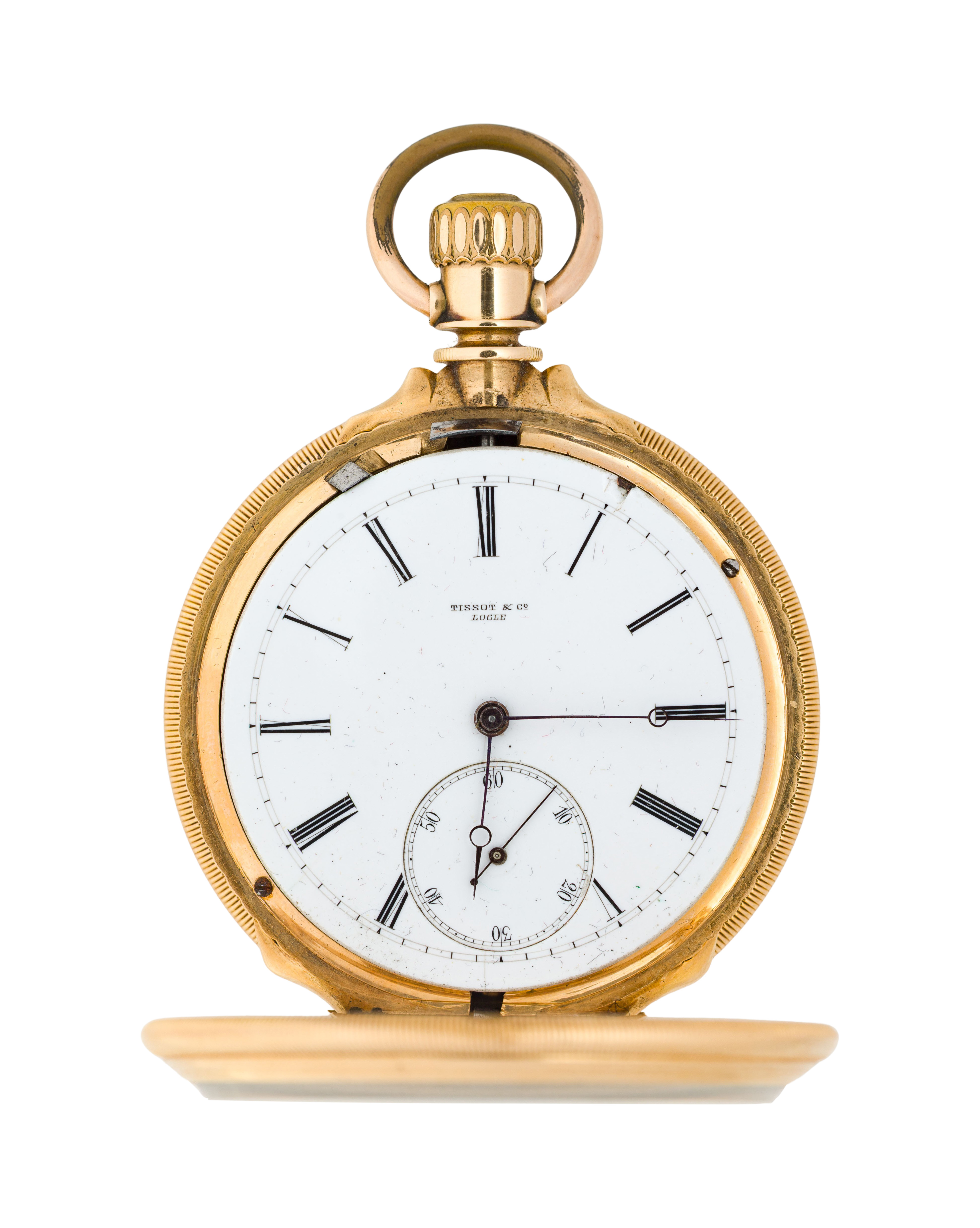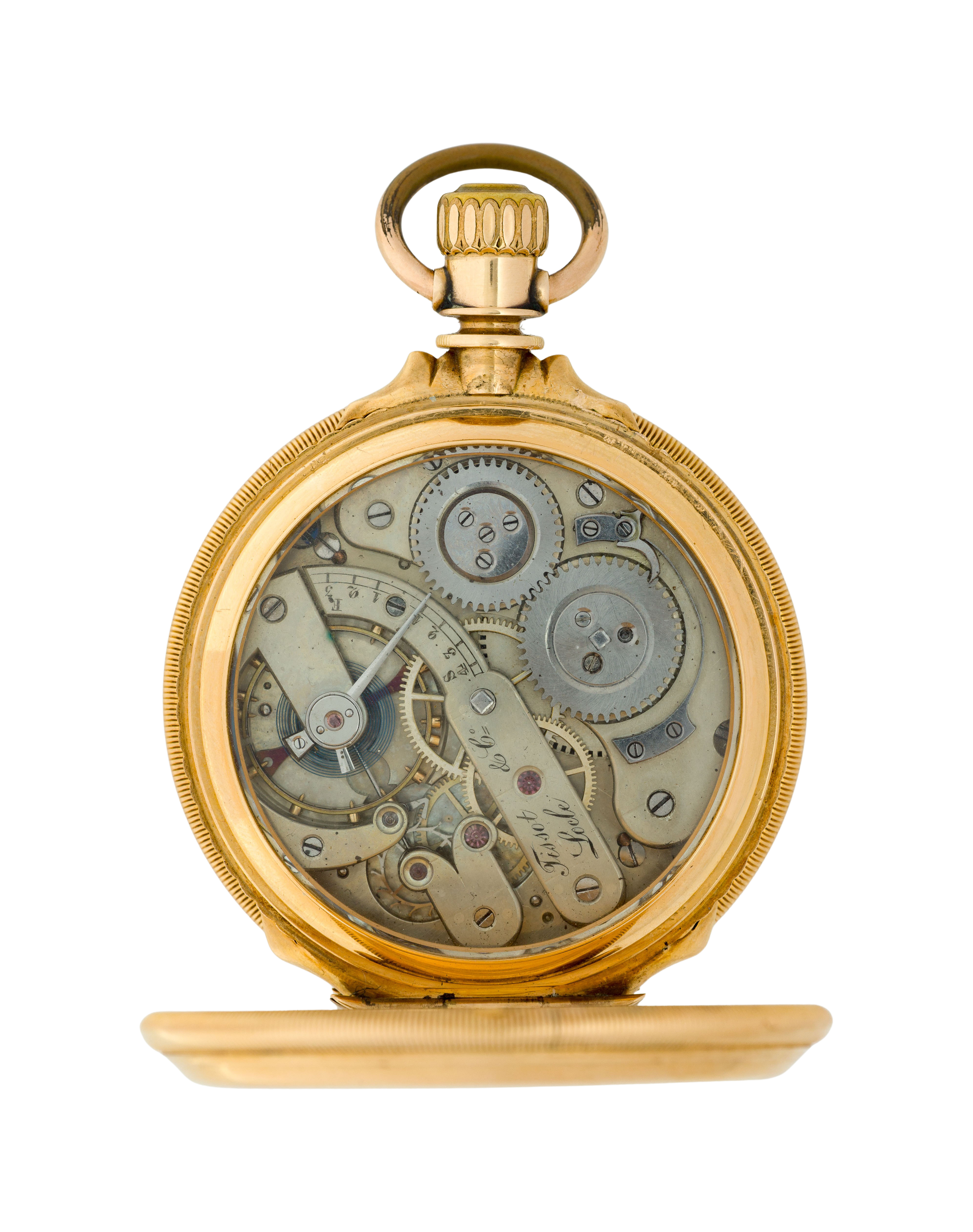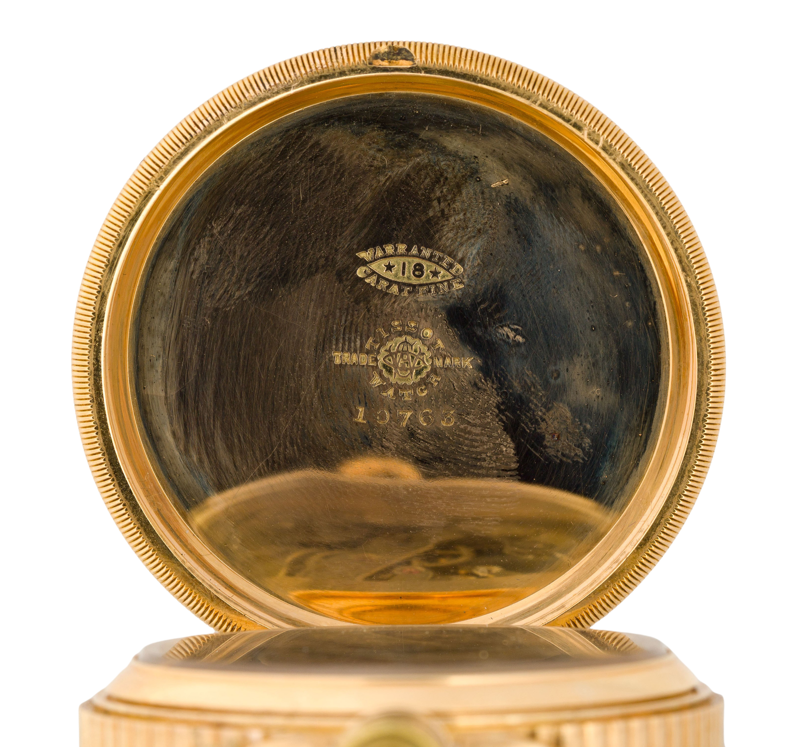 Serial #10763 to the case, white dial having Roman numerals, blue hands, subsidiary dial for seconds, stem wind (marked ‘Warranted 18 Carat Fine’ inside case)