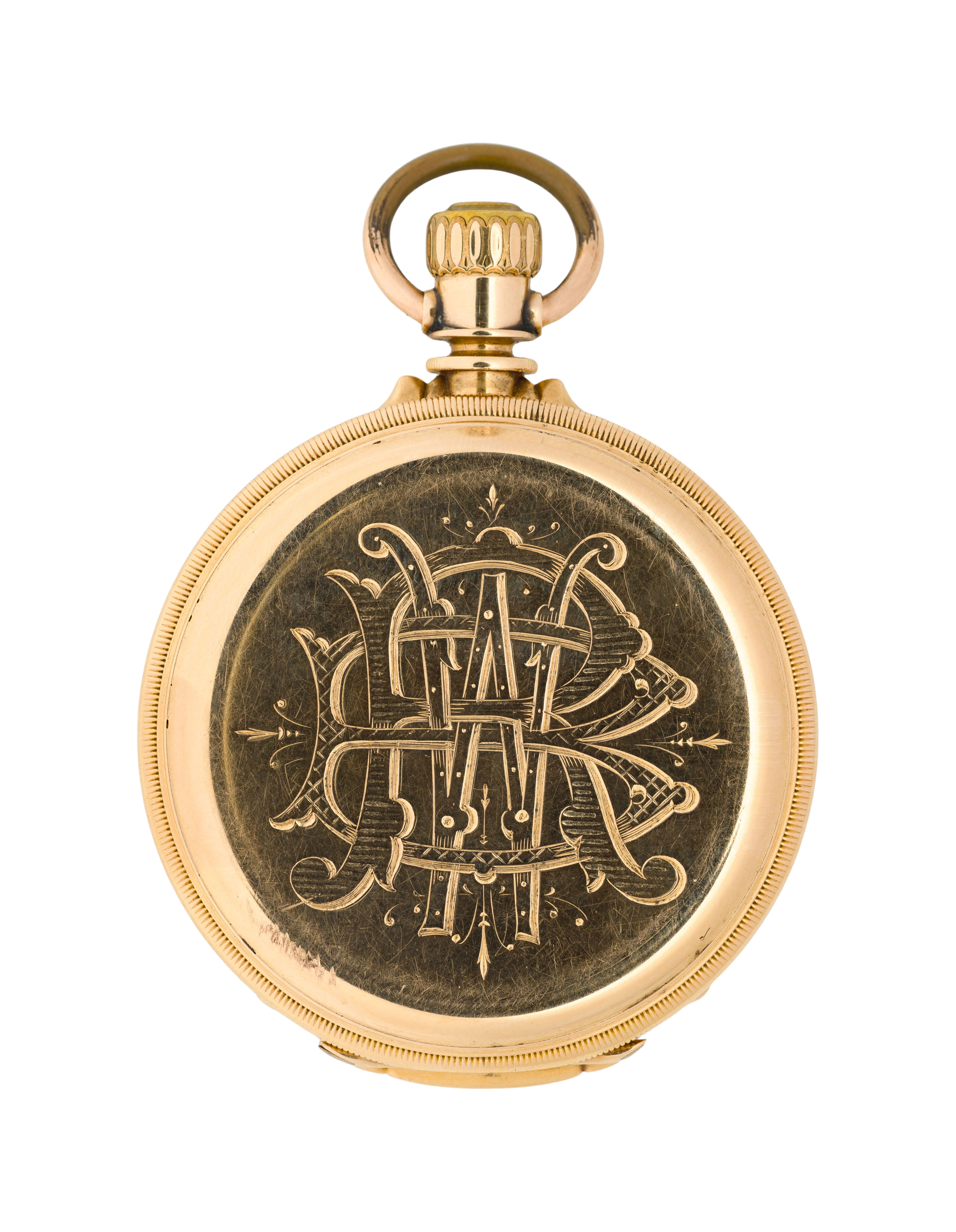Condition: running when tested, edge of dial chipped, monogrammed on back of case, bow not gold