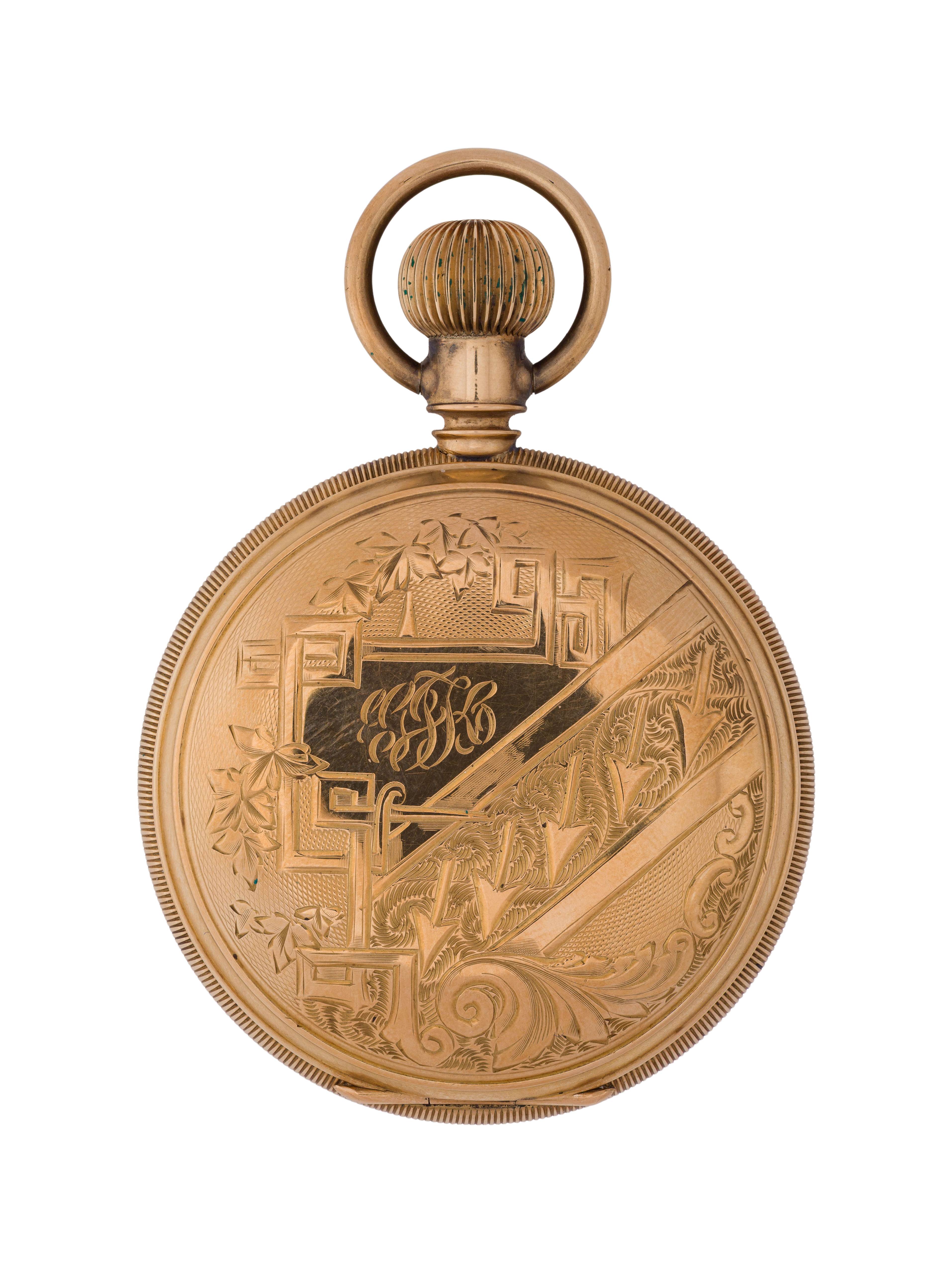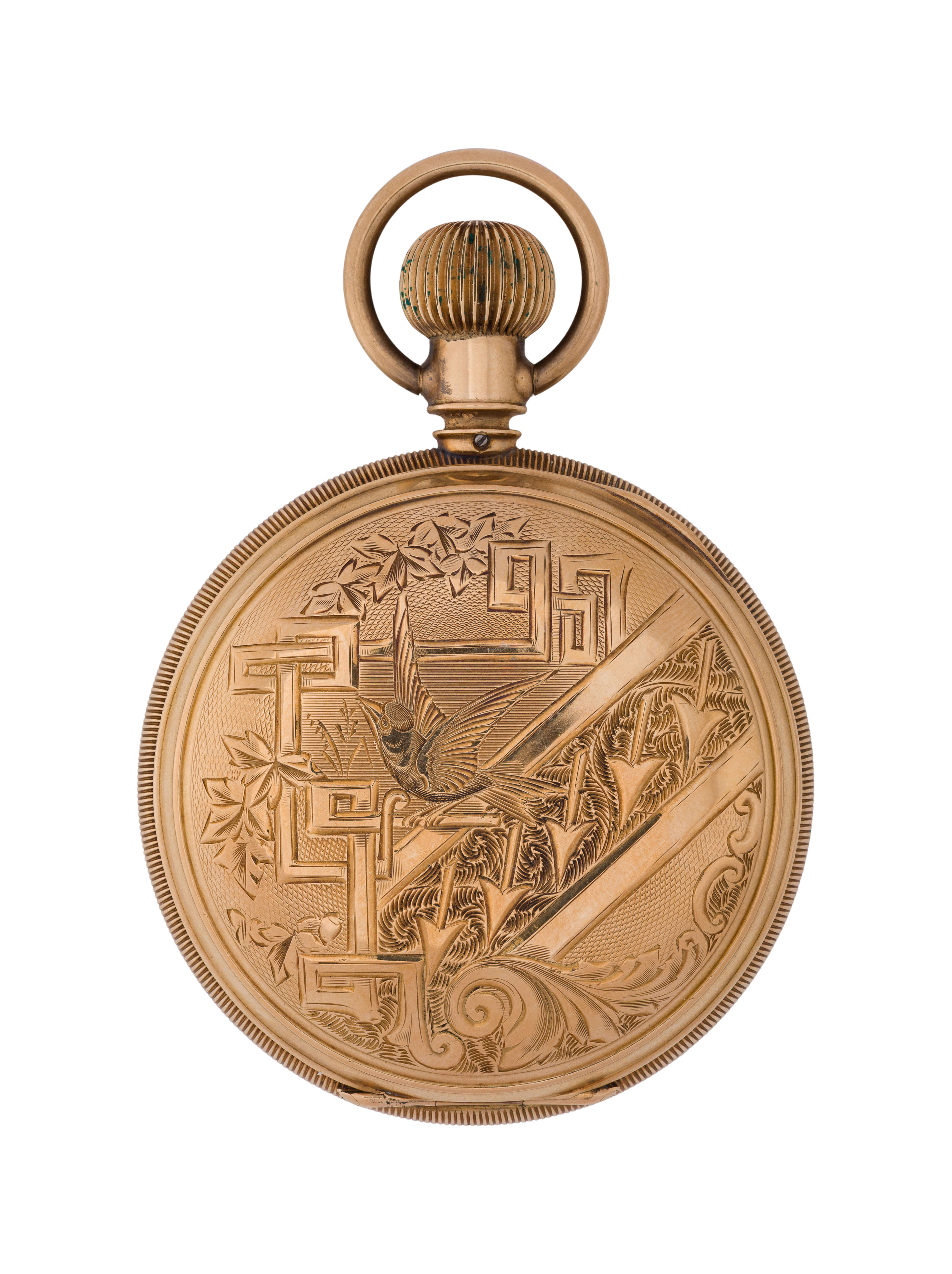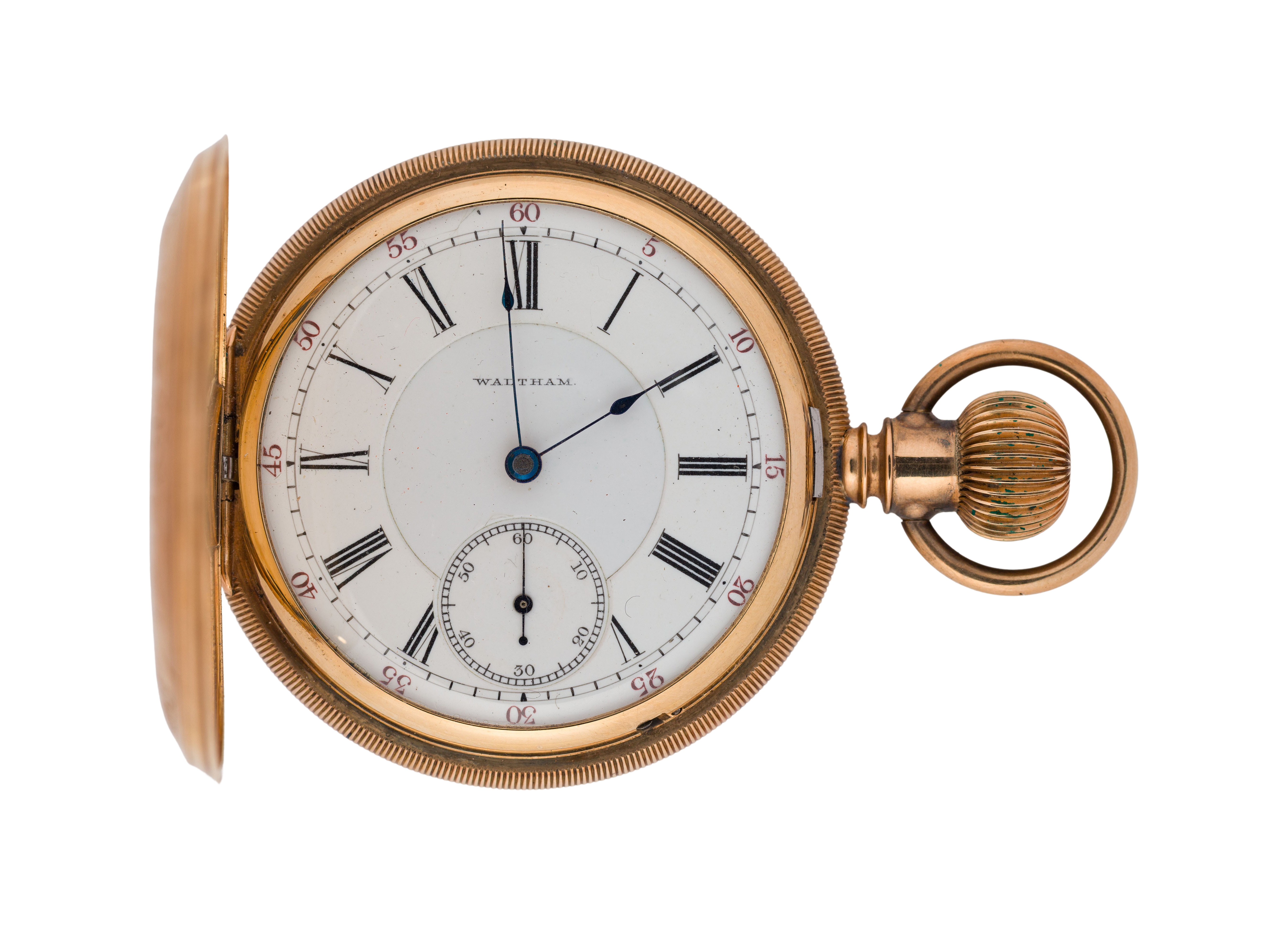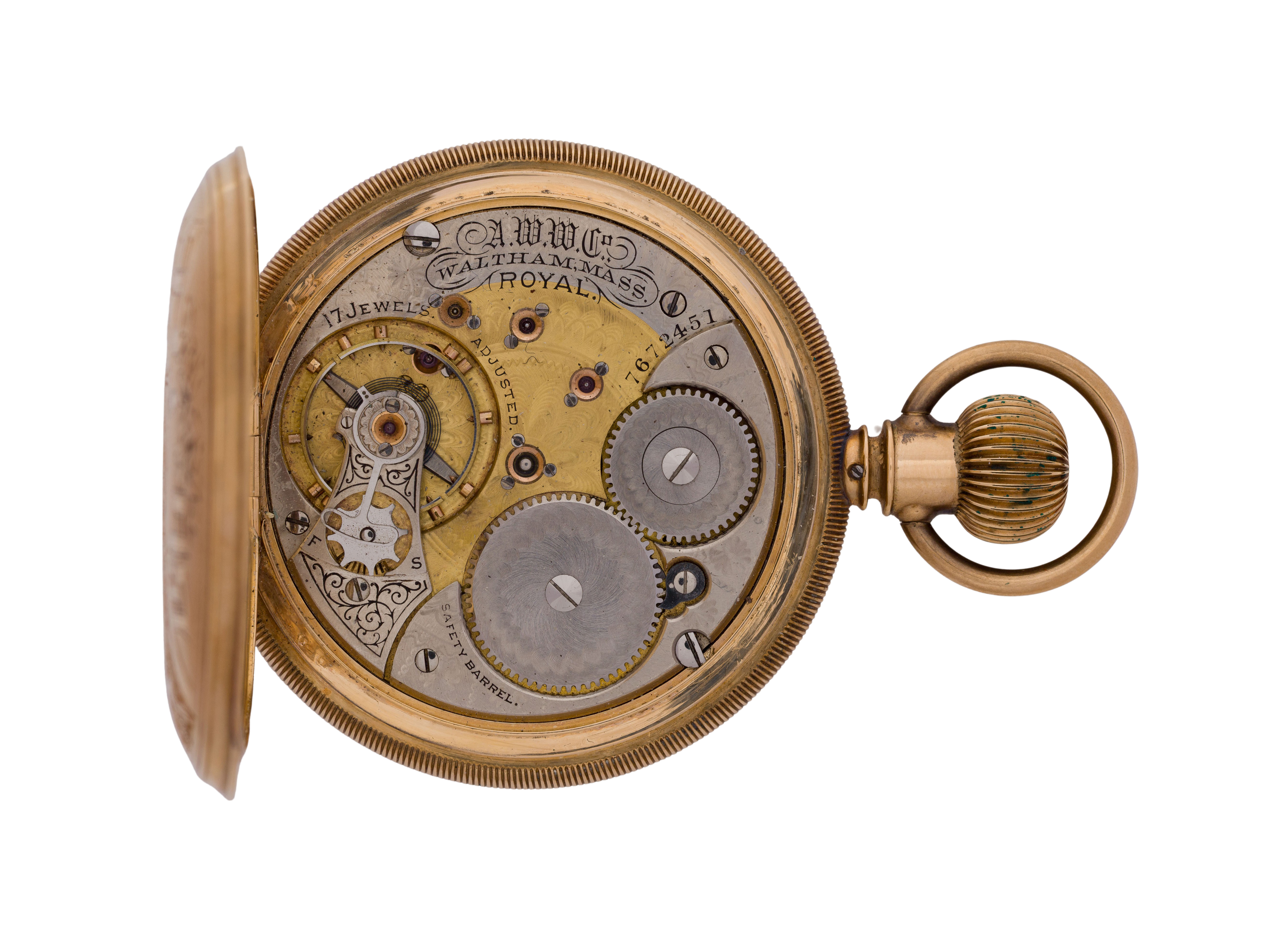 Serial #7672451 dating to c.1896, 17-jewel movement, Royal grade, white dial having Roman numerals, blue hands, subsidiary dial for seconds, stem wind, lever set (marked ‘Warranted 14k U.S. Assay’ inside case)