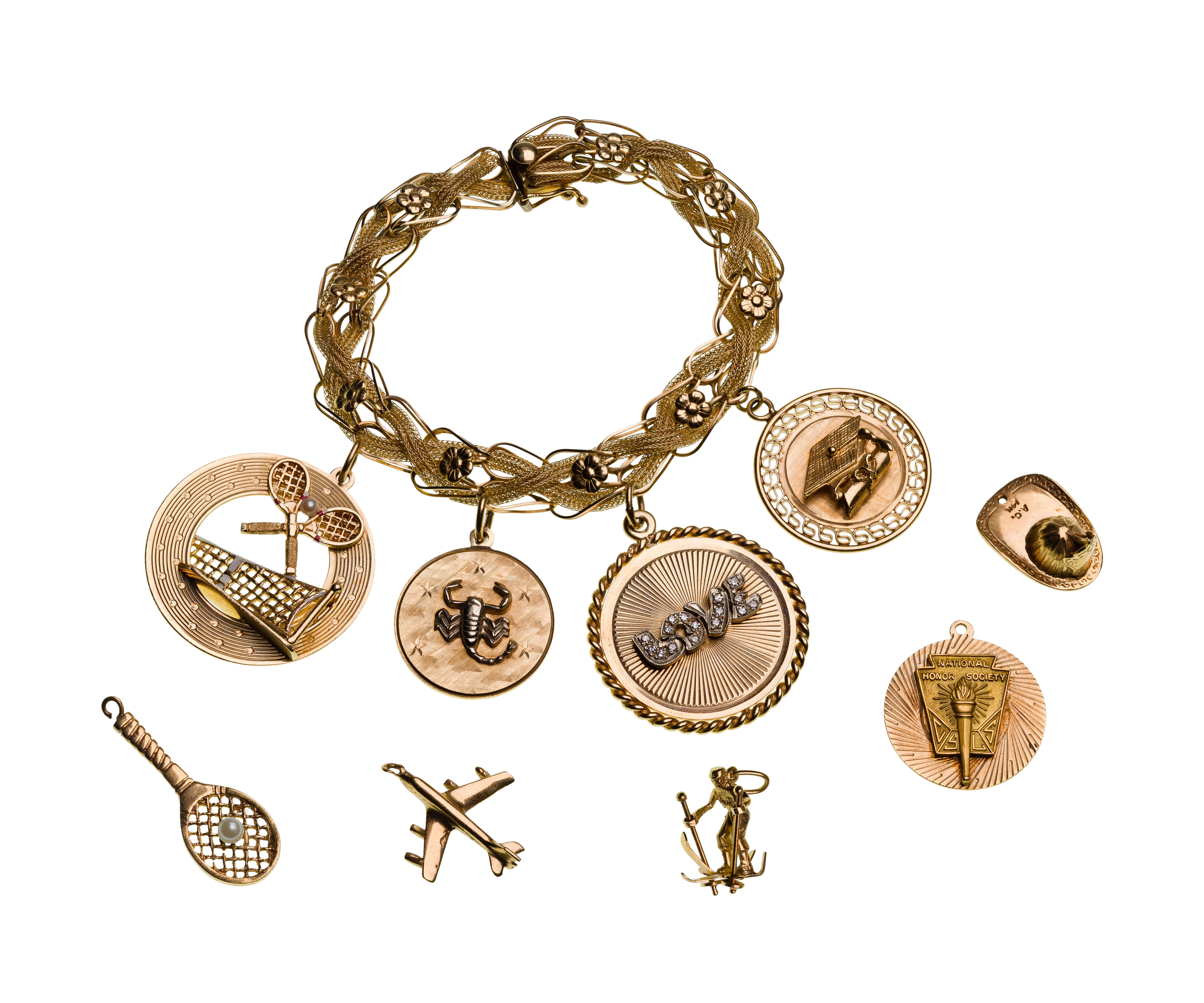A woven flower link bracelet having four attached charms, some having diamond accents and (5) loose charms (all marked ’14k’)