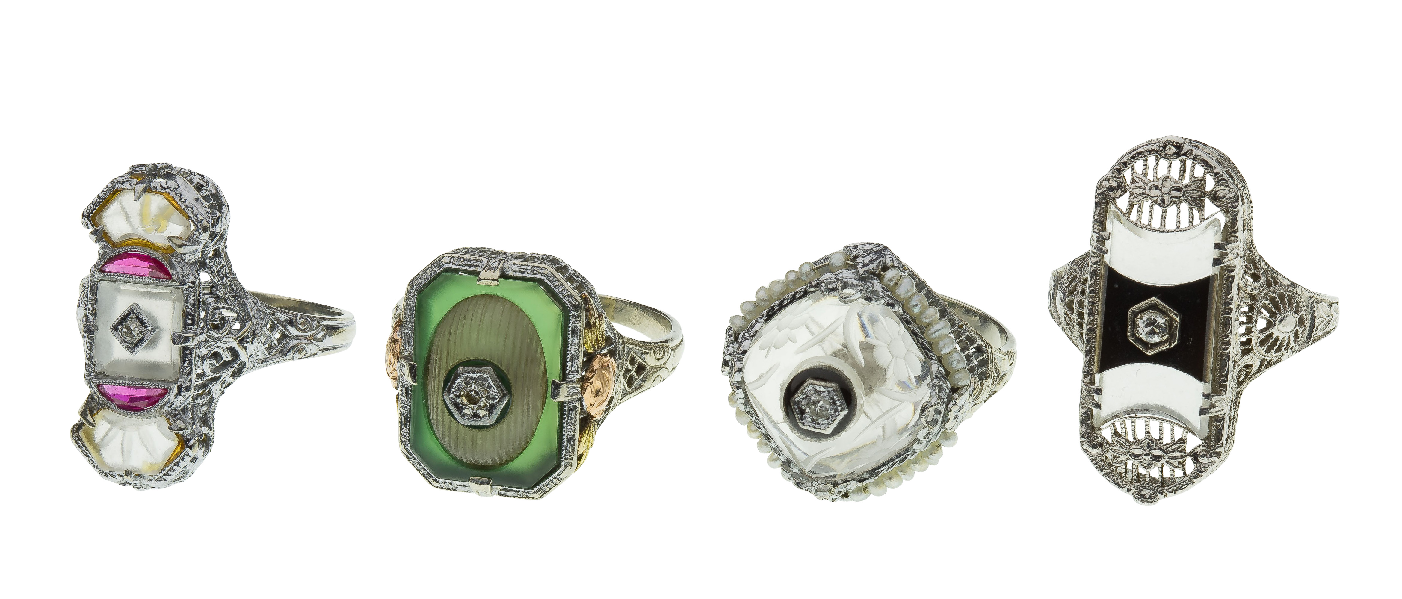 Art Deco 14k White Gold, Rock Crystal, Gemstone and Diamond Rings