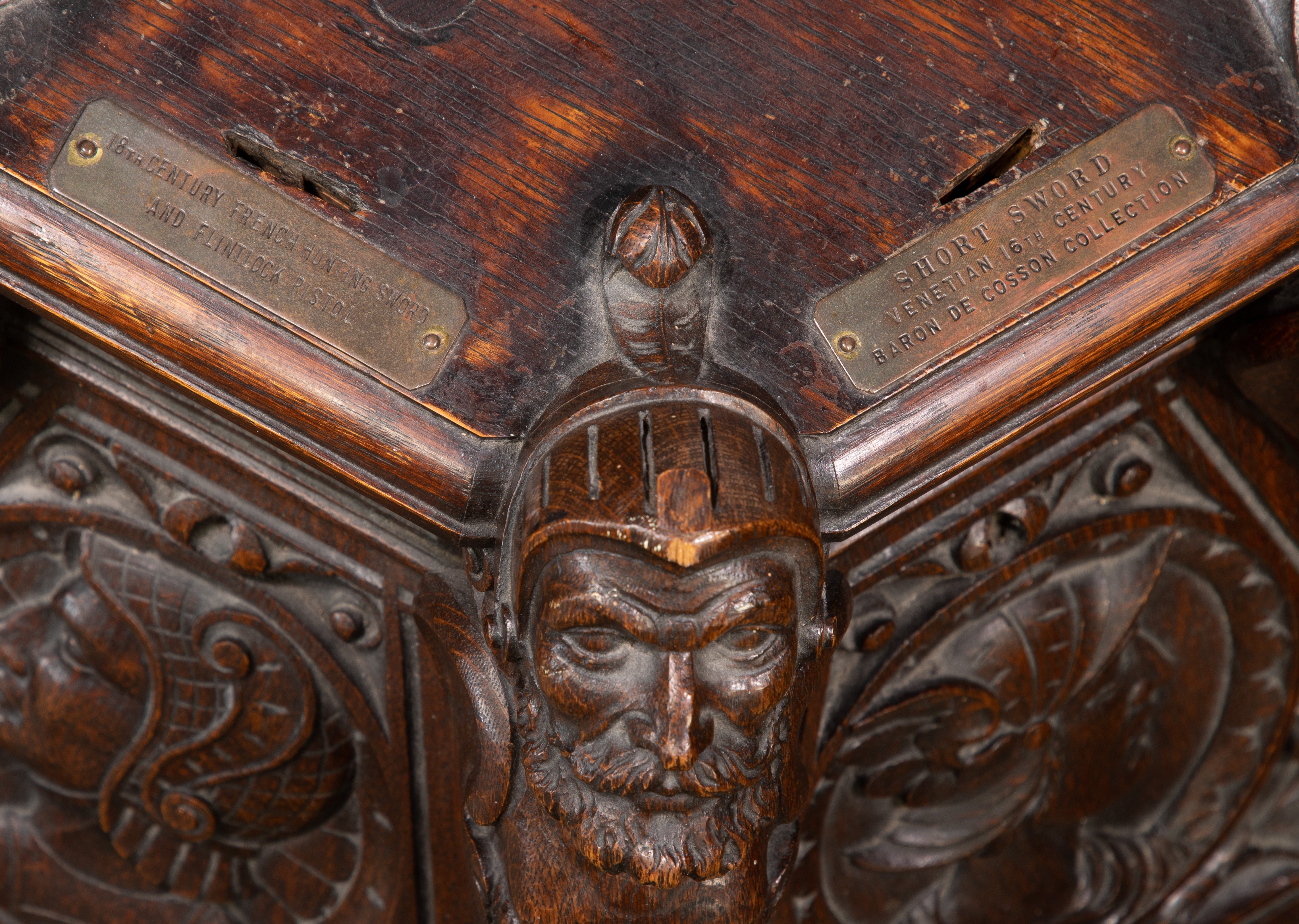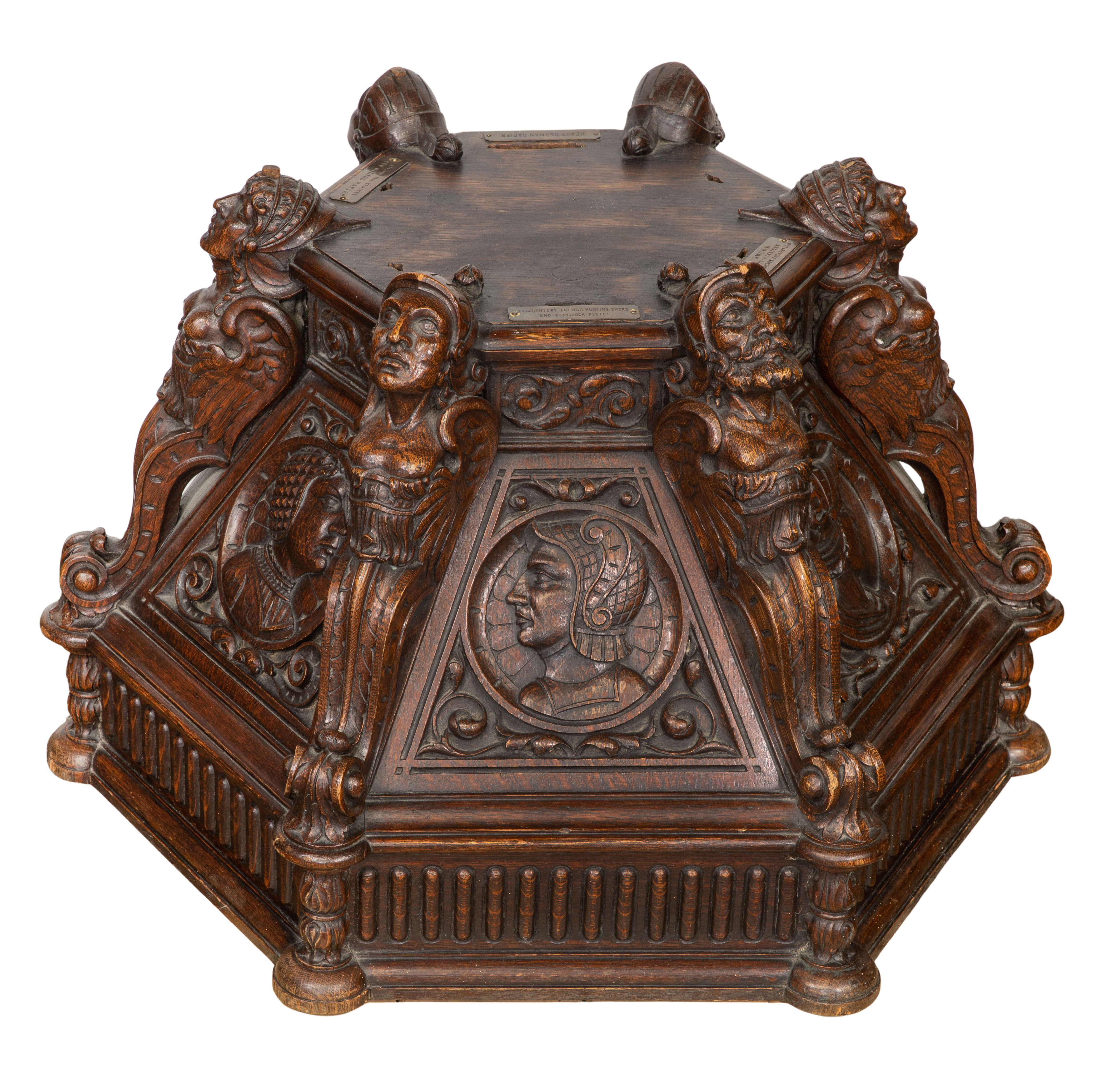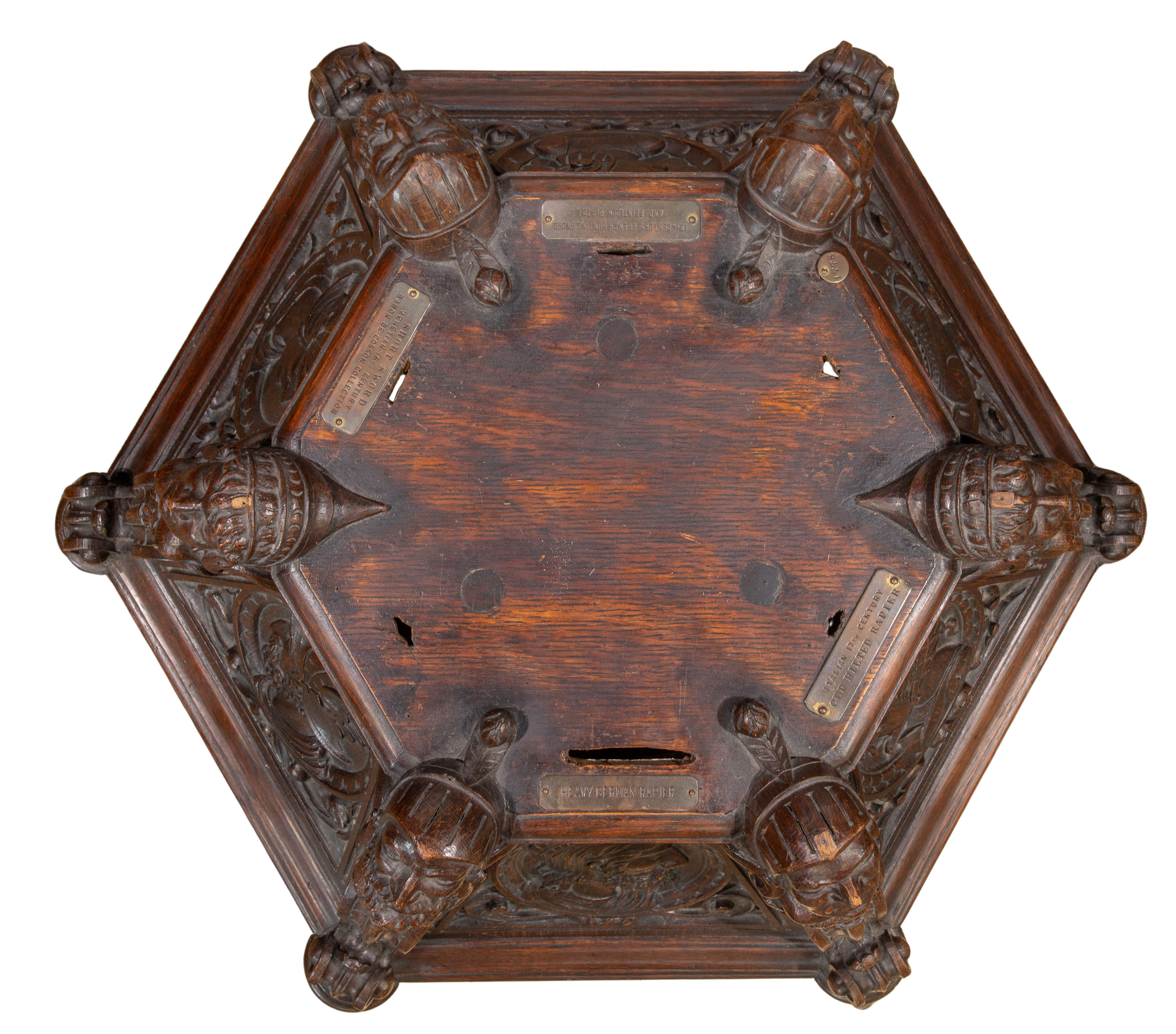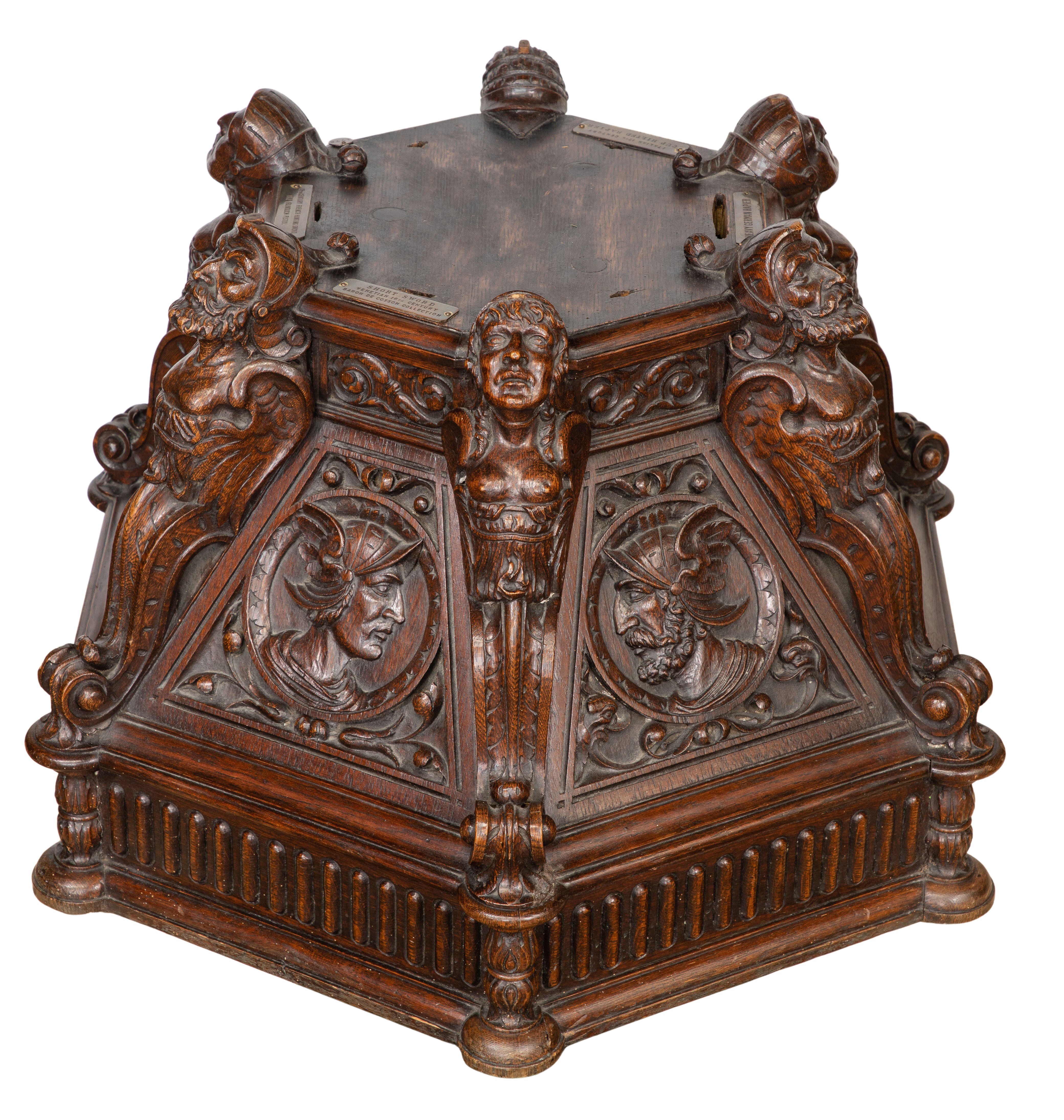 Having deep carved sculptural Renaissance style motif throughout, cut-out slots for six swords and a brass plaque referencing the Baron De Cosson Collection, bottom marked ‘The Hayden Company, New York’