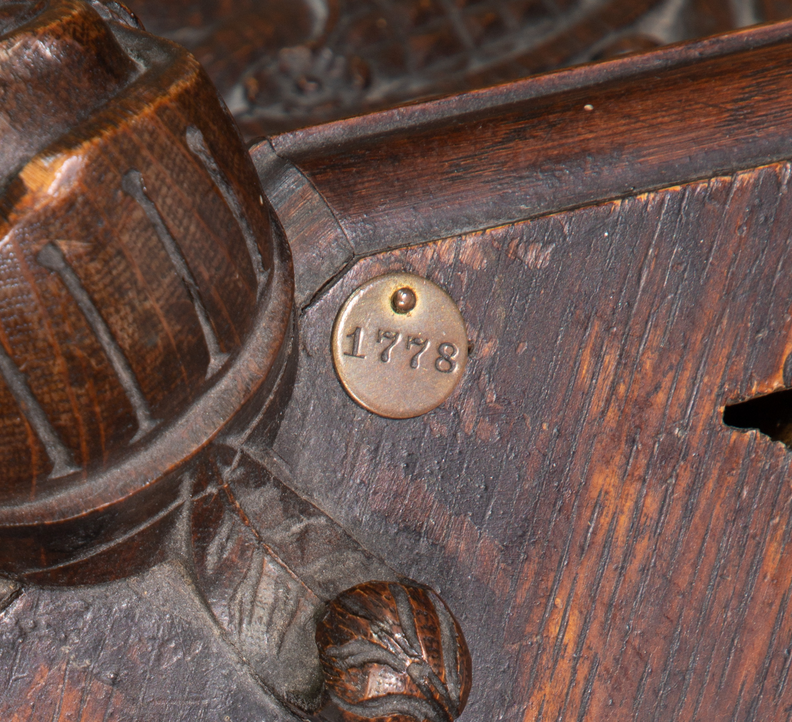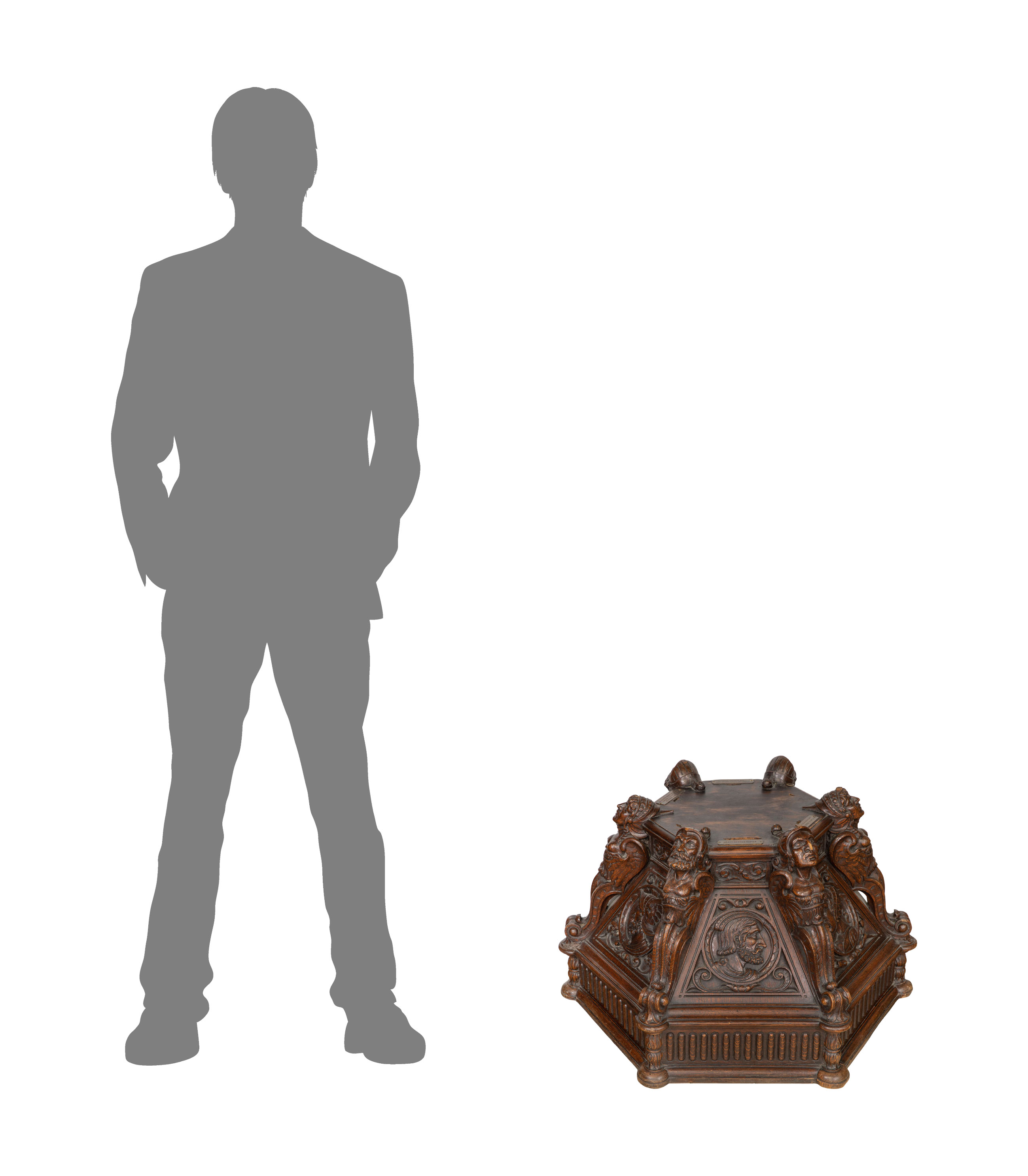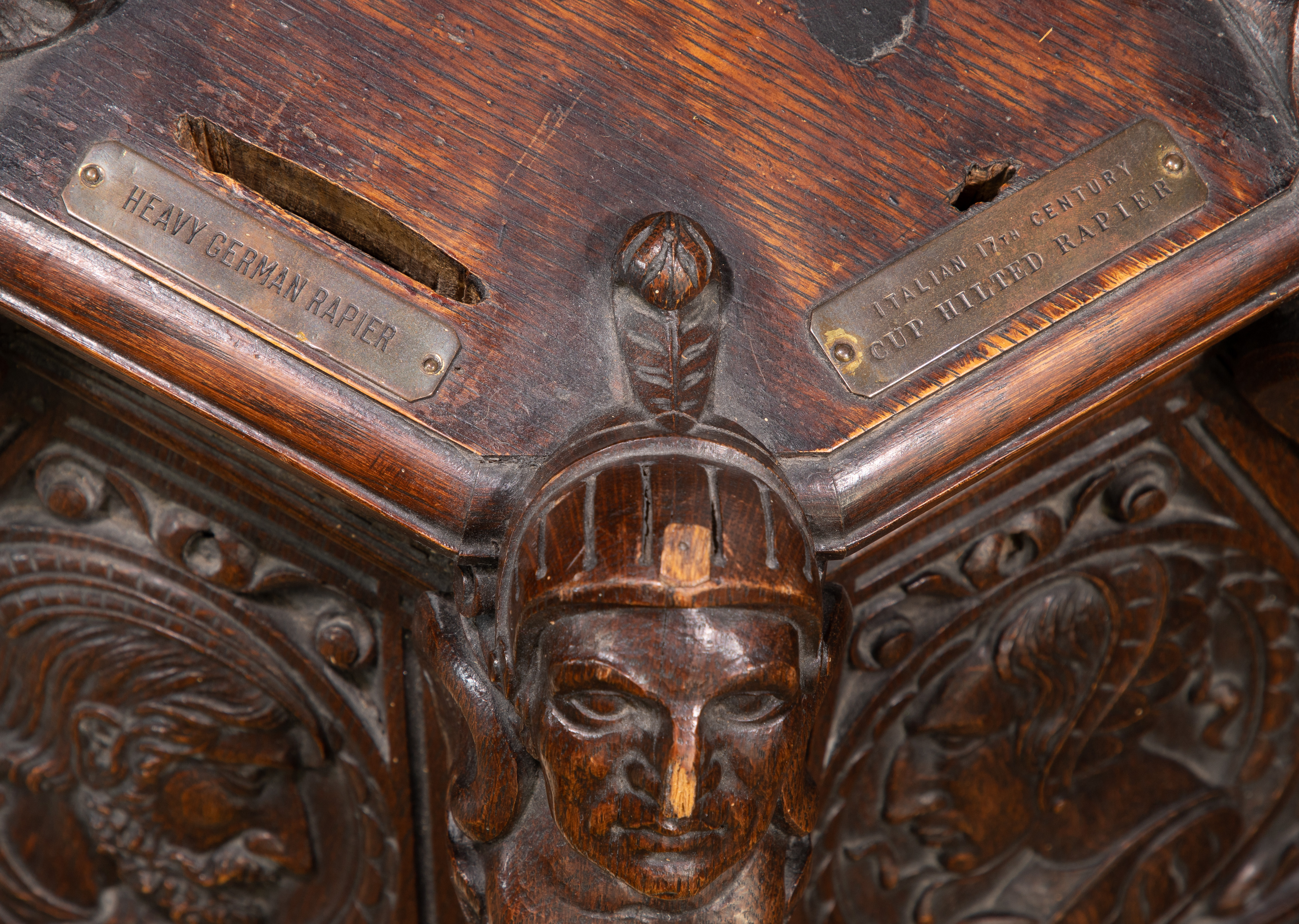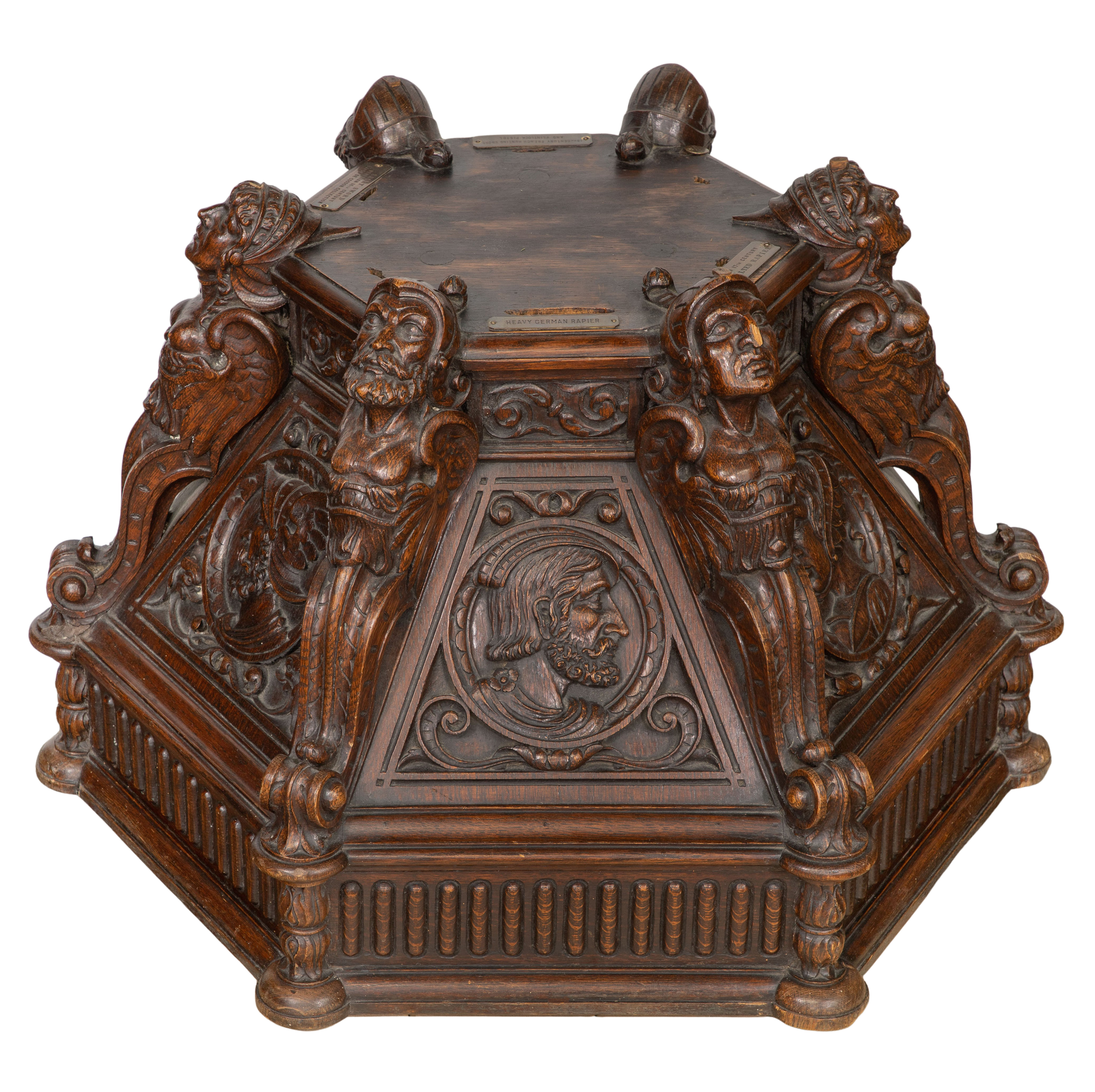 Having deep carved sculptural Renaissance style motif throughout, cut-out slots for six swords and a brass plaque referencing the Baron De Cosson Collection, bottom marked ‘The Hayden Company, New York’