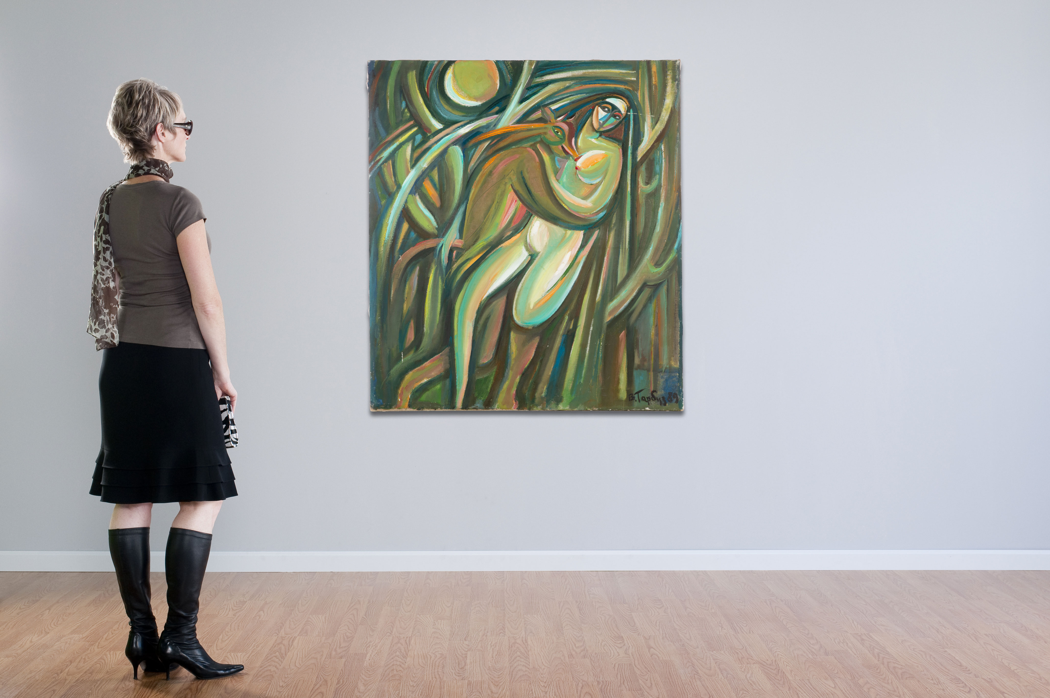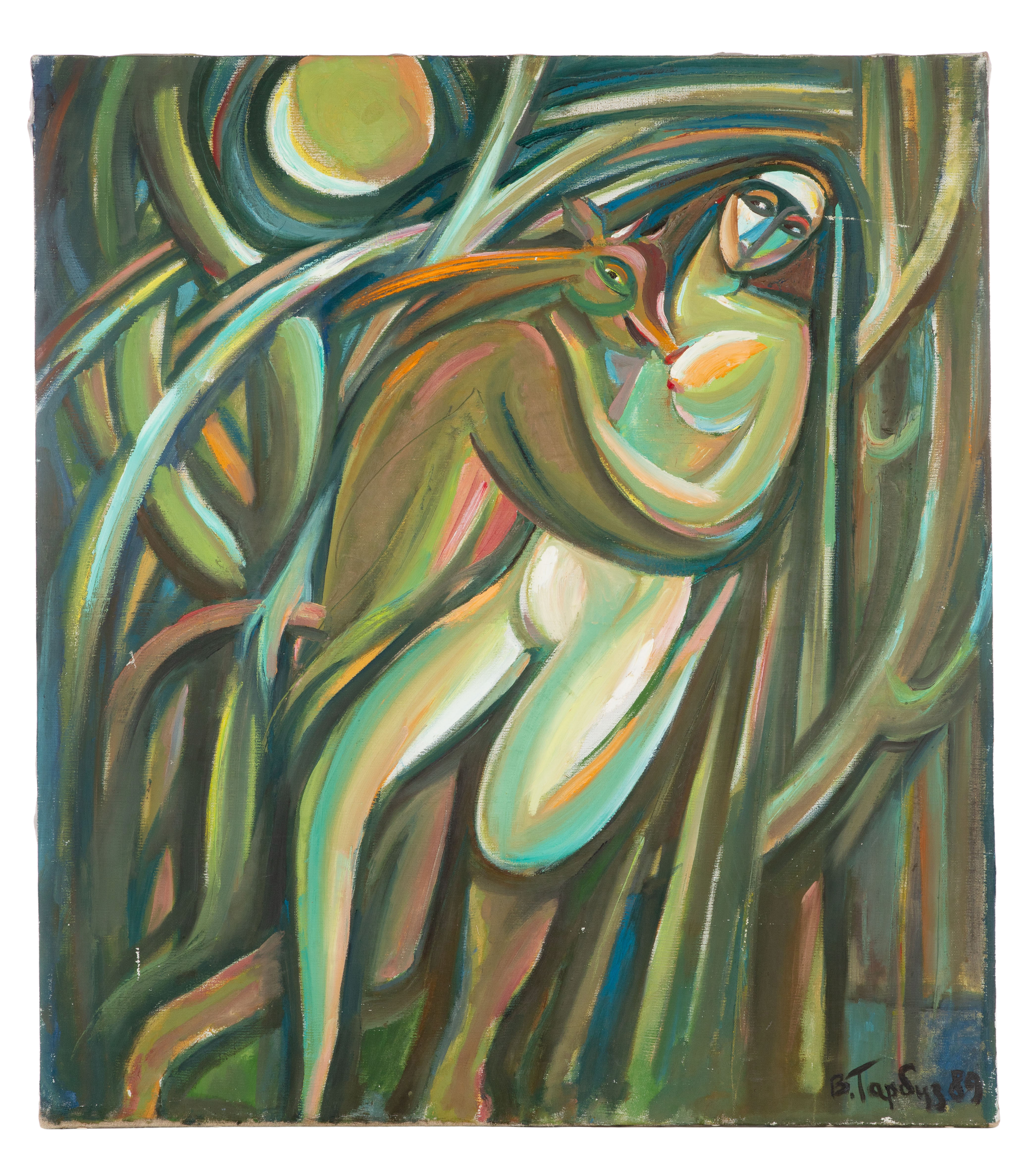 1989, signed abstract depiction of human form, unframed