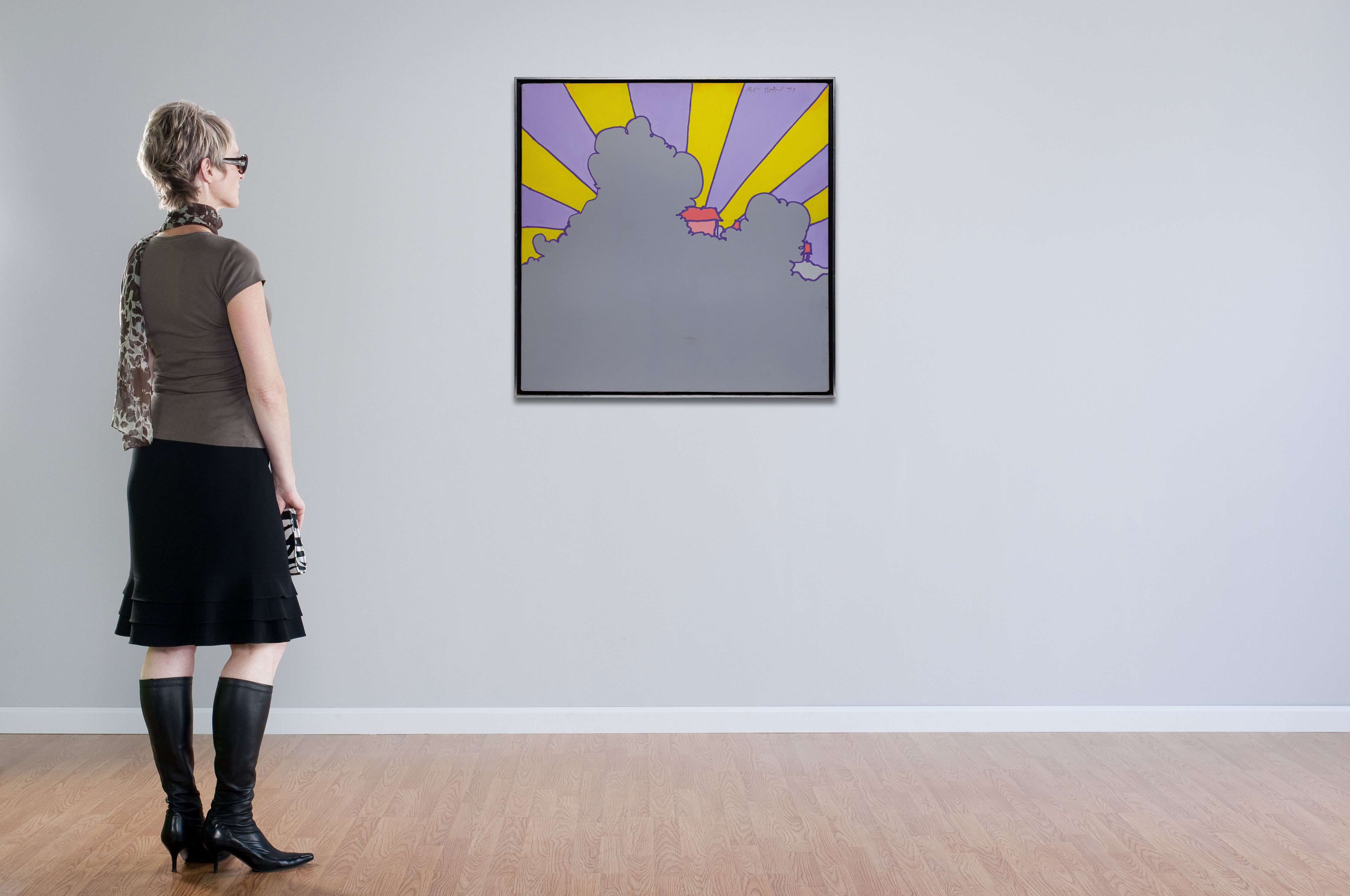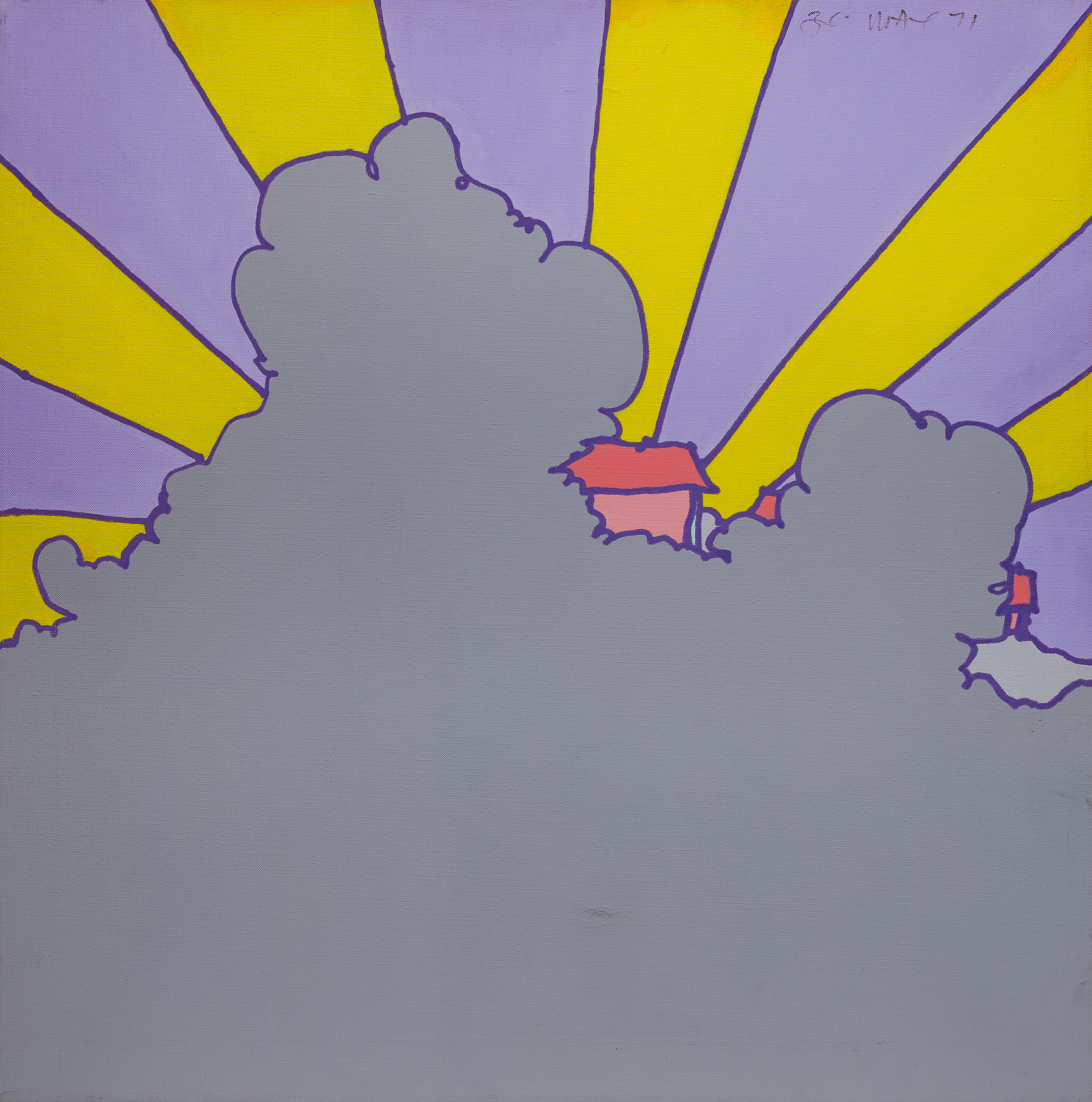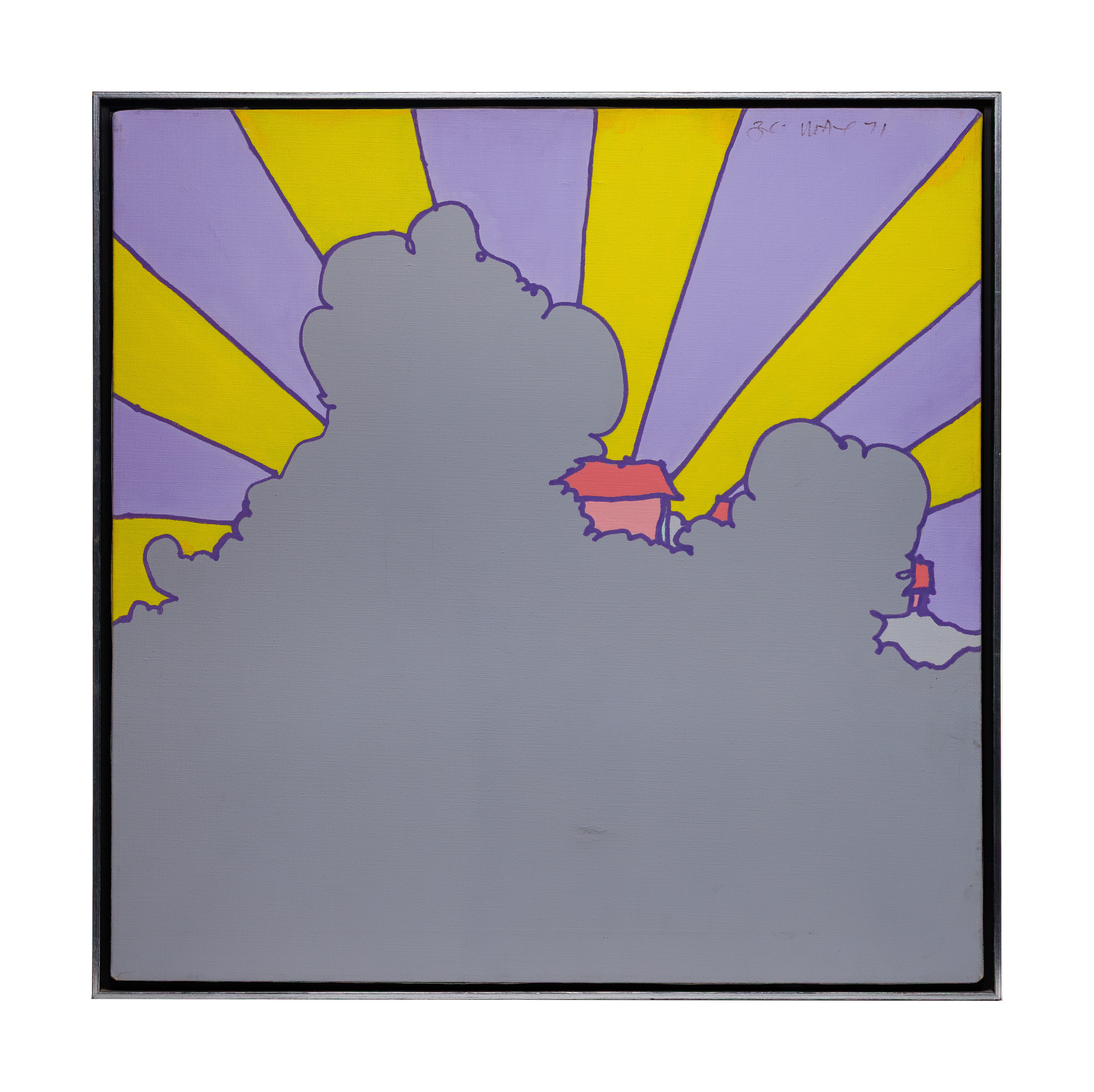 1971, signed and dated upper right, depicting sunbeams radiating from behind a cloud, float mounted in a silver-tone faced wood frame