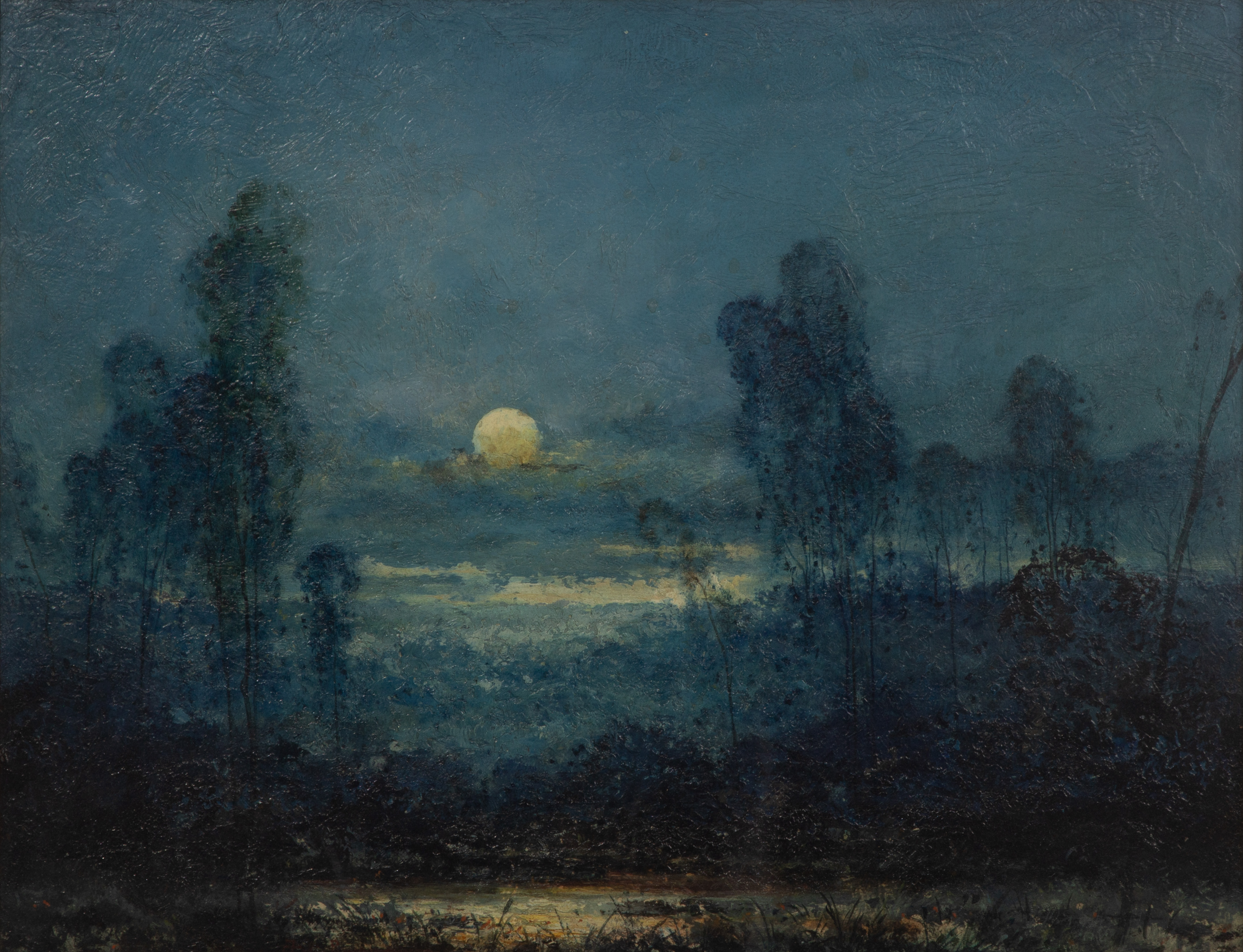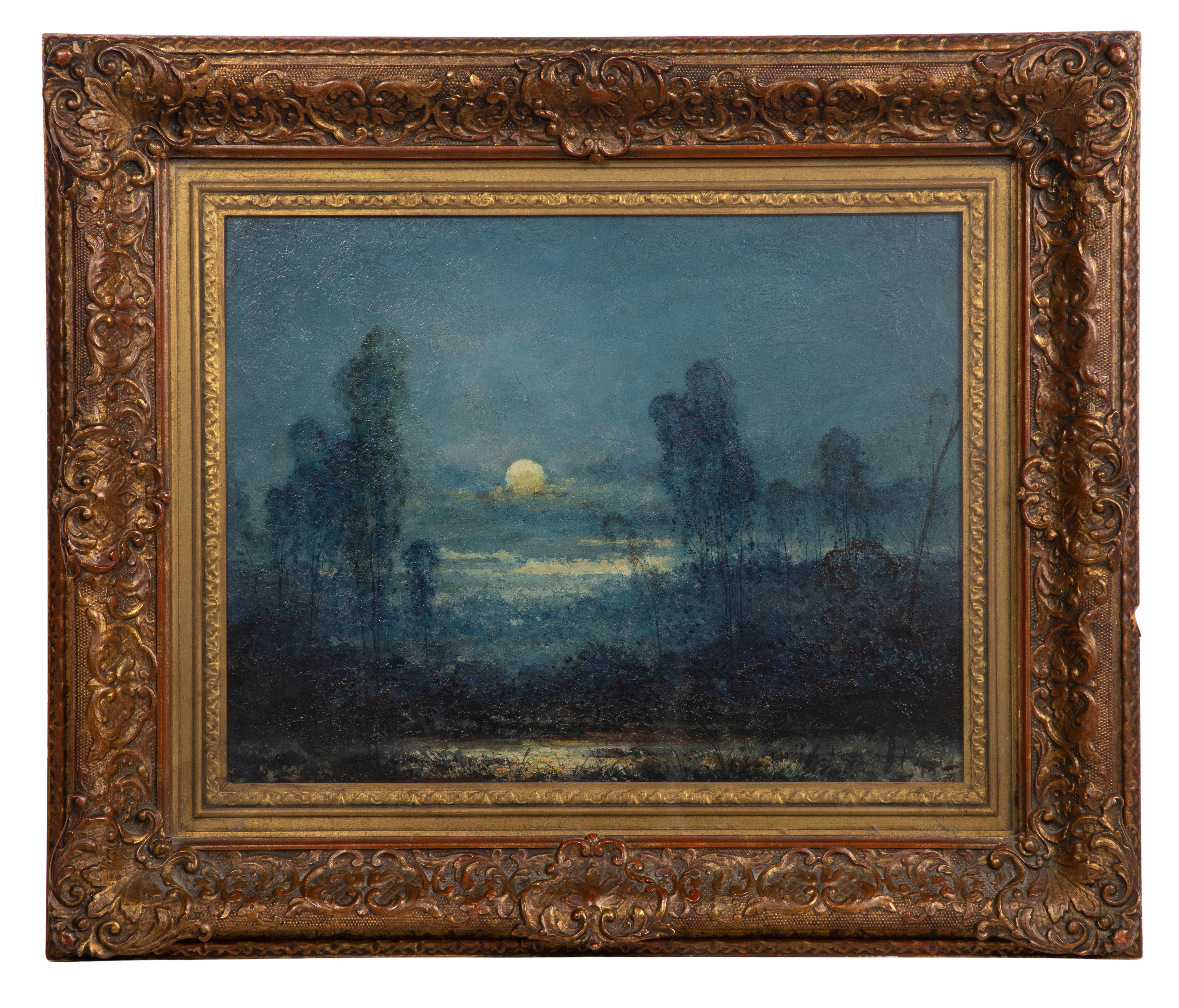 Undated, indistinctly signed, ink signed ‘Felix’ on a partial label verso, depicting a moonlit landscape, behind glass in a bronze-tone gesso on carved wood frame having a label reading ‘Felix died Oct 28 1962’
