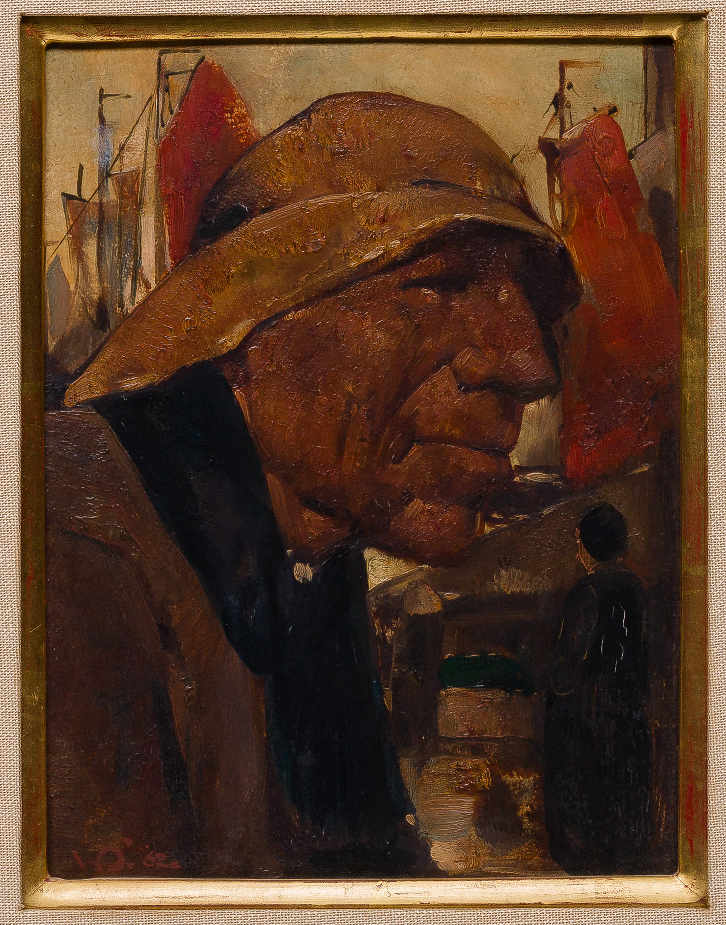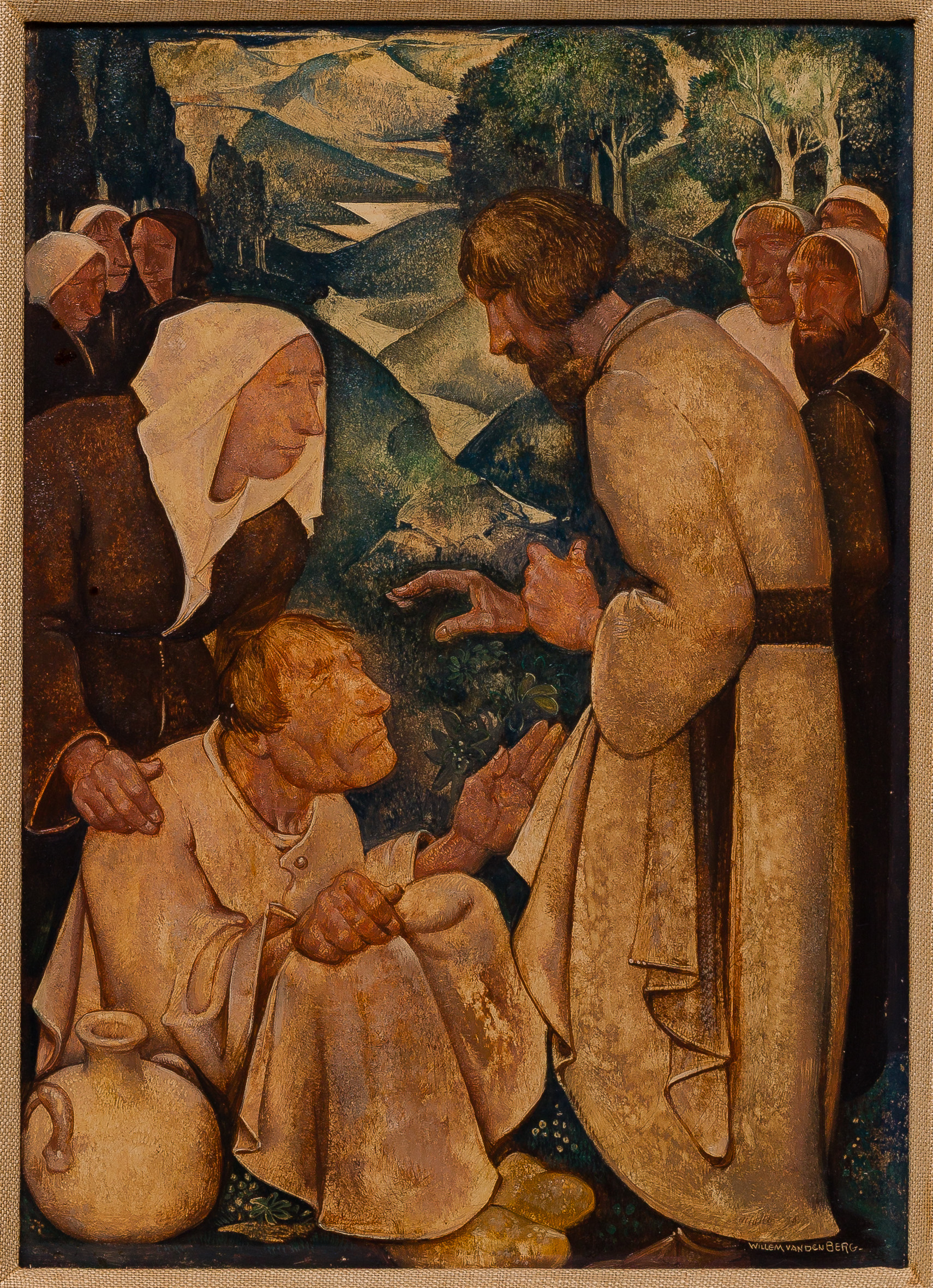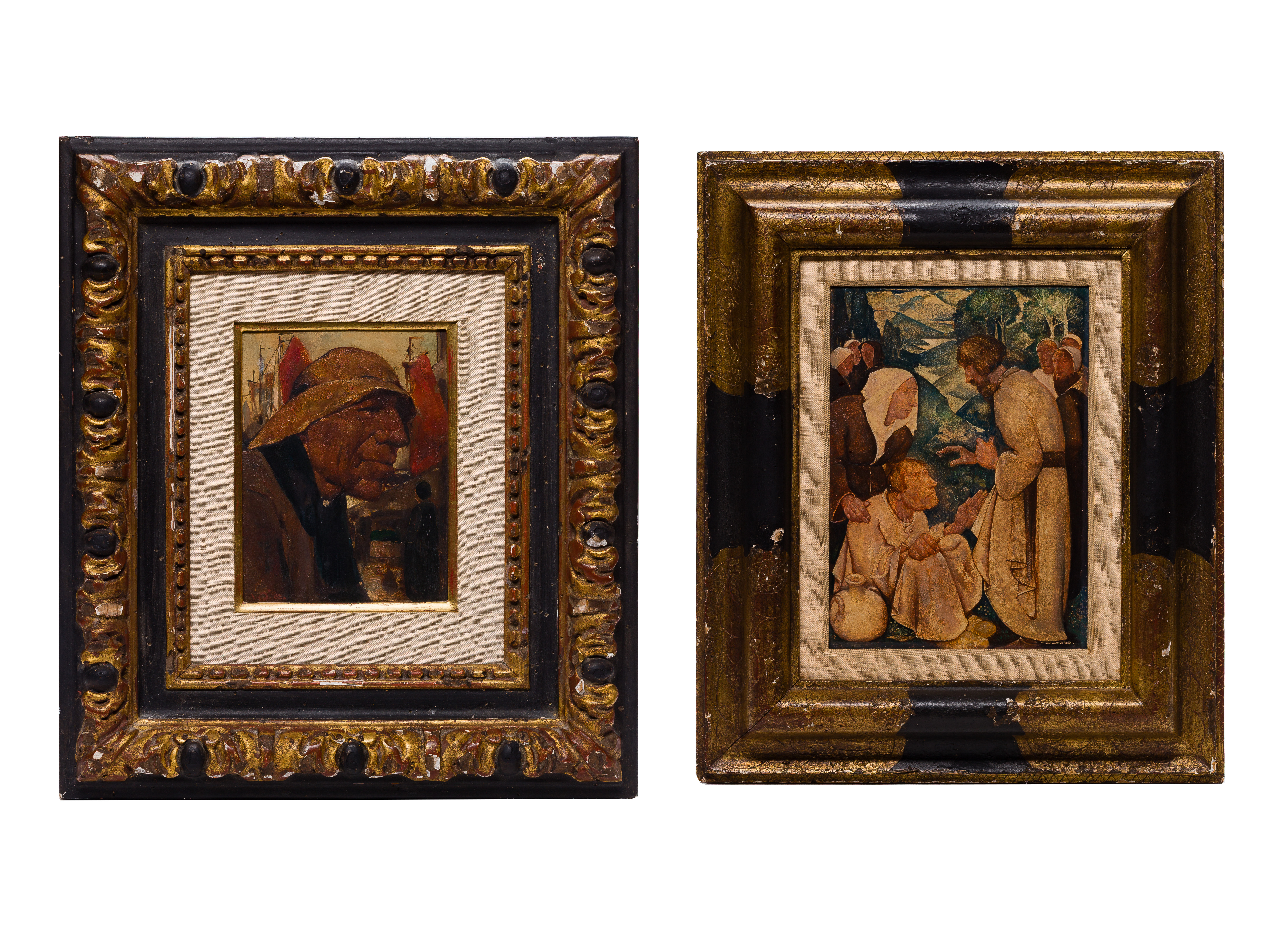 (2) items including a signed ‘Genezing Van Den Blinde’ depiction of Christ healing a blind man, in a painted gesso on wood frame, the backing cut away to show annotation verso giving artist, title and ‘Rijksakademie Van Beeldene Kunster / Amsterdam’ as well as a portrait of a sailor, having an indistinct signature / cypher lower left, ‘WVB’ verso, in a linen lined painted gesso on carved wood frame
