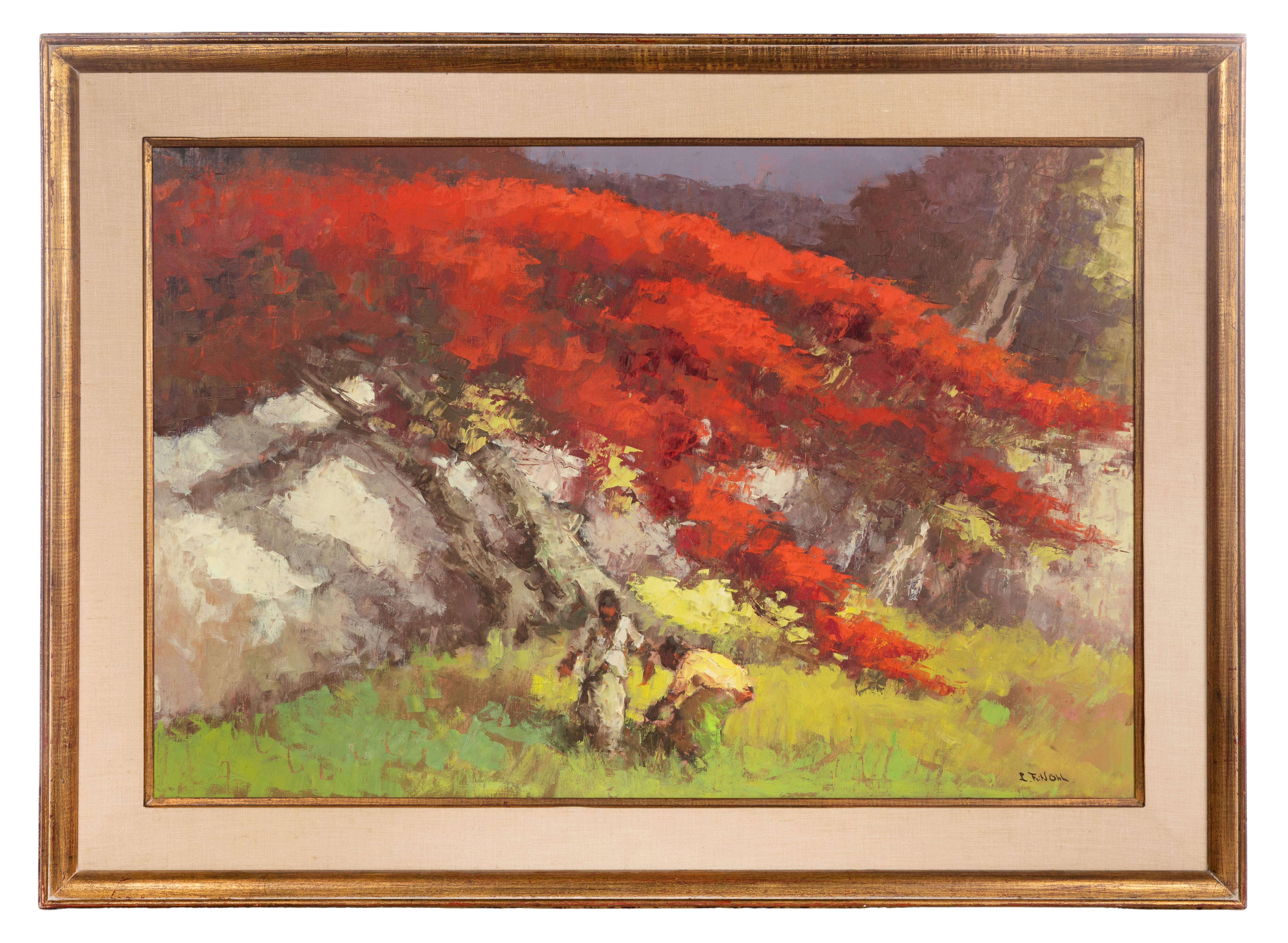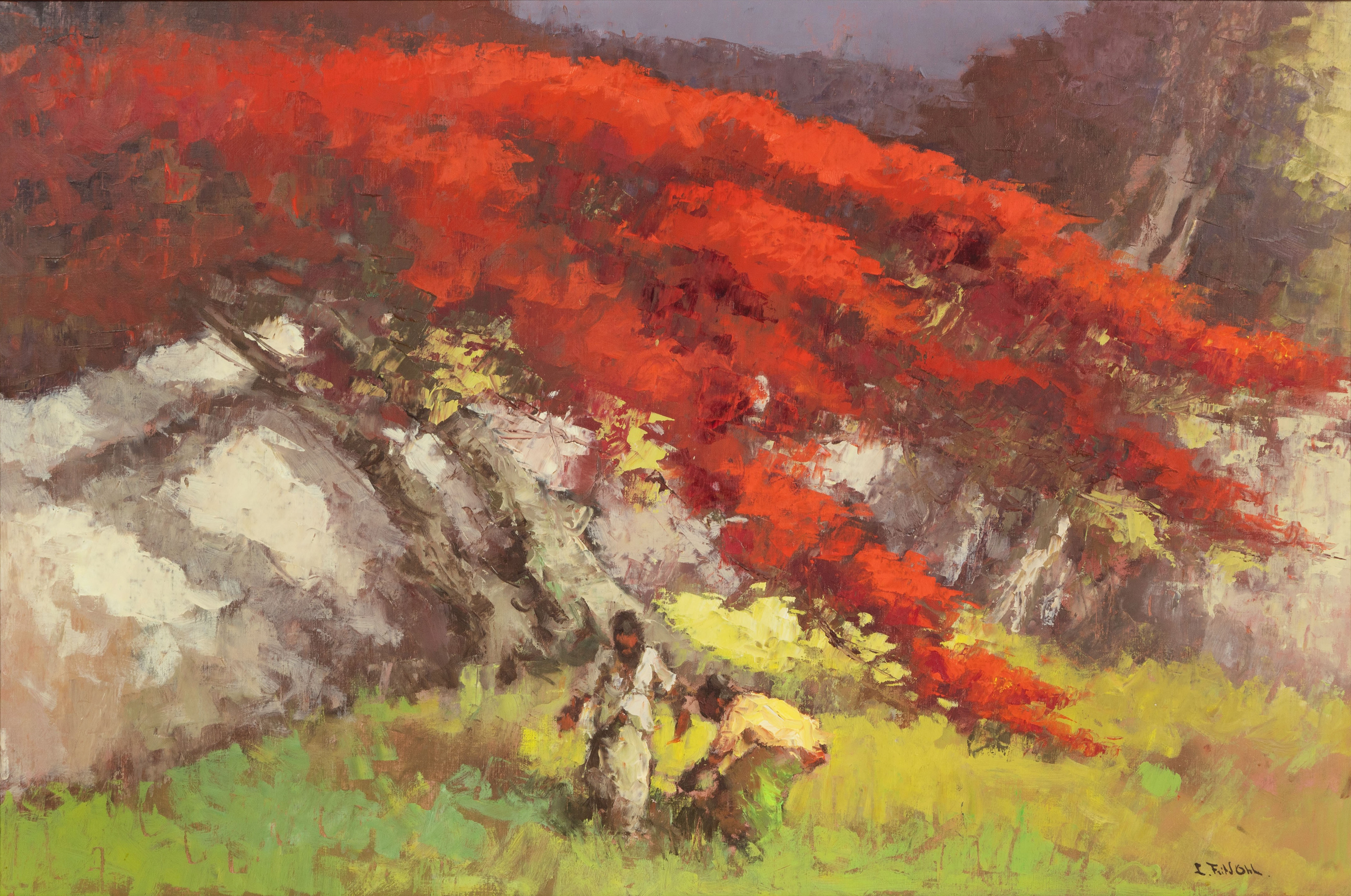 Undated, signed depiction of a blooming red tree having figures working below, matted in a gold-tone painted tray frame