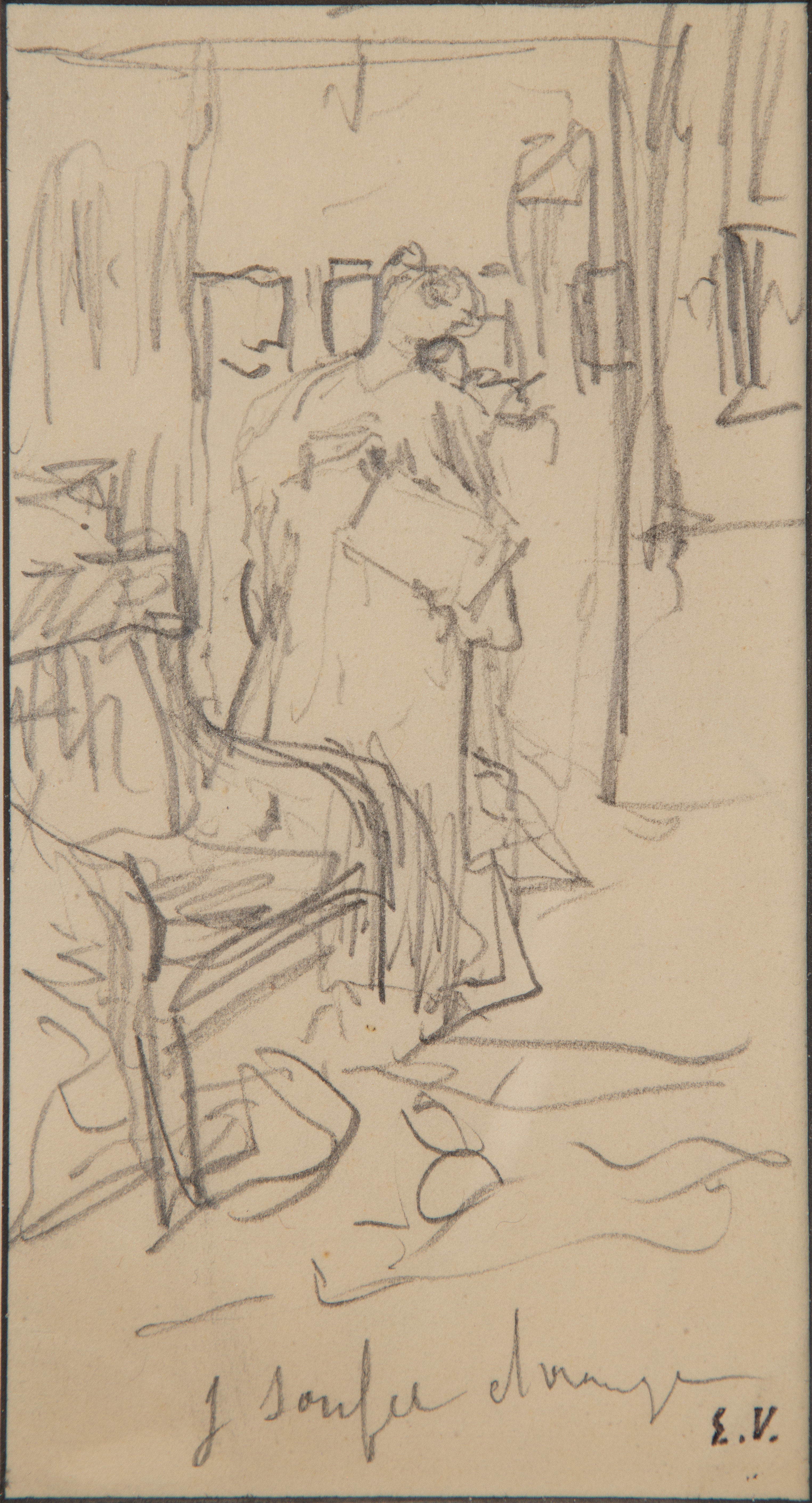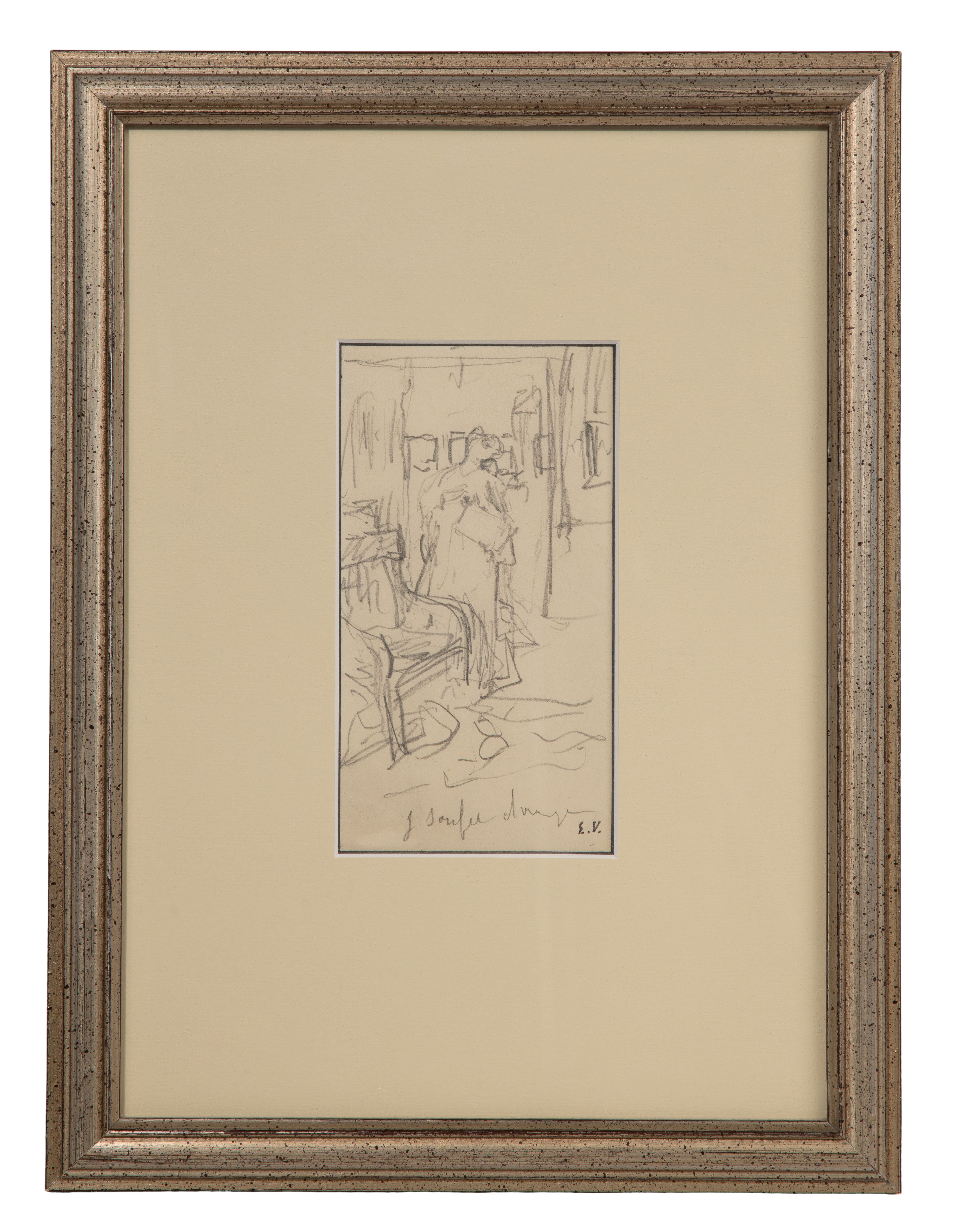 Undated, initialed ‘E.V.’ lower right, depicting a woman standing beside a chair, matted behind glass in a silver-tone wood frame having a Maxwell Davidson Gallery, New York label, a 1987 Museum of Contemporary Art, Chicago 8th Benefit Auction label verso