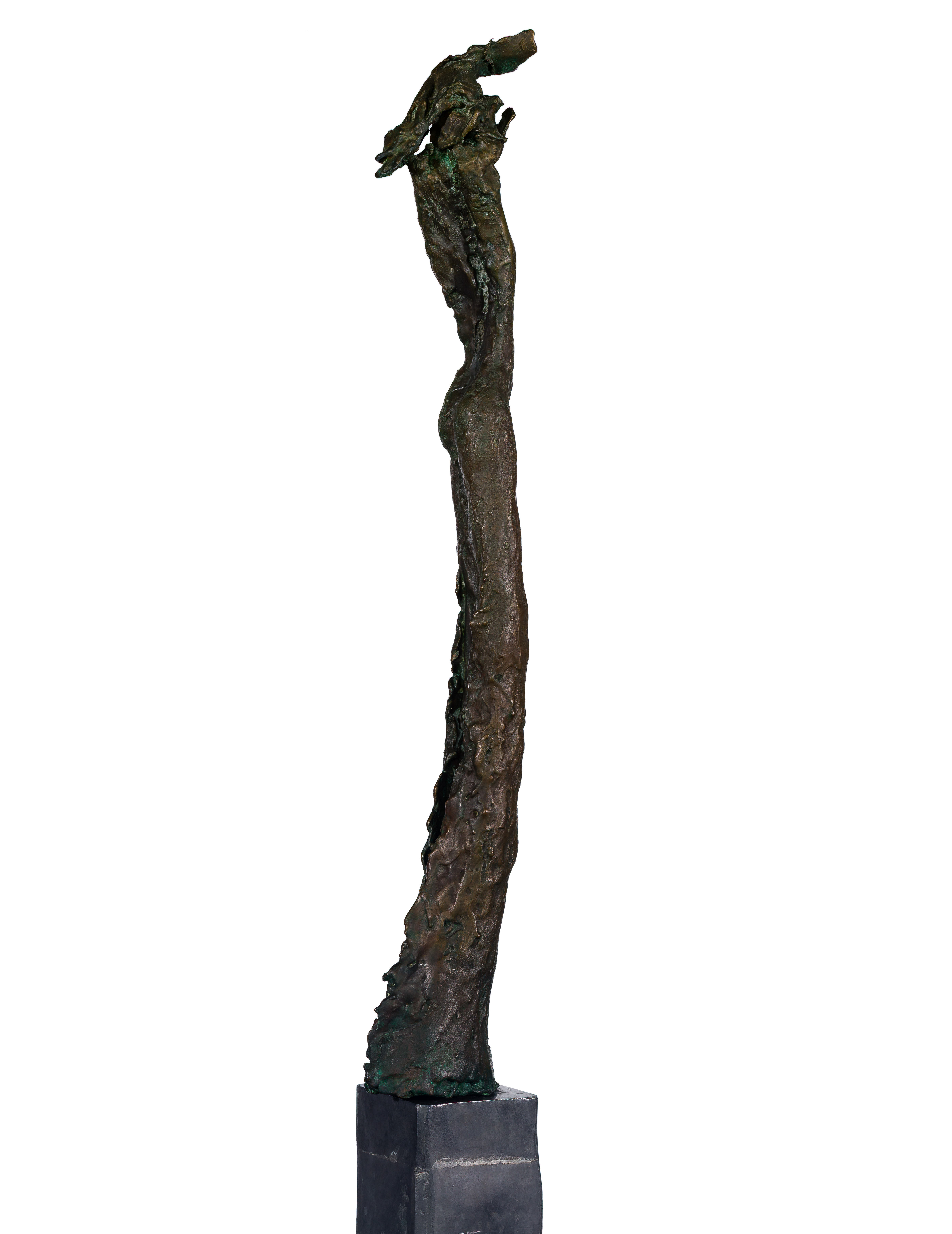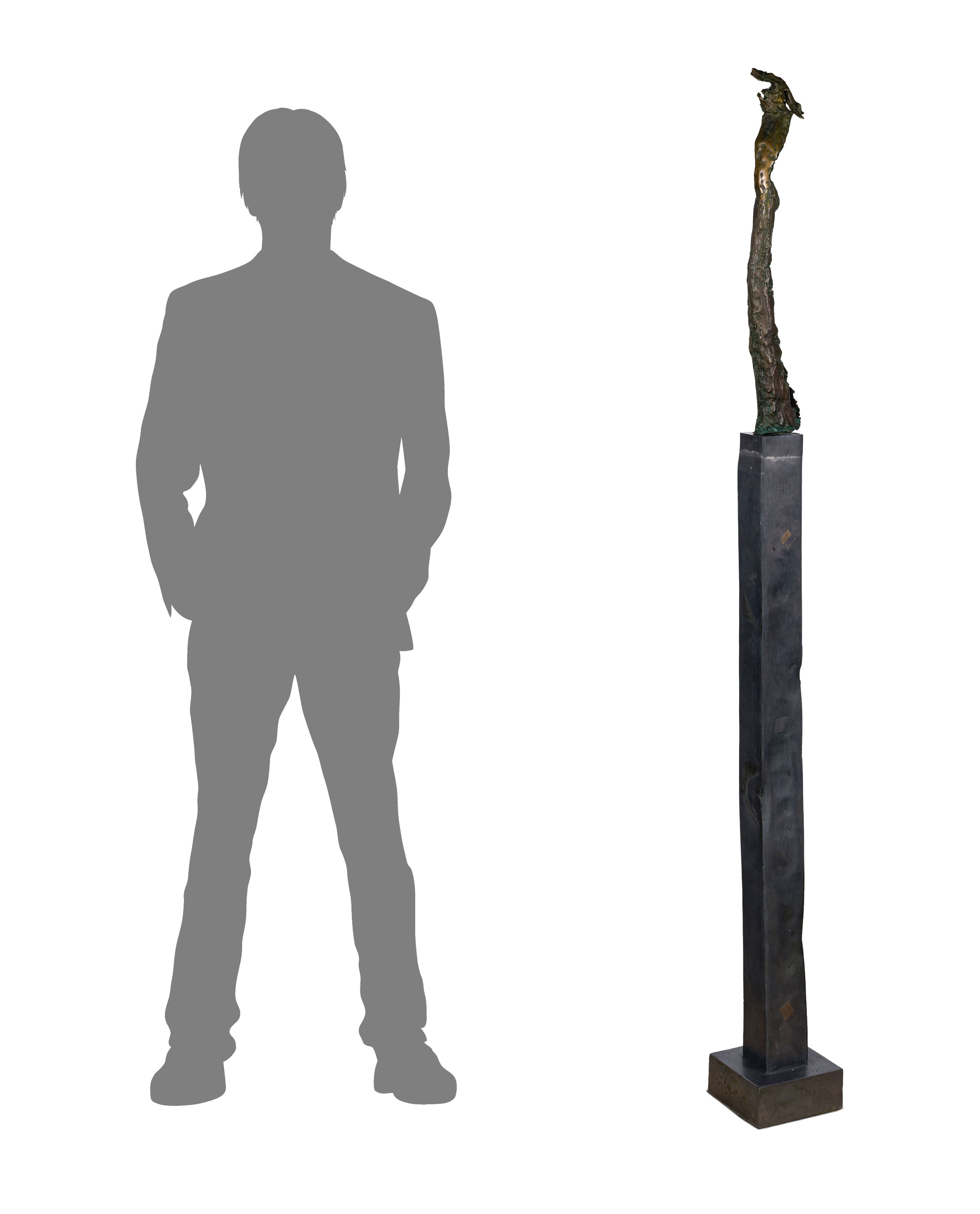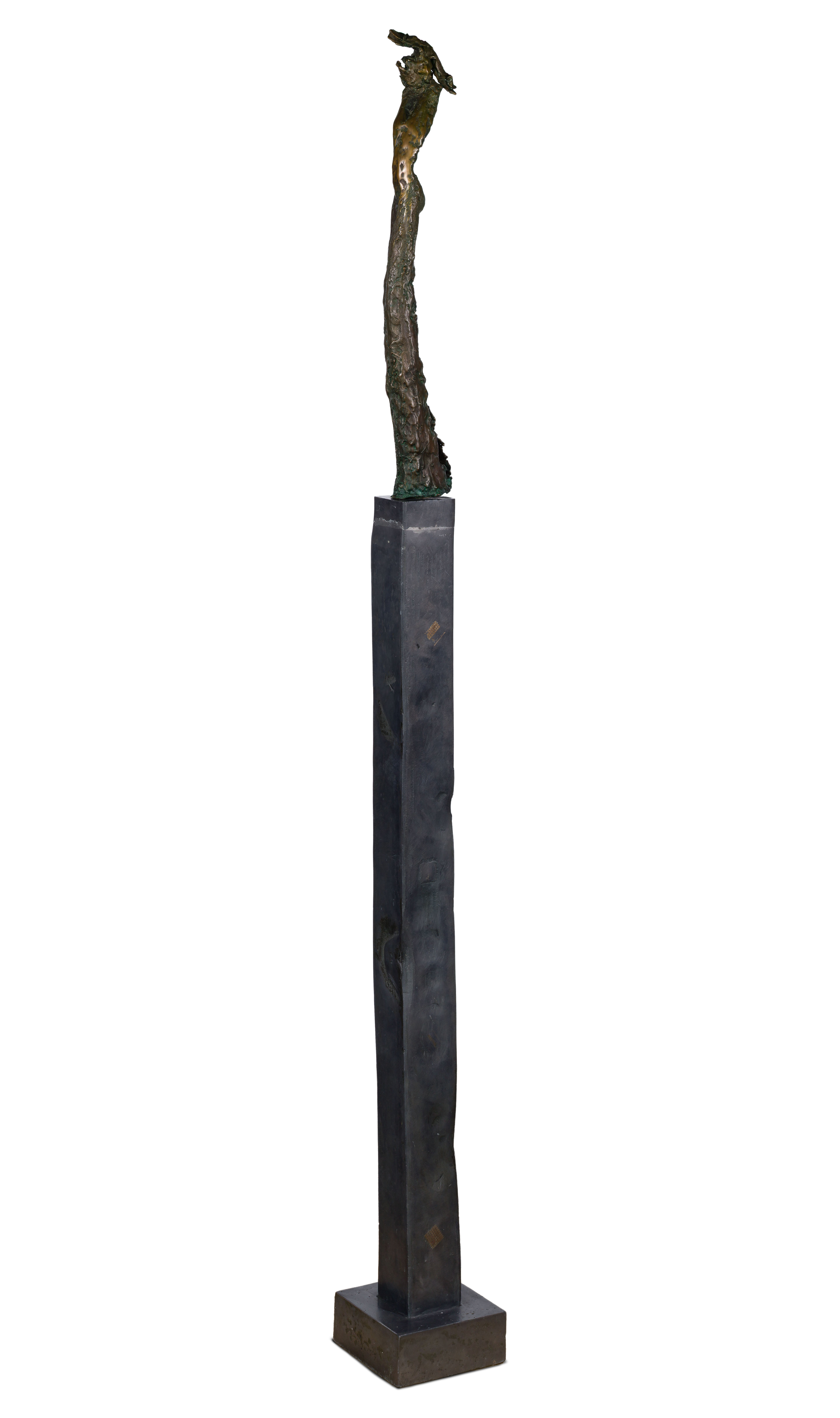 Undated, unsigned, elongated abstract figural bronze sculpture having a peg underside which sets into a steel pedestal base