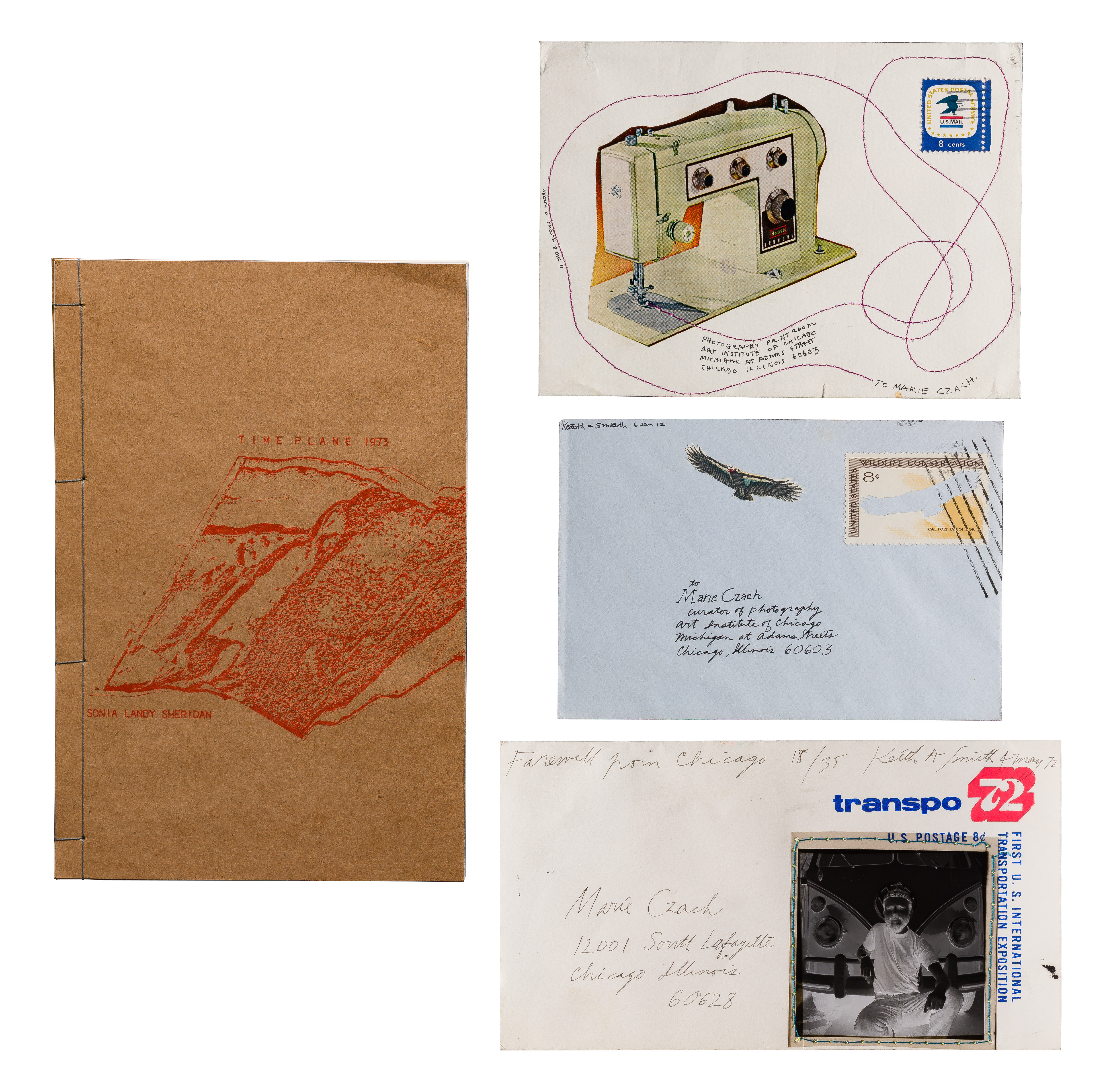 (6) total items including (2) mounted images, pencil signed and dated ‘1968’ on mats; together with an Asian style accordion-fold booklet reproducing photostatic artwork by Sonia Sheridan and (3) pieces of 1970s mail art by Keith A Smith