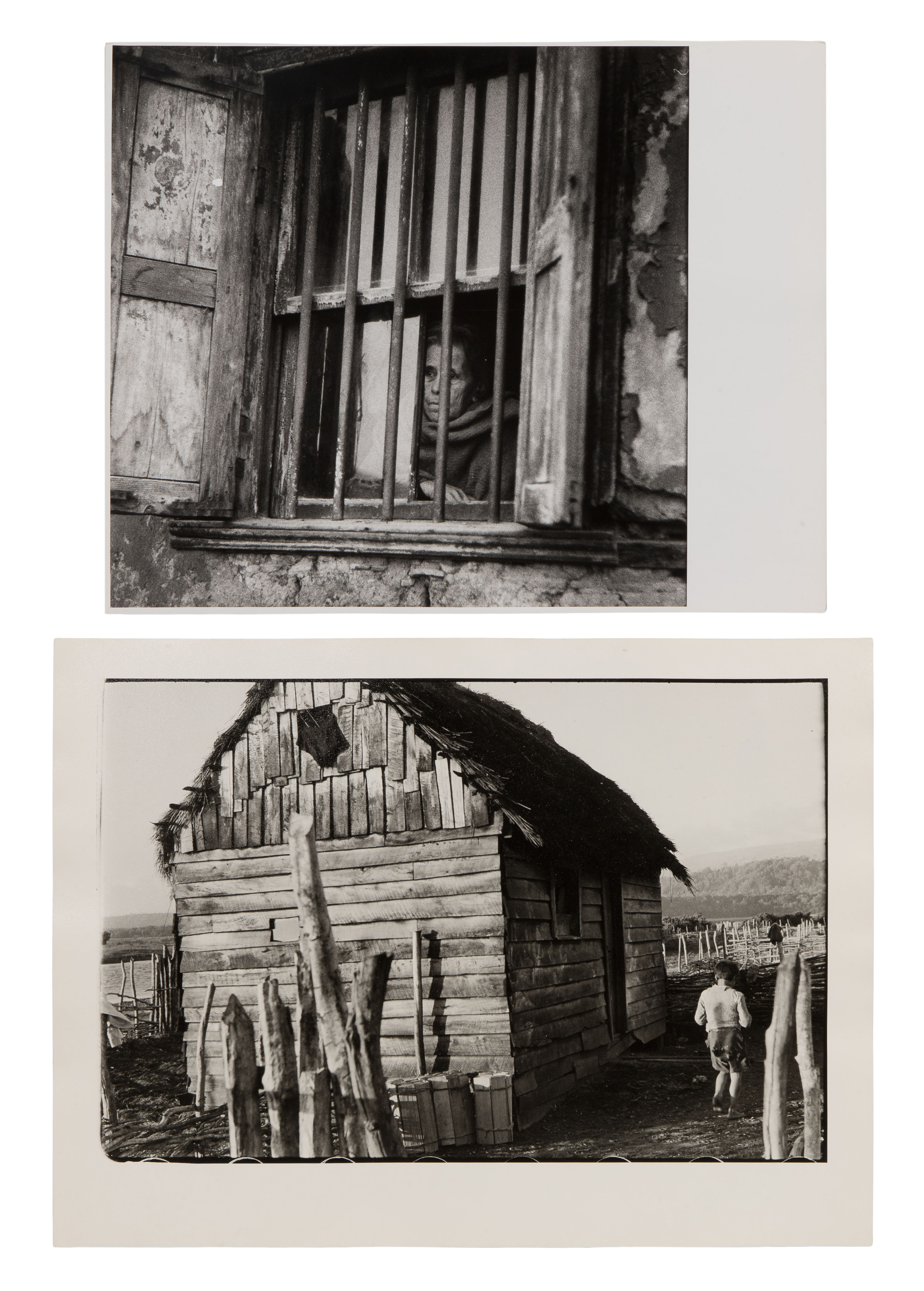(2) items including a 1957 black and white photograph of a young boy near a shack and a 1963 black and white photograph of a woman looking out a barred window, stamped and dated verso, also marked Magnum
