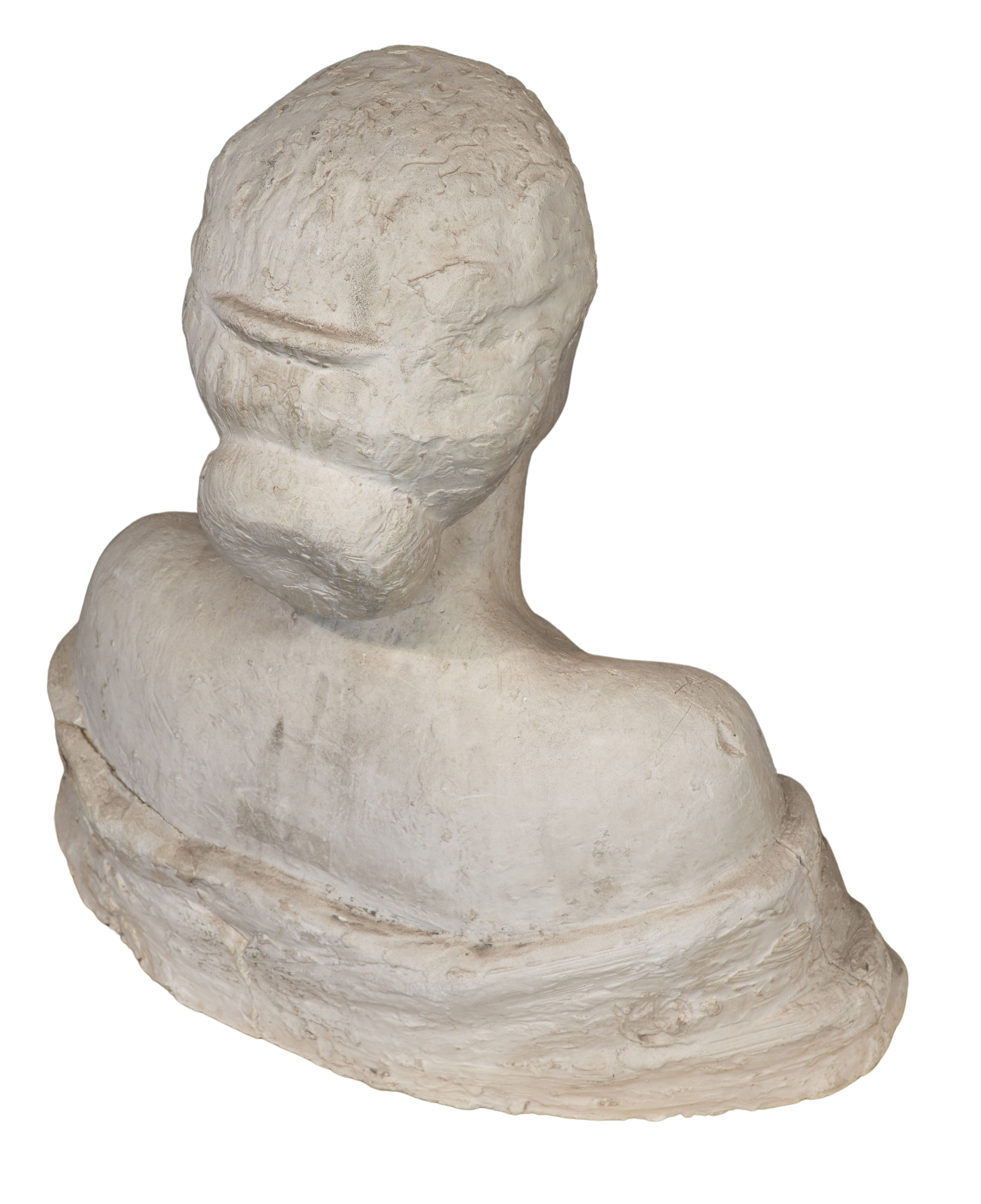 chips, cracks running along shoulders, piece of dress ornament broken off / missing, repairs on base back, color transfer marks on face