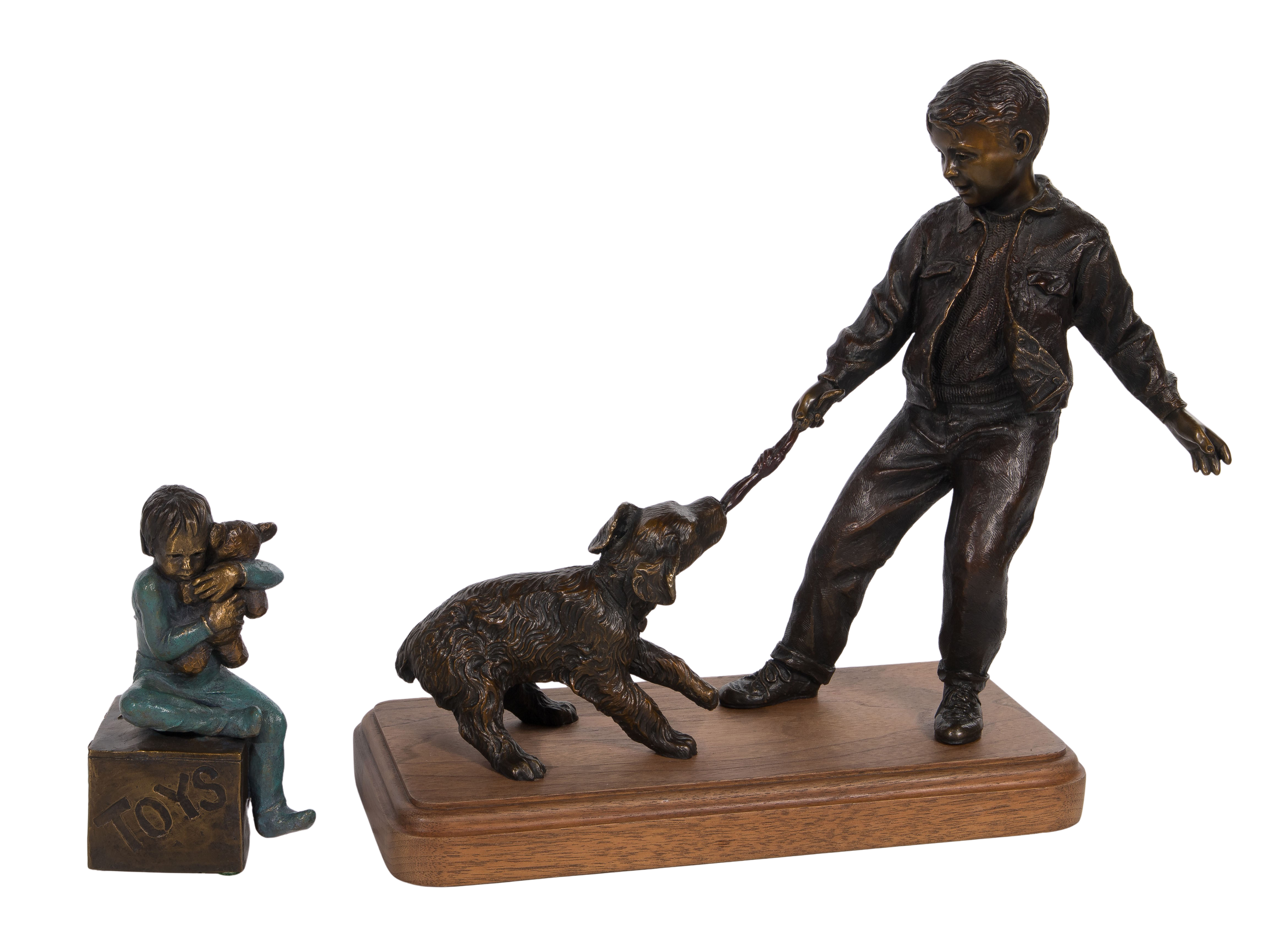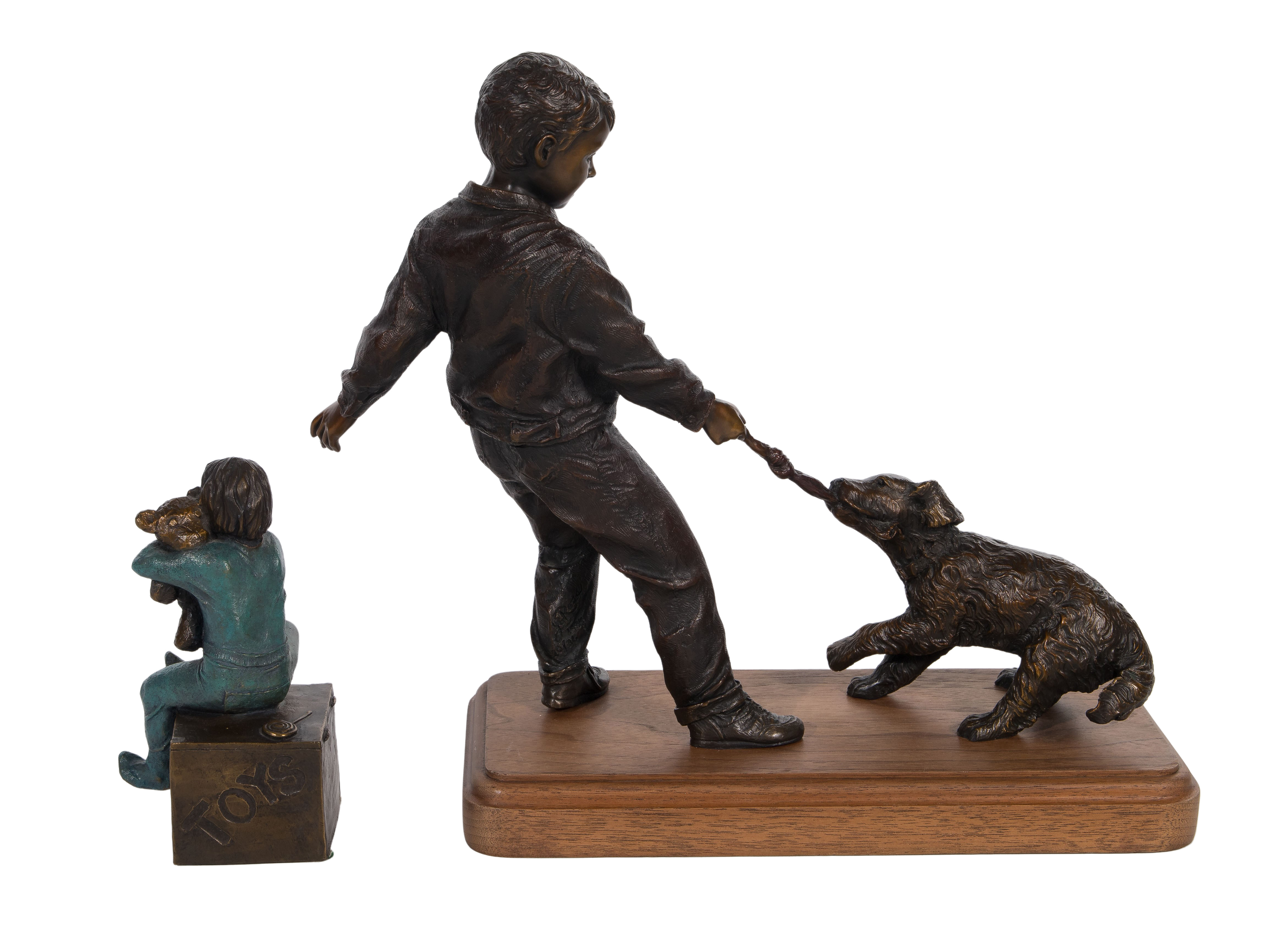 (2) sculptures depicting children including a 1994 boy and his companion on a wood plinth, cast signed ‘La Rose’ and #20/31 as well as a 1995 cold painted child with their teddy bear, cast signed ‘Lundeen’