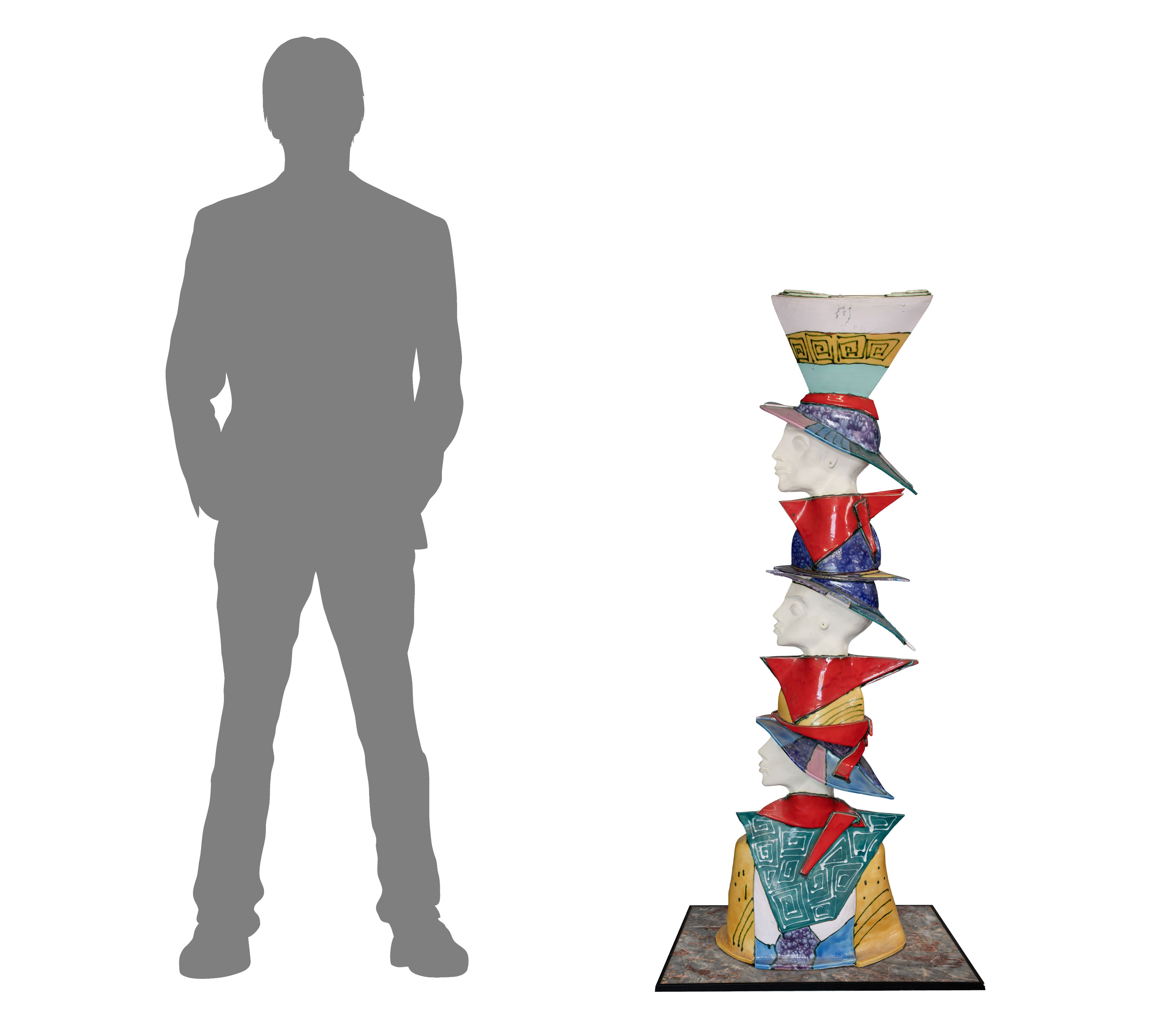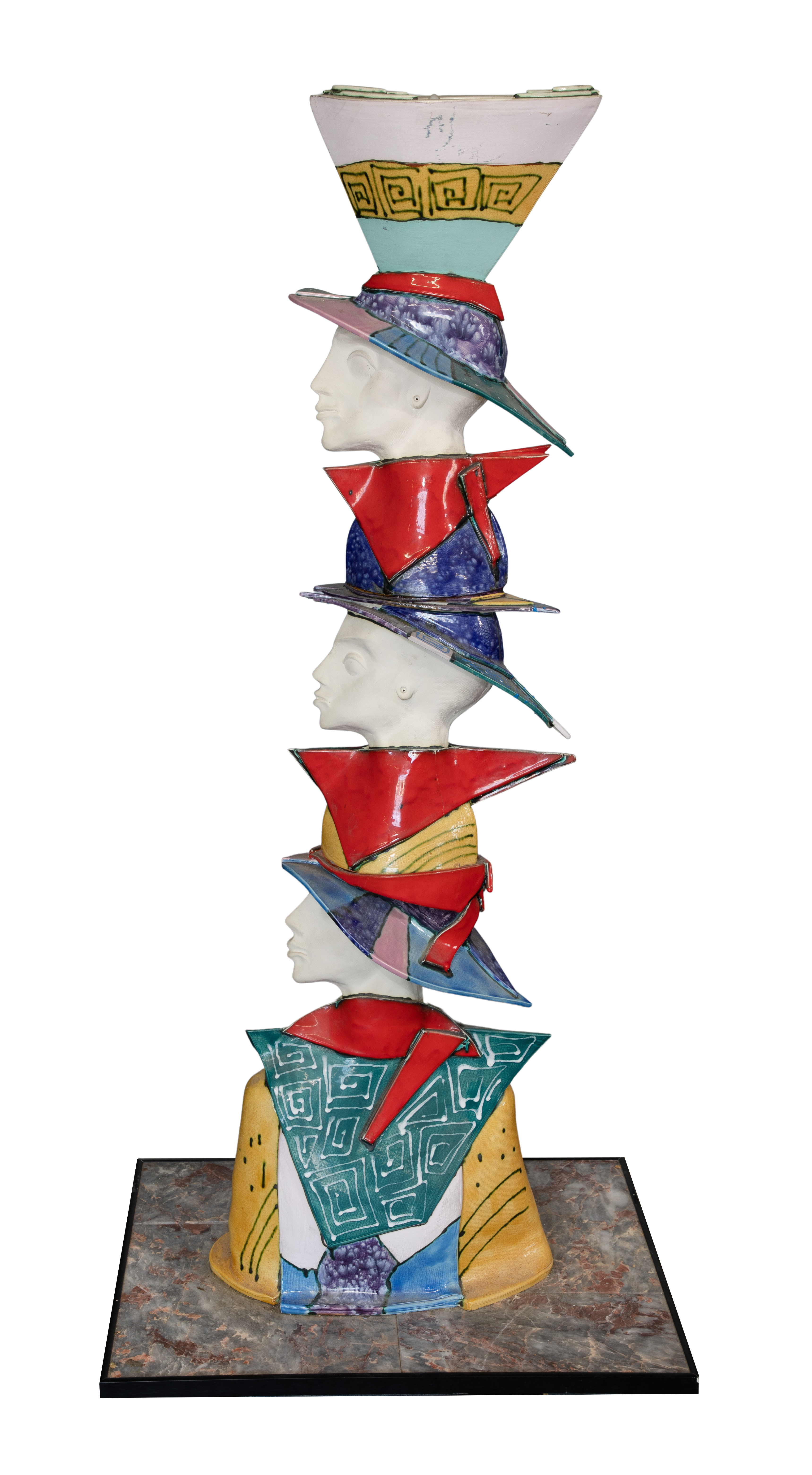 1991, signed 3-dimensional sculpture depicting a figures wearing hats, in-the-round visibility of both sides of the face and the back of head, set on a stone base, light at top