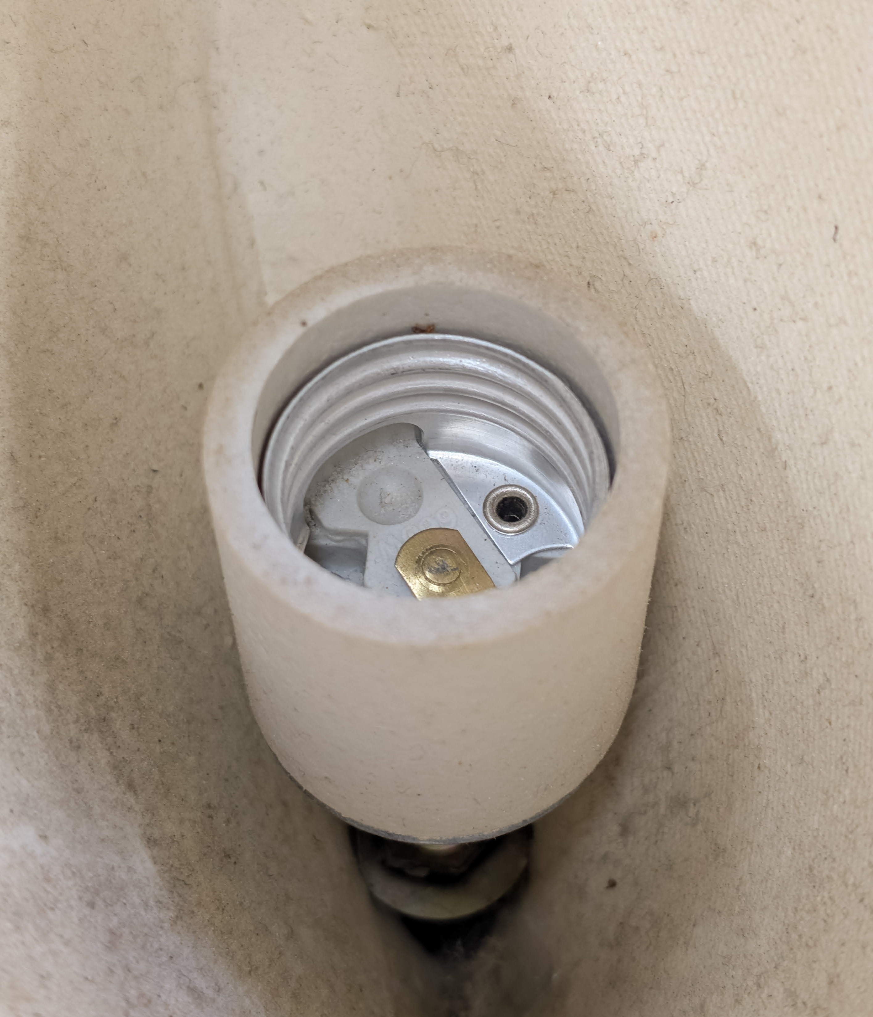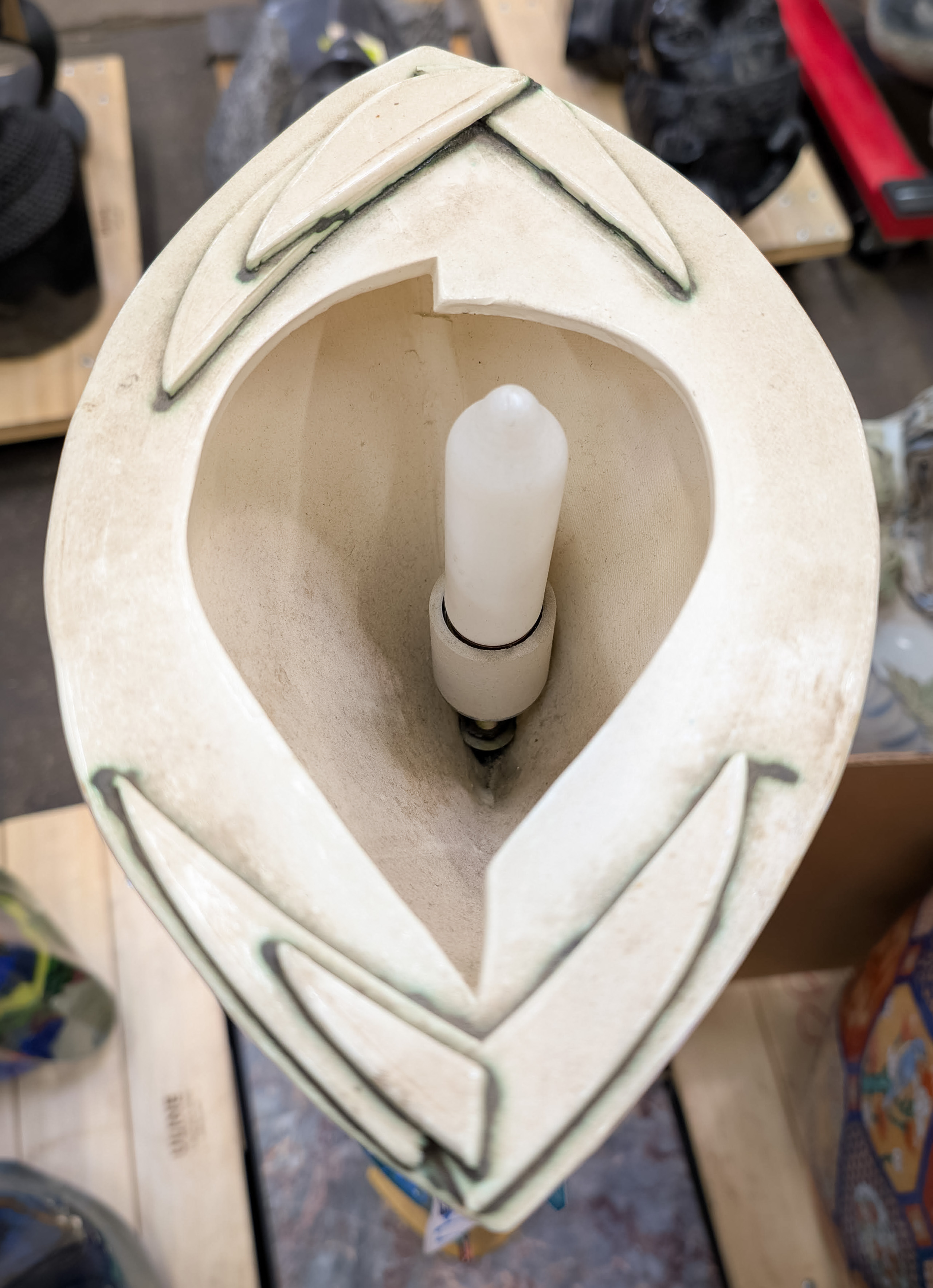 missing earrings, red scarf having crack, light dirt accumulation, base having crack, working when tested, not including light bulb