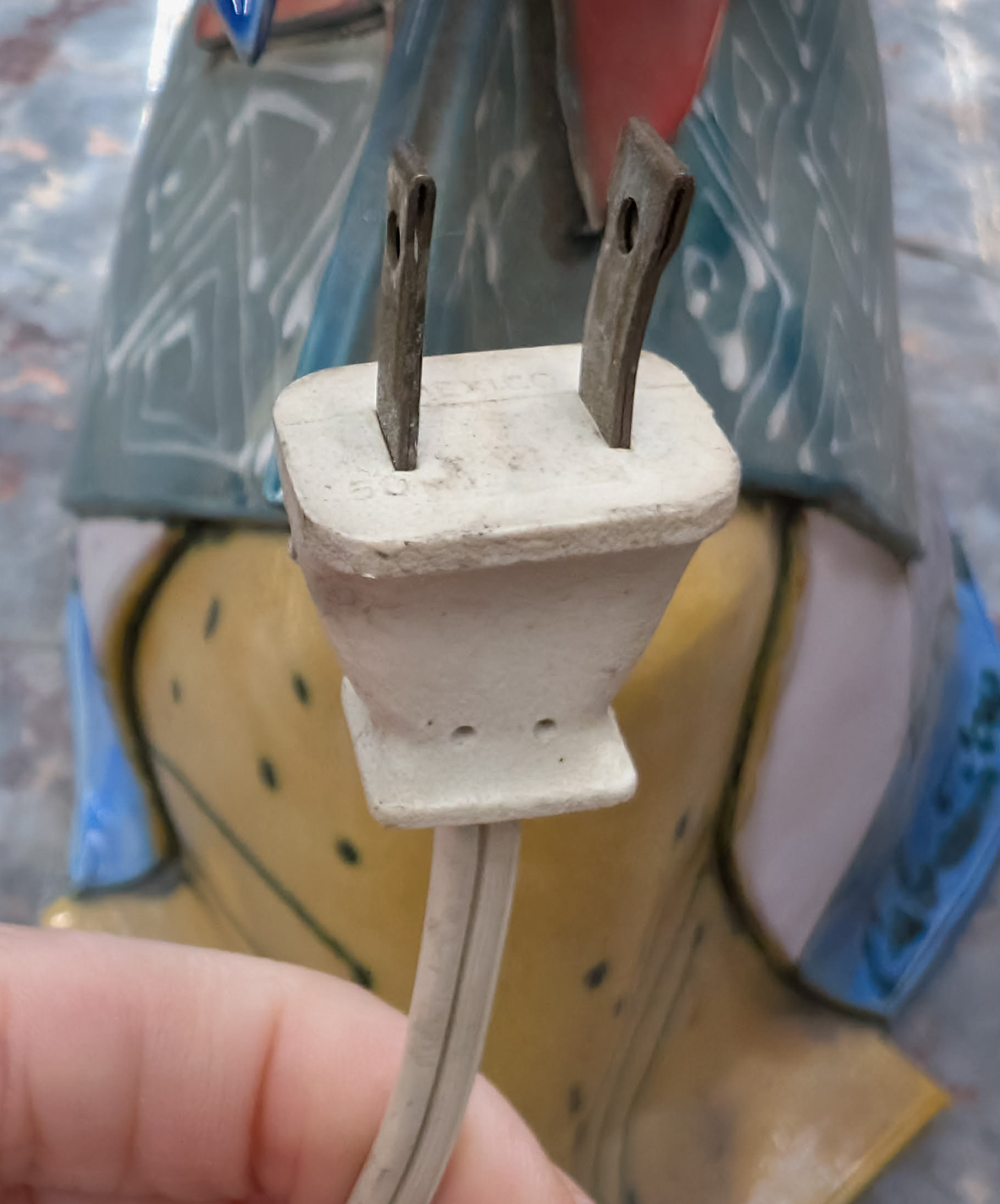 Condition: missing earrings, red scarf having crack, light dirt accumulation, base having crack, working when tested, not including light bulb