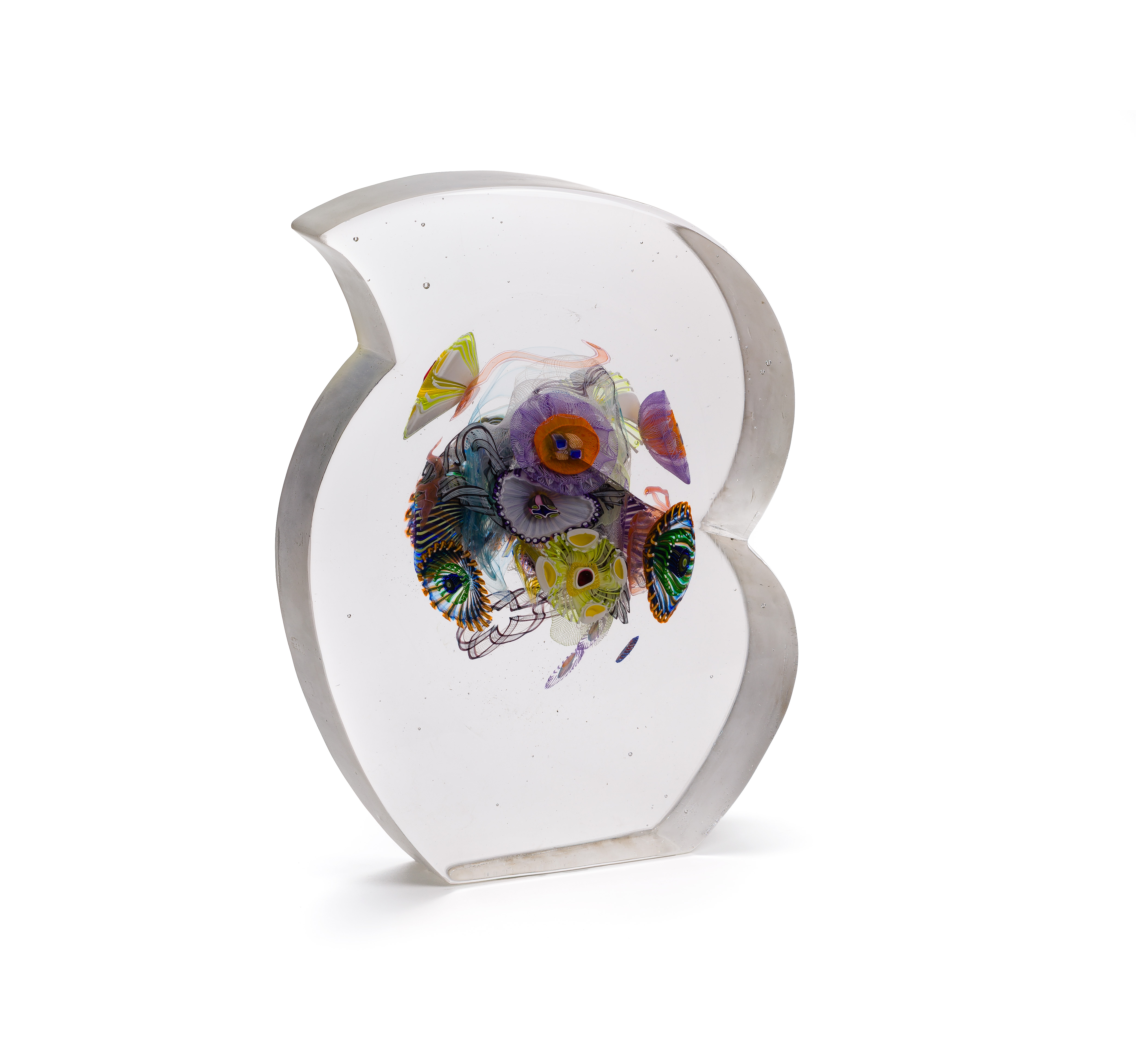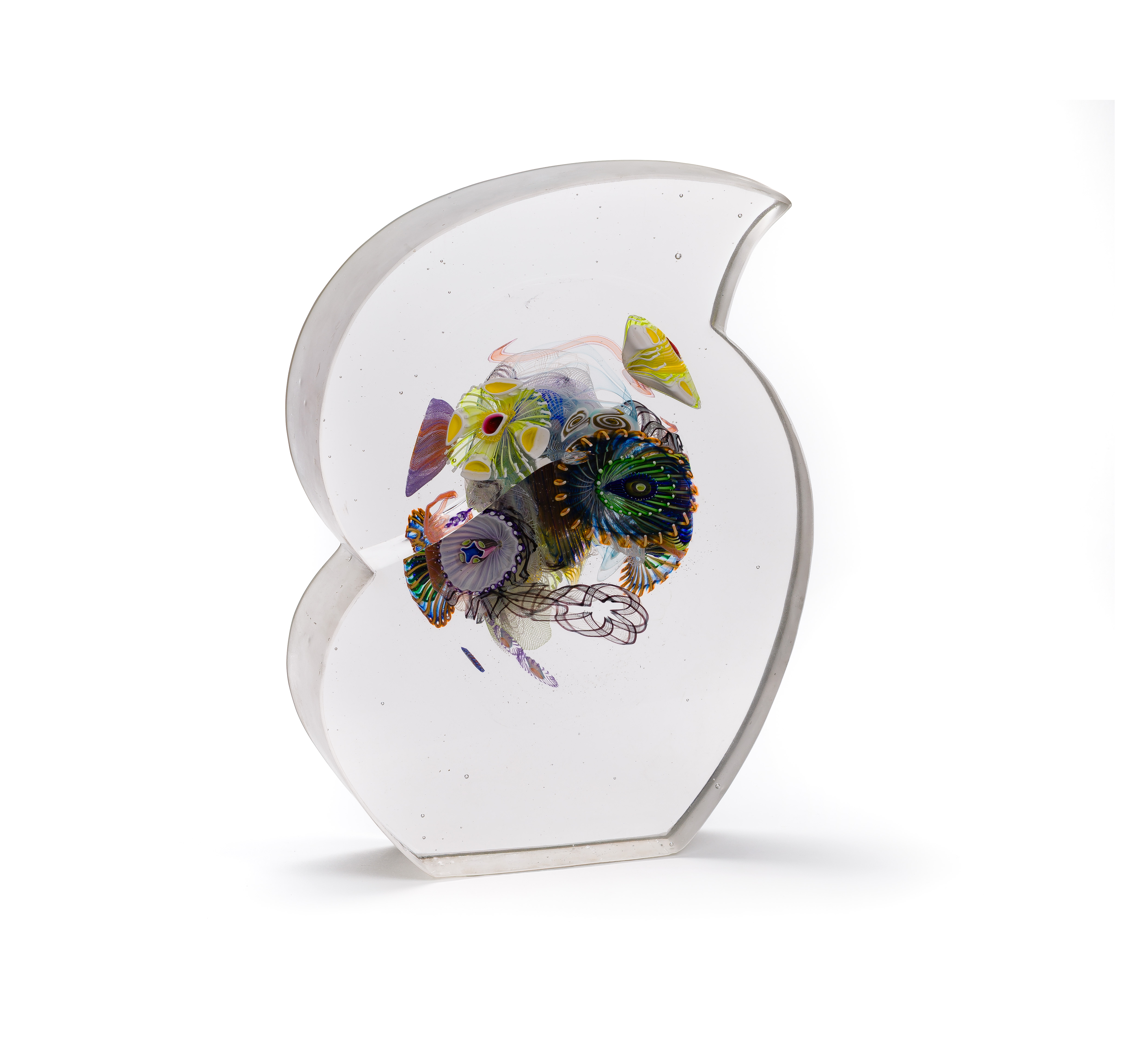 Having solid colorless crystal case in an organic form and a sculptural interior of various canes