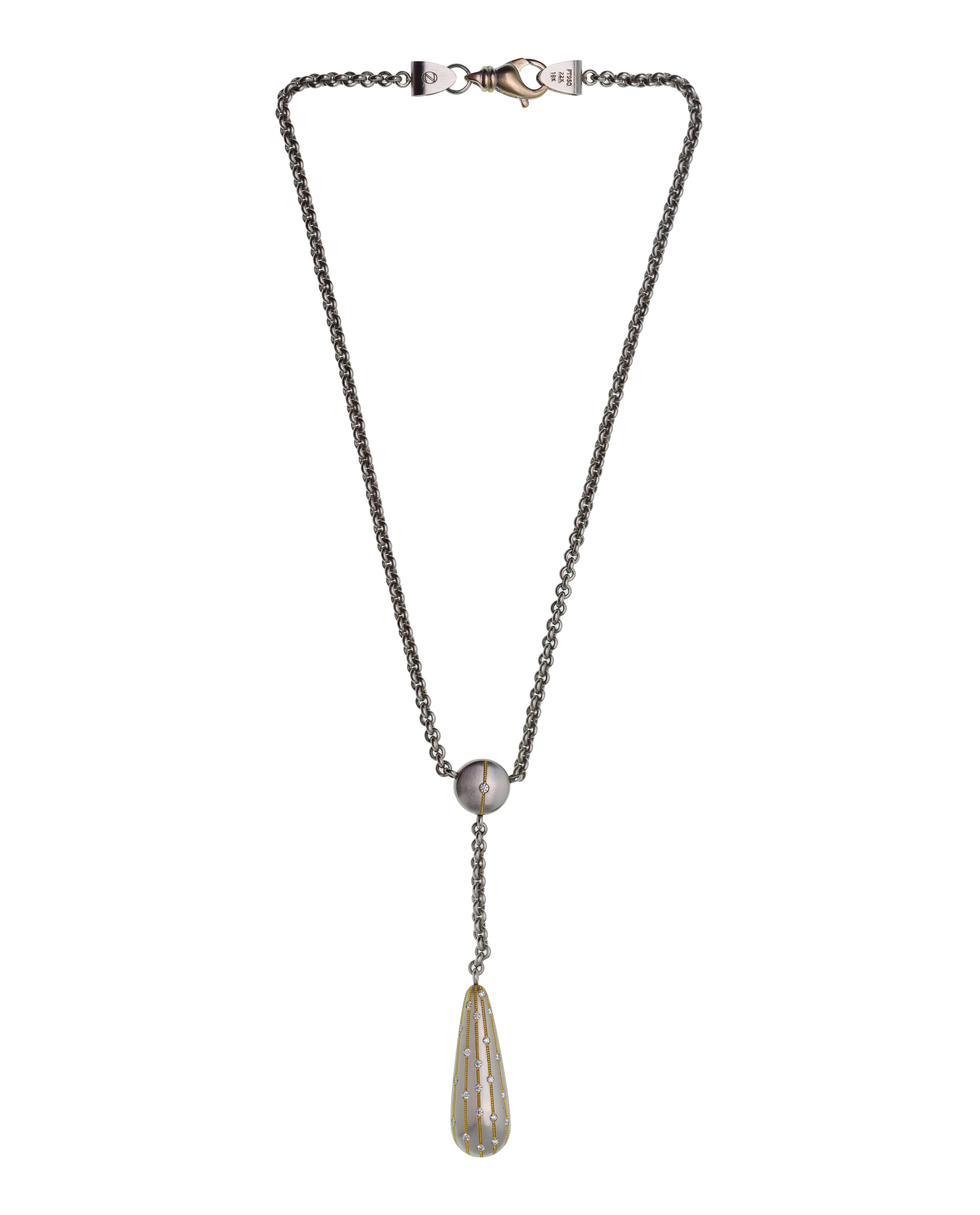 Having a reversible elongated tear drop accented with diamonds, dropping from a choker style chain necklace (marked ‘PT950′, ’22k’ and ’18k’ near clasp)
